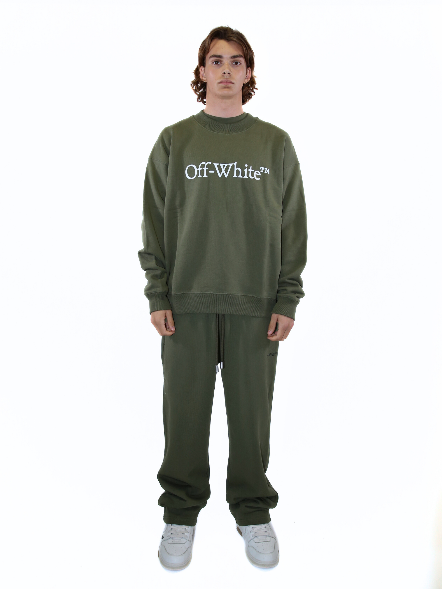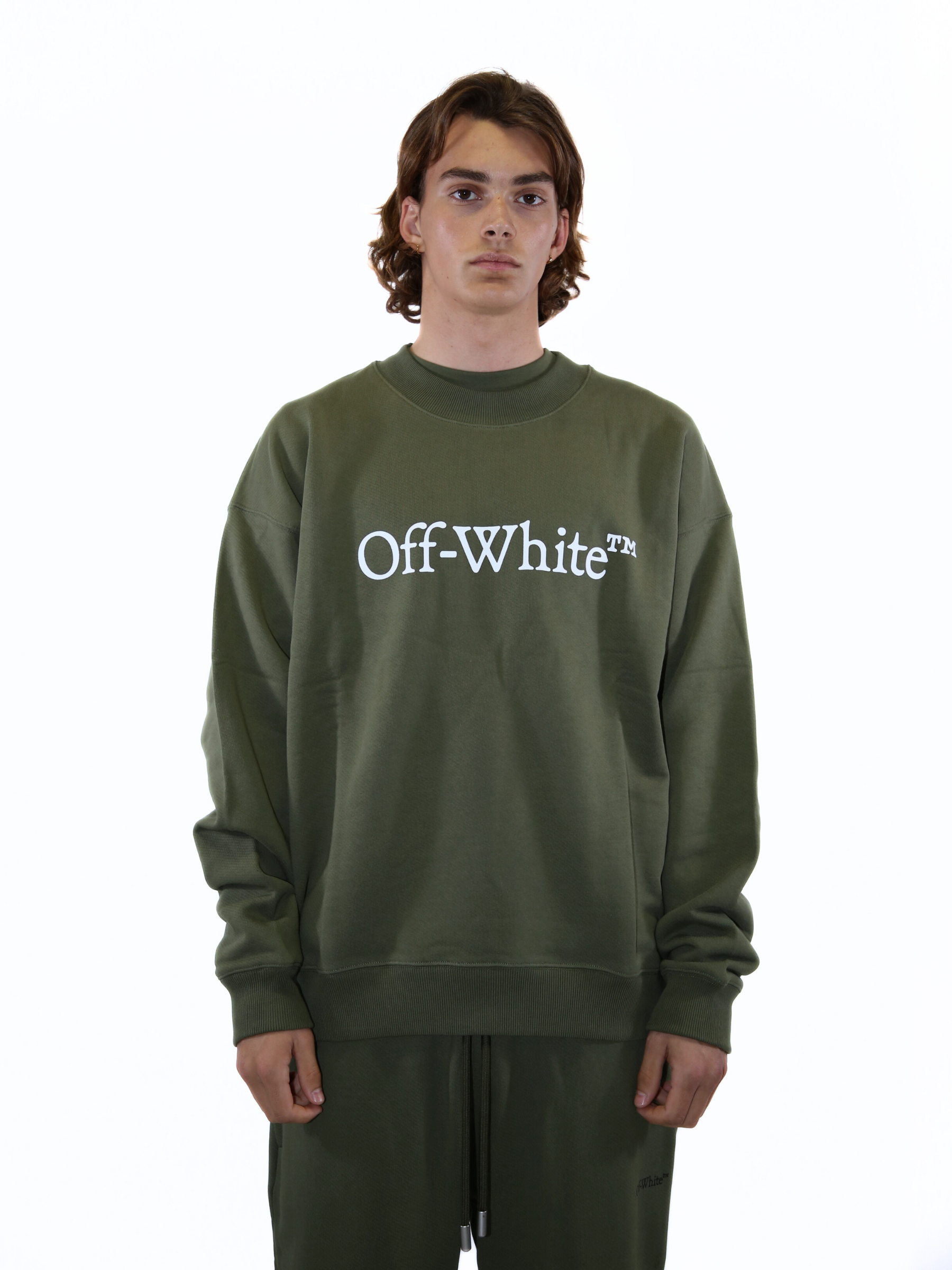 Military green Off-White sweatshirt, crafted from high-quality cotton. It features a ribbed crew neck, hem, and cuffs, and a white "Off-White™" logo printed on the chest. A clean, contemporary piece, perfect for casual and refined streetwear looks.