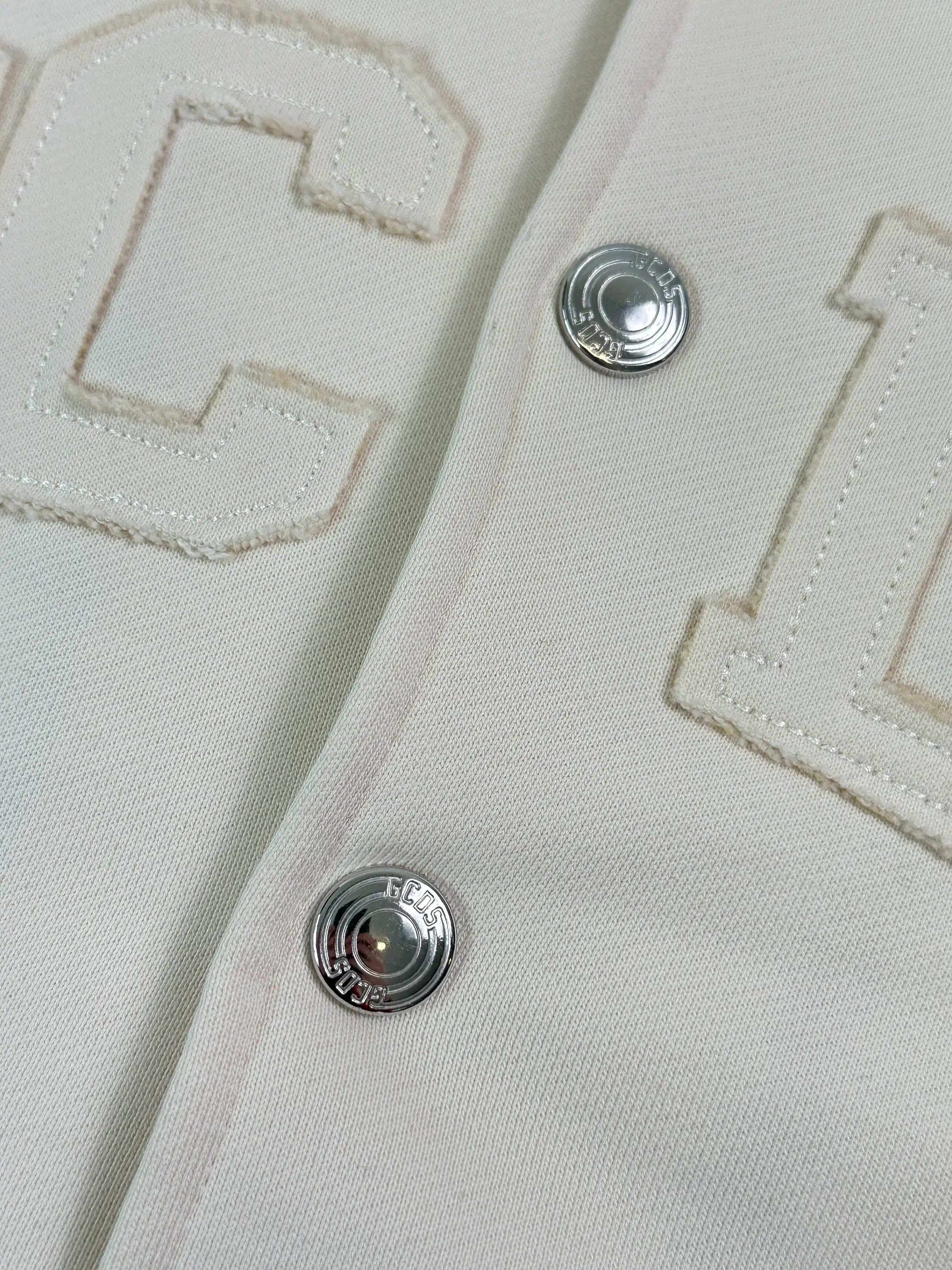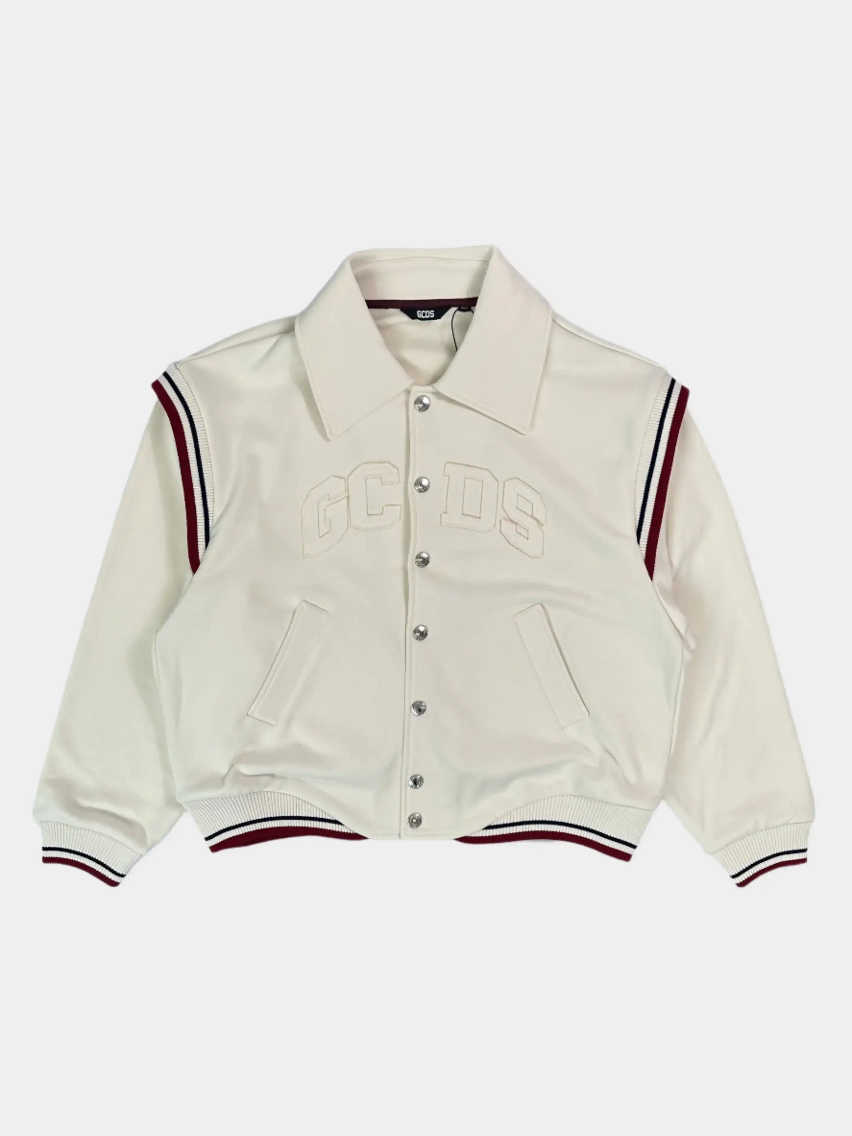 Add a touch of varsity style to your look with the GCDS jersey bomber jacket. Featuring a clean and sophisticated design, this cream bomber jacket features tonal GCDS logo embroidery, metal snap buttons, and ribbed trims with contrasting stripes. Perfect for those looking for a casual yet statement piece.