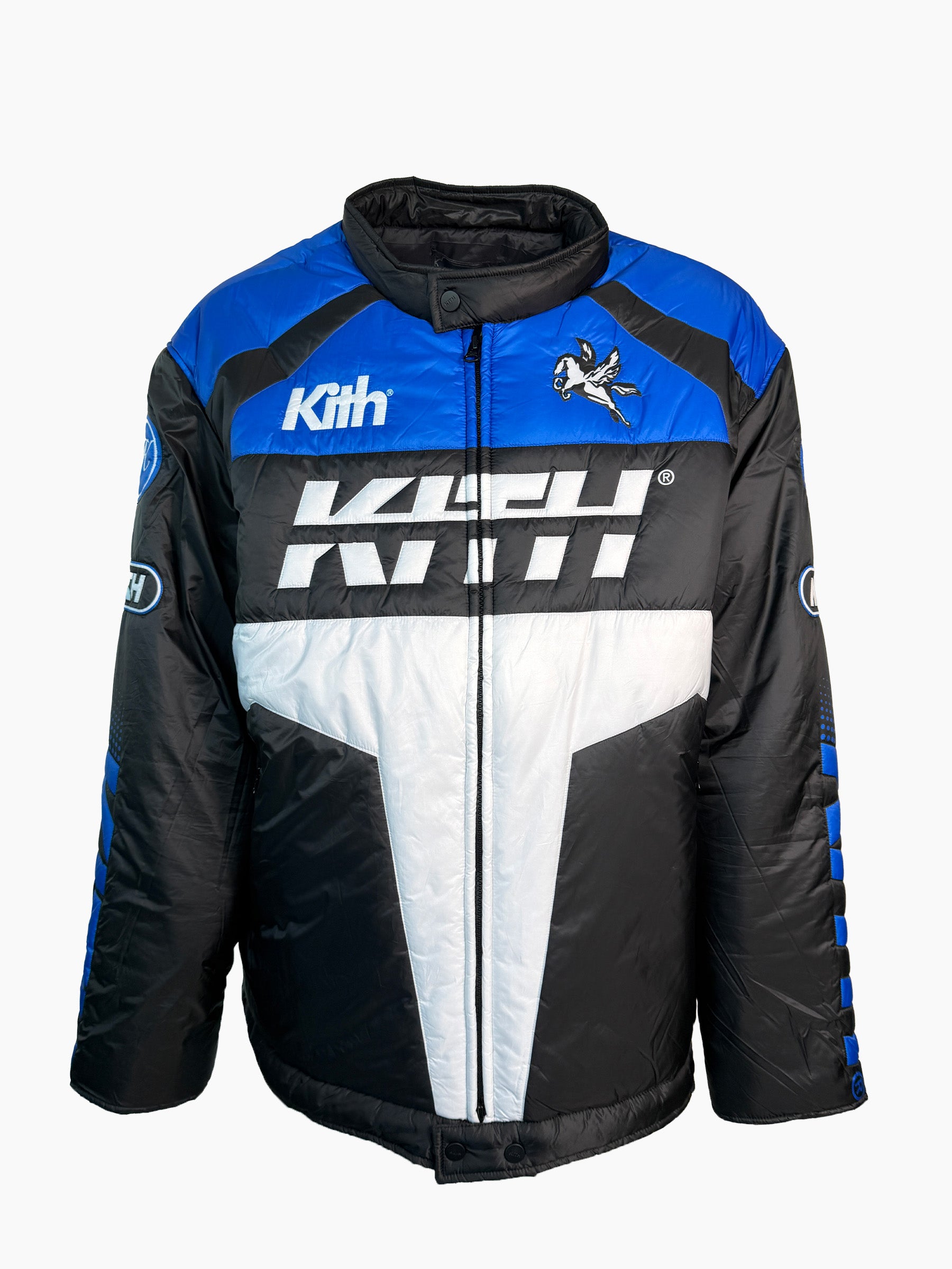 Kith padded jacket with a sporty and contemporary look, featuring a color-block design in shades of blue, black, and white. The model features a large Kith logo on the front, a Pegasus patch on the chest, a zip closure, and side pockets with heat-sealed zips. The lightweight yet warm construction makes it ideal for the cold season, maintaining a bold and recognizable streetwear aesthetic.