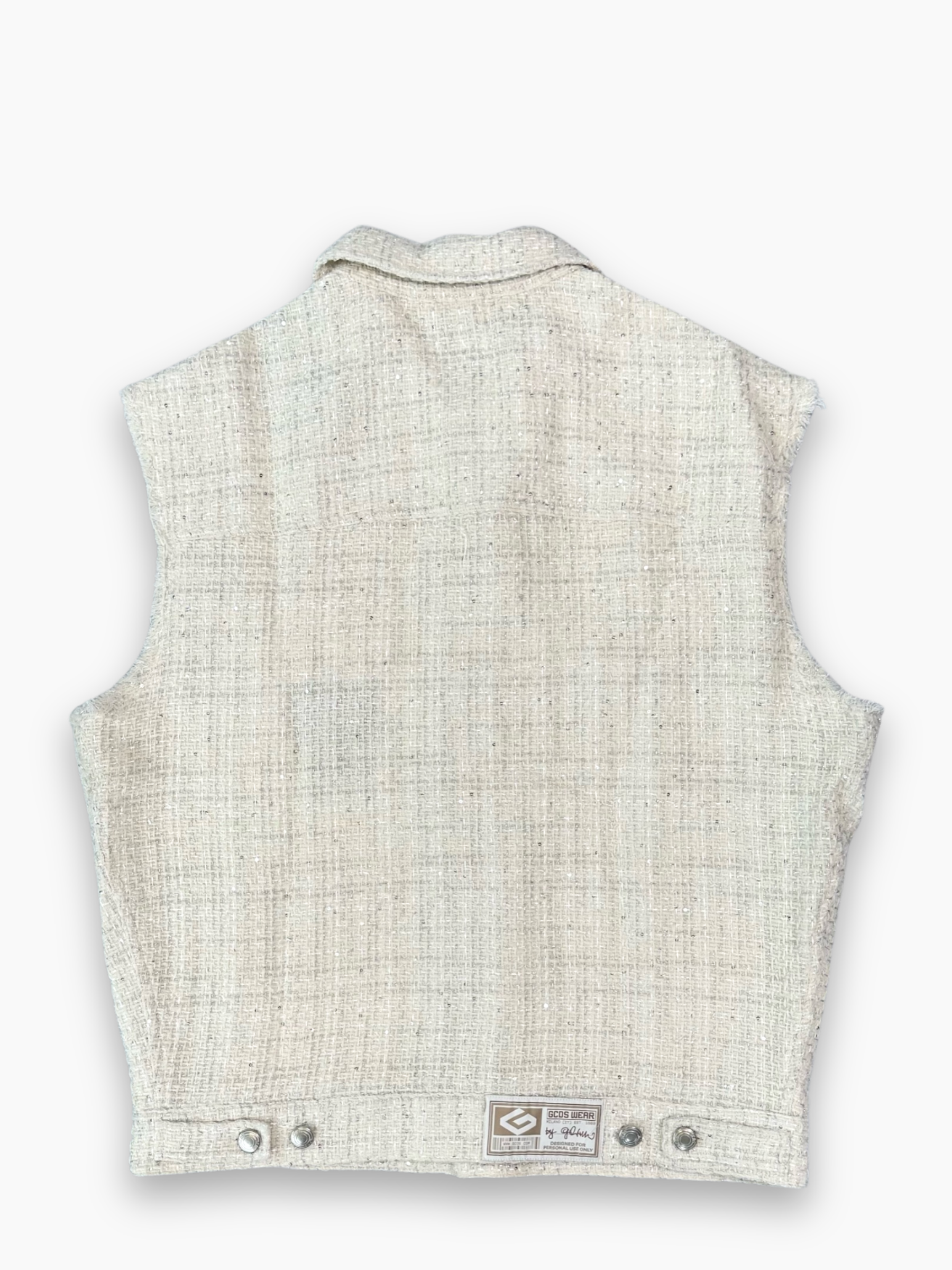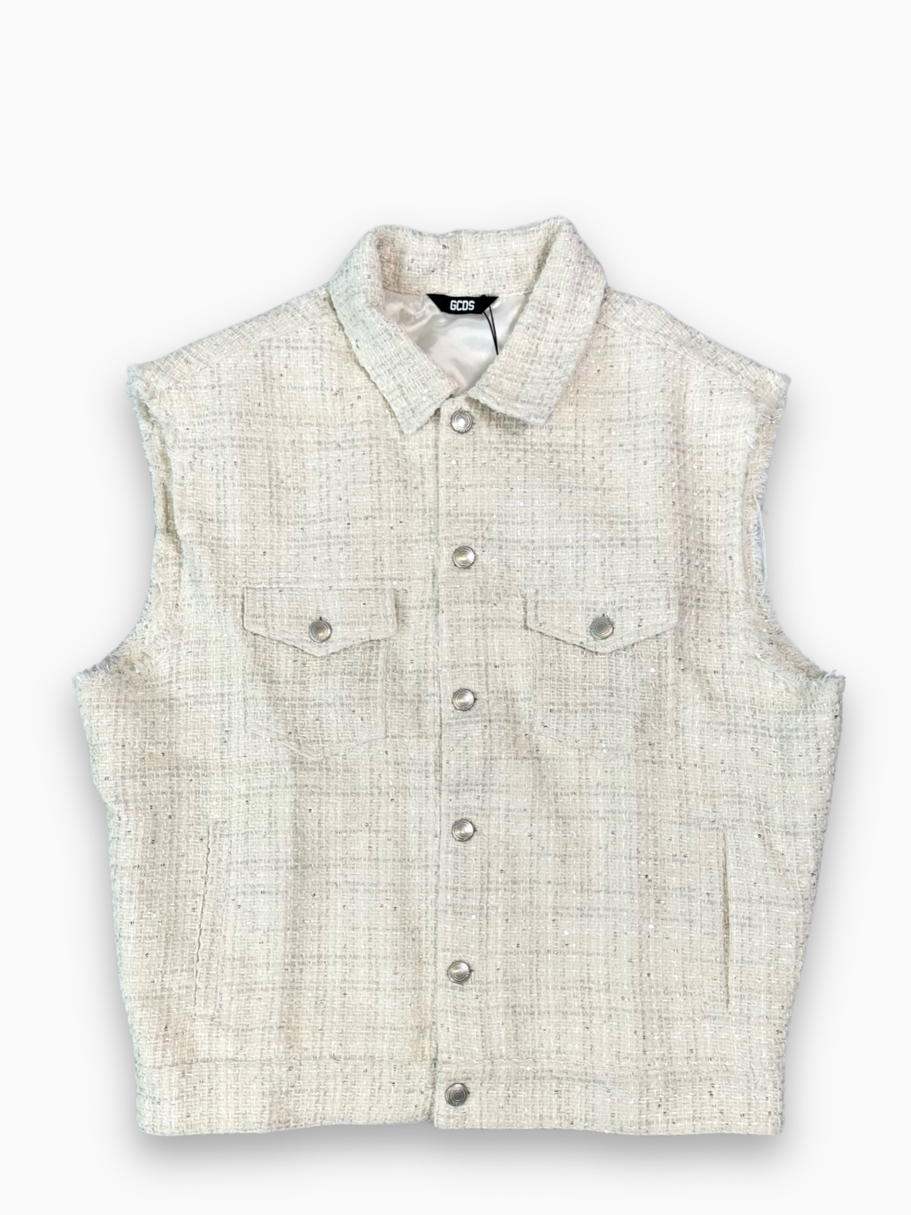 Gilet in tweed color cream senza maniche, impreziosito da micro paillettes integrate nella trama che donano un elegante effetto luminoso. Il design strutturato con colletto rialzato e taschini frontali richiama l’estetica classica del tweed, rivisitata in chiave moderna secondo il DNA GCDS. Perfetto per look sofisticati, layering chic e outfit serali.