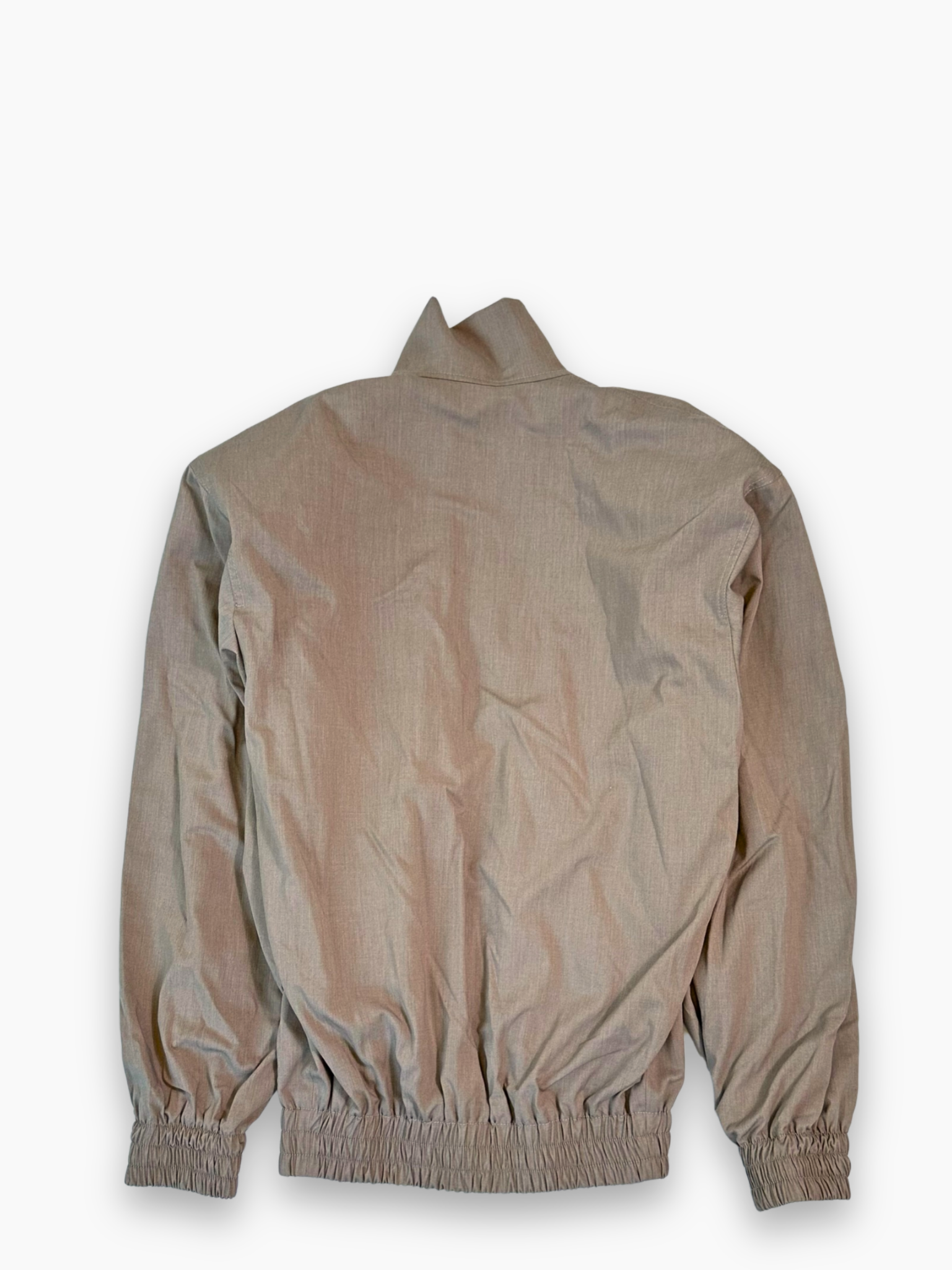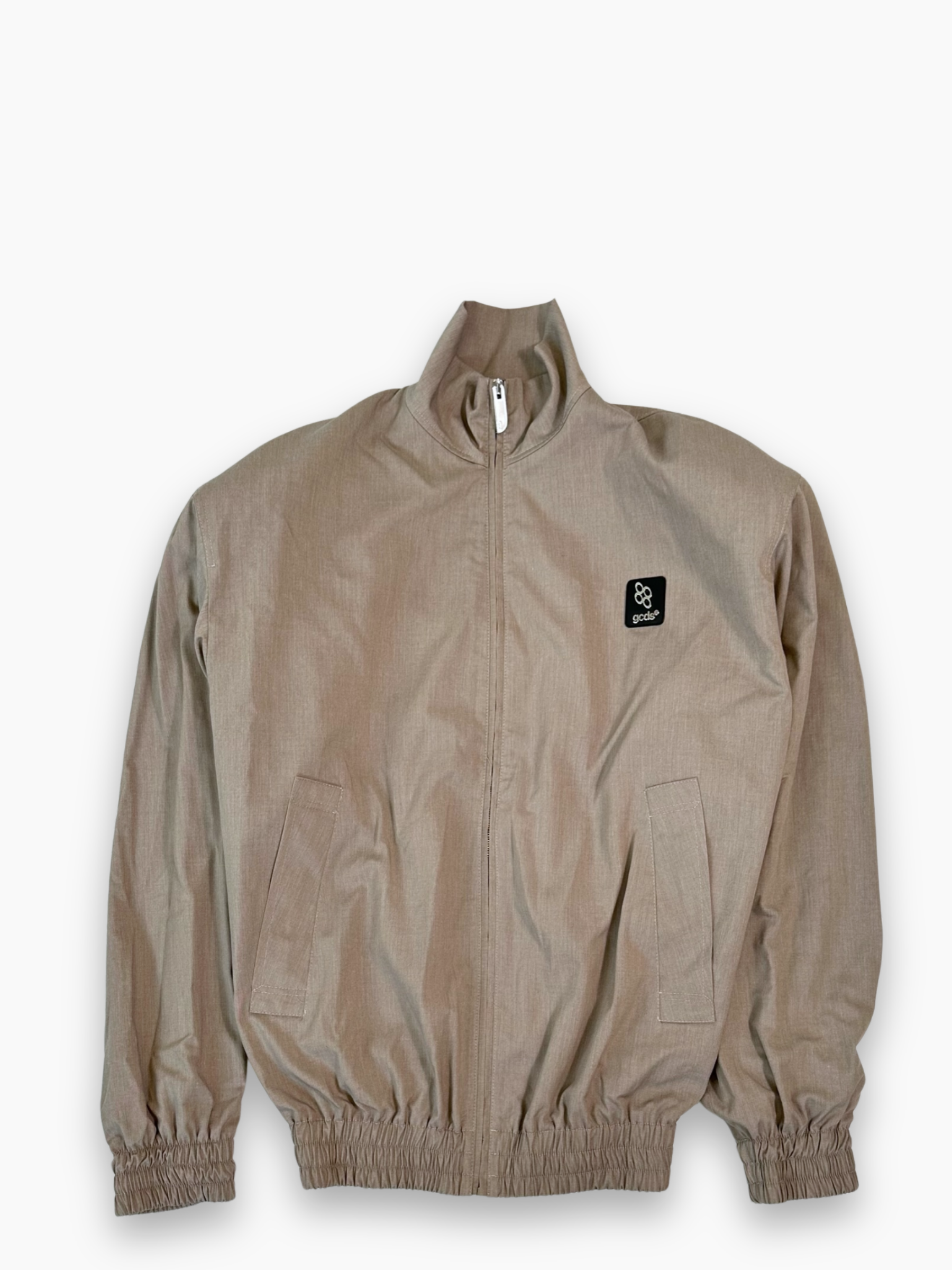 Giubbino leggero color taupe con zip frontale e collo alto, caratterizzato dal patch logo GCDS applicato sul petto. La linea morbida e la struttura elasticizzata su polsi e fondo offrono comfort e versatilità, rendendolo perfetto per look casual dall’attitudine minimal e contemporanea.