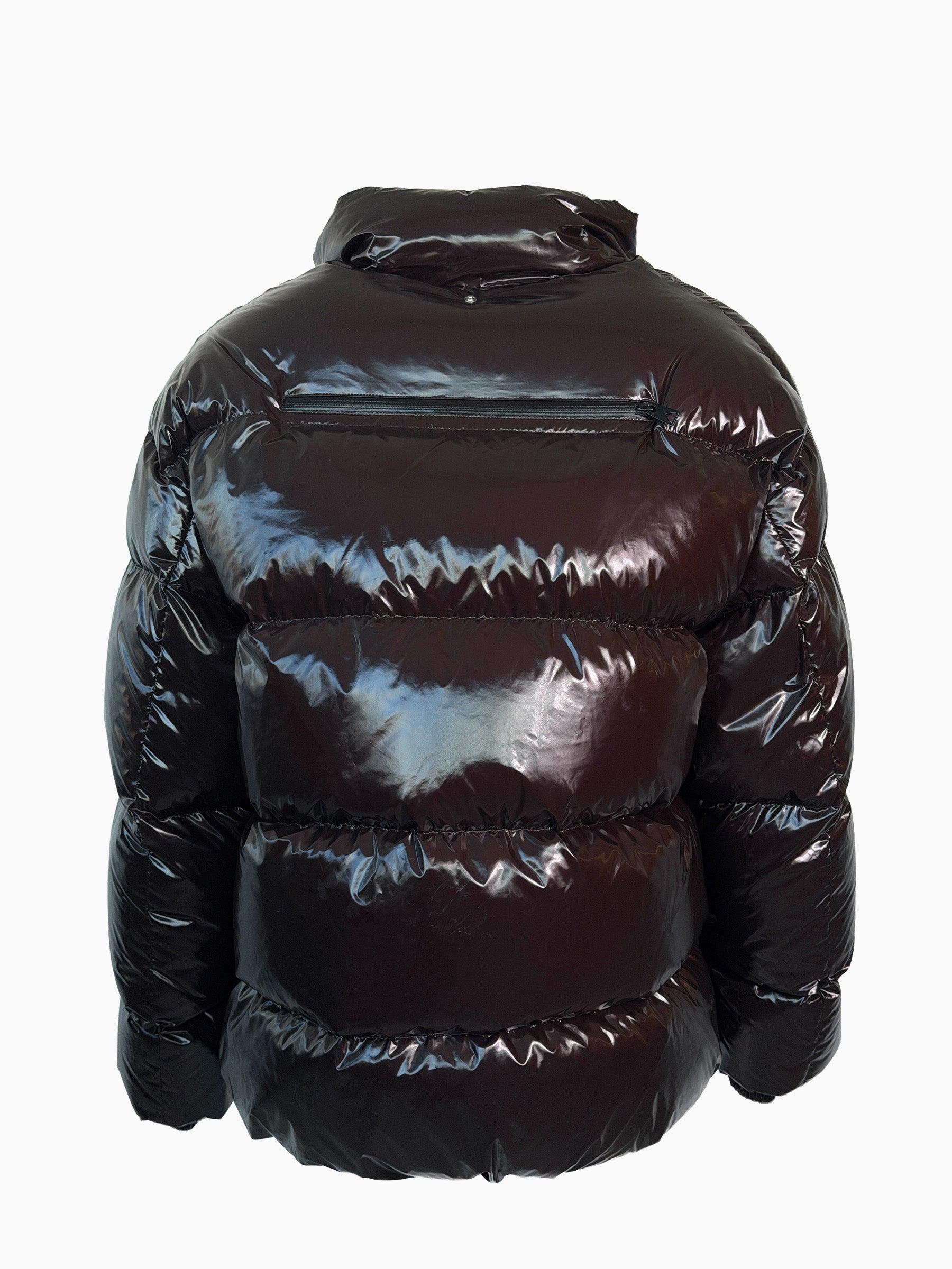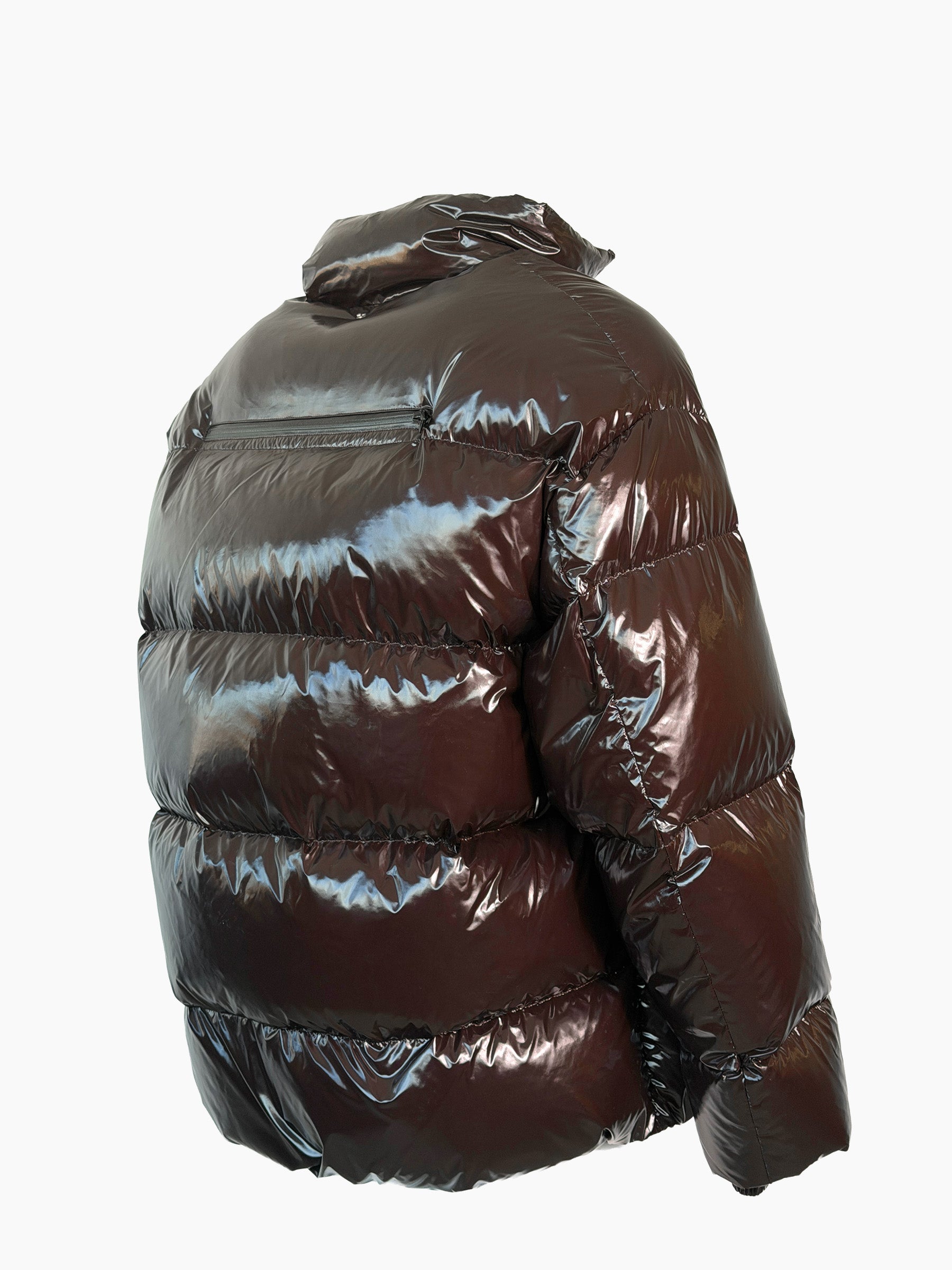 Padded down jacket in shiny brown technical fabric, featuring a glossy finish that lends a modern and bold look. The horizontal quilting ensures maximum comfort and protection from the cold, while the center zip and side pockets make this garment practical and versatile for everyday wear.