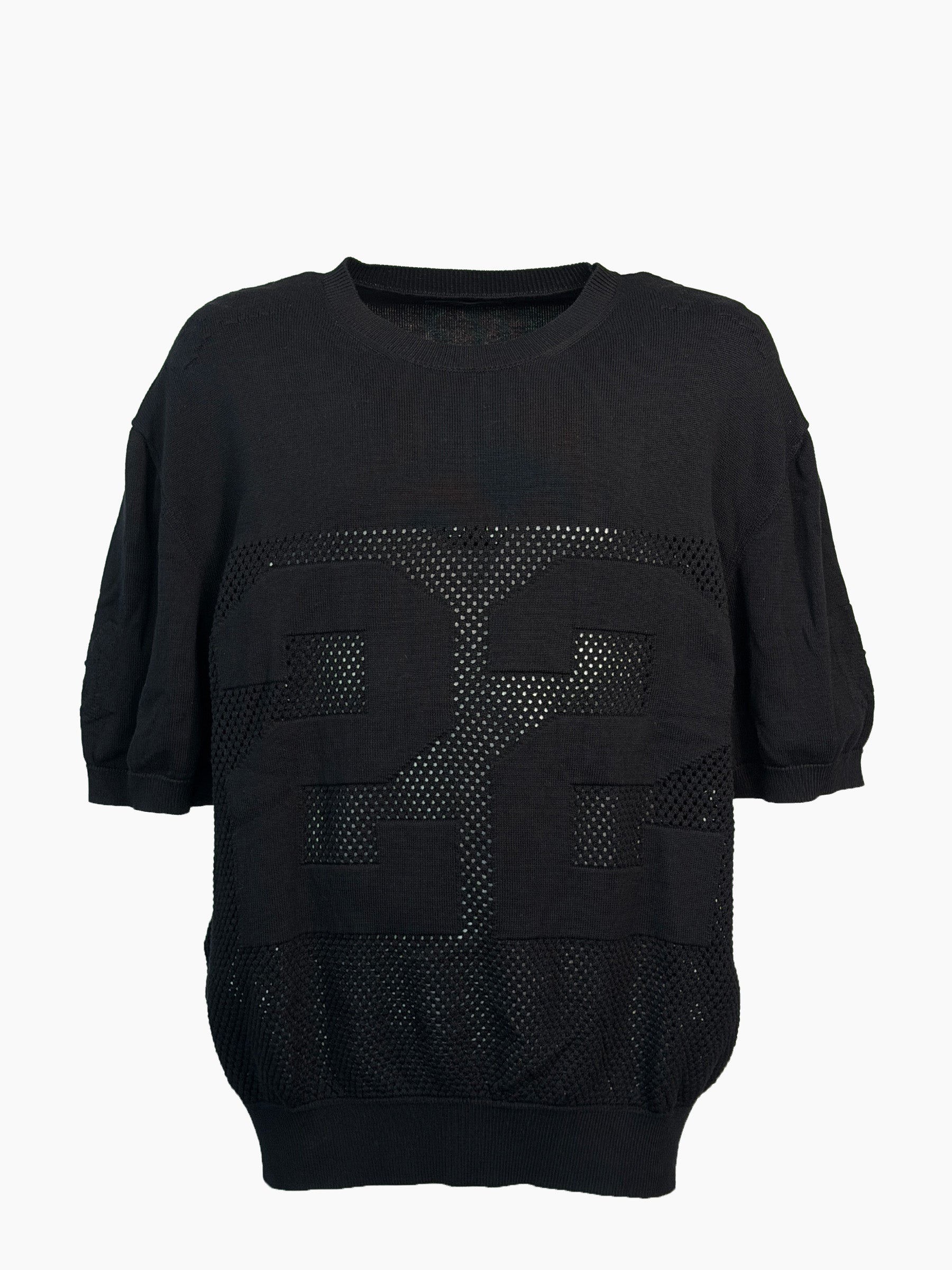 Black short-sleeved sweater with a perforated design and a large "22" inlaid on the front. The design combines a lightweight, breathable texture with sporty, contemporary details, ideal for casual looks and refined streetwear.