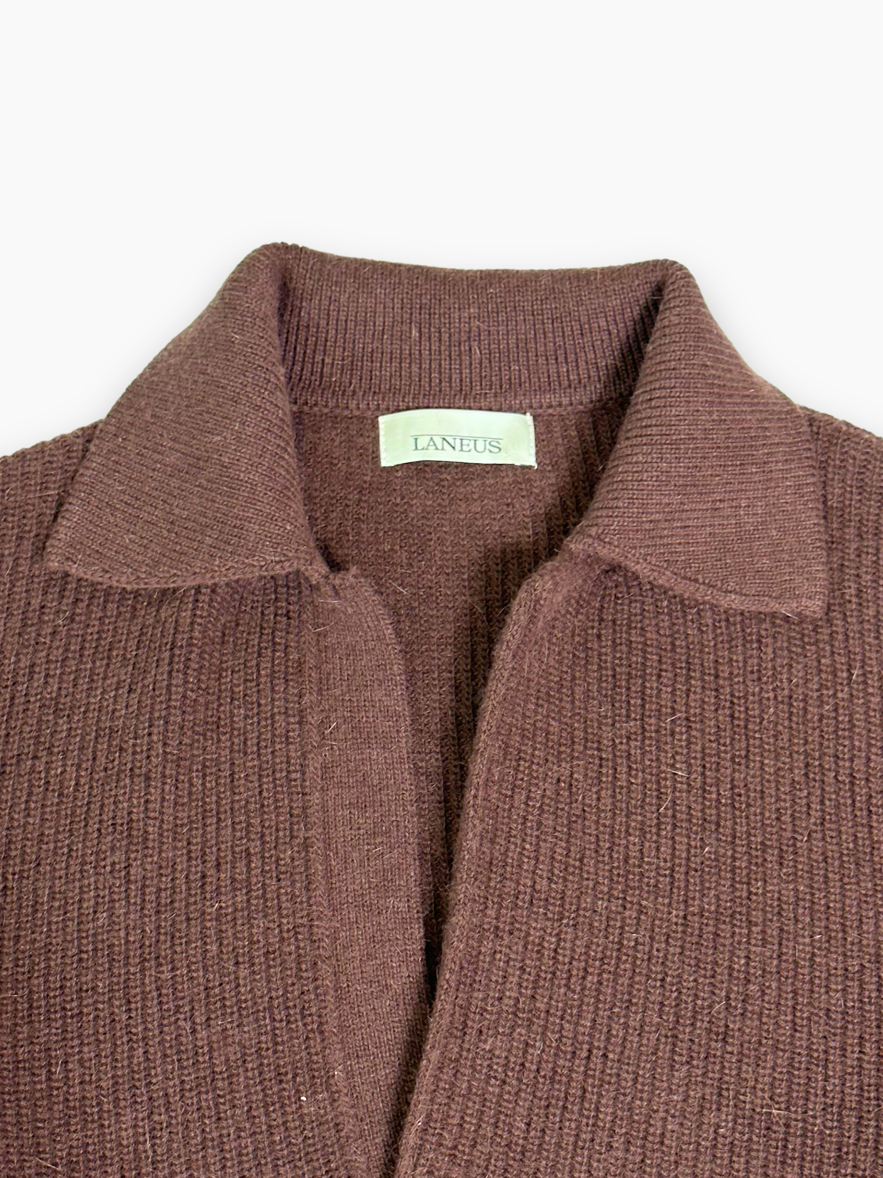 Plain knit sweater with an open collar, offered in a warm shade of brown. The fine ribbing and clean lines make it a versatile piece, ideal for casual or more refined outfits. Perfect for those who love soft, timeless elegance.