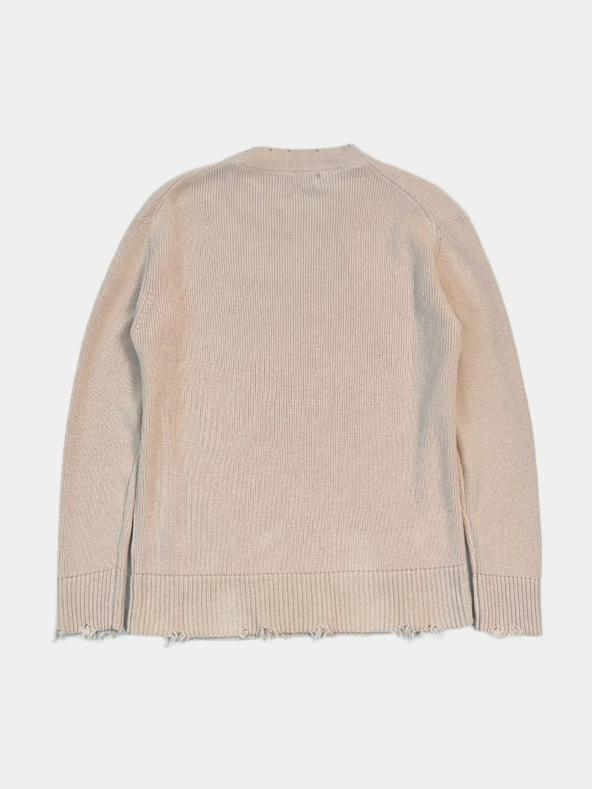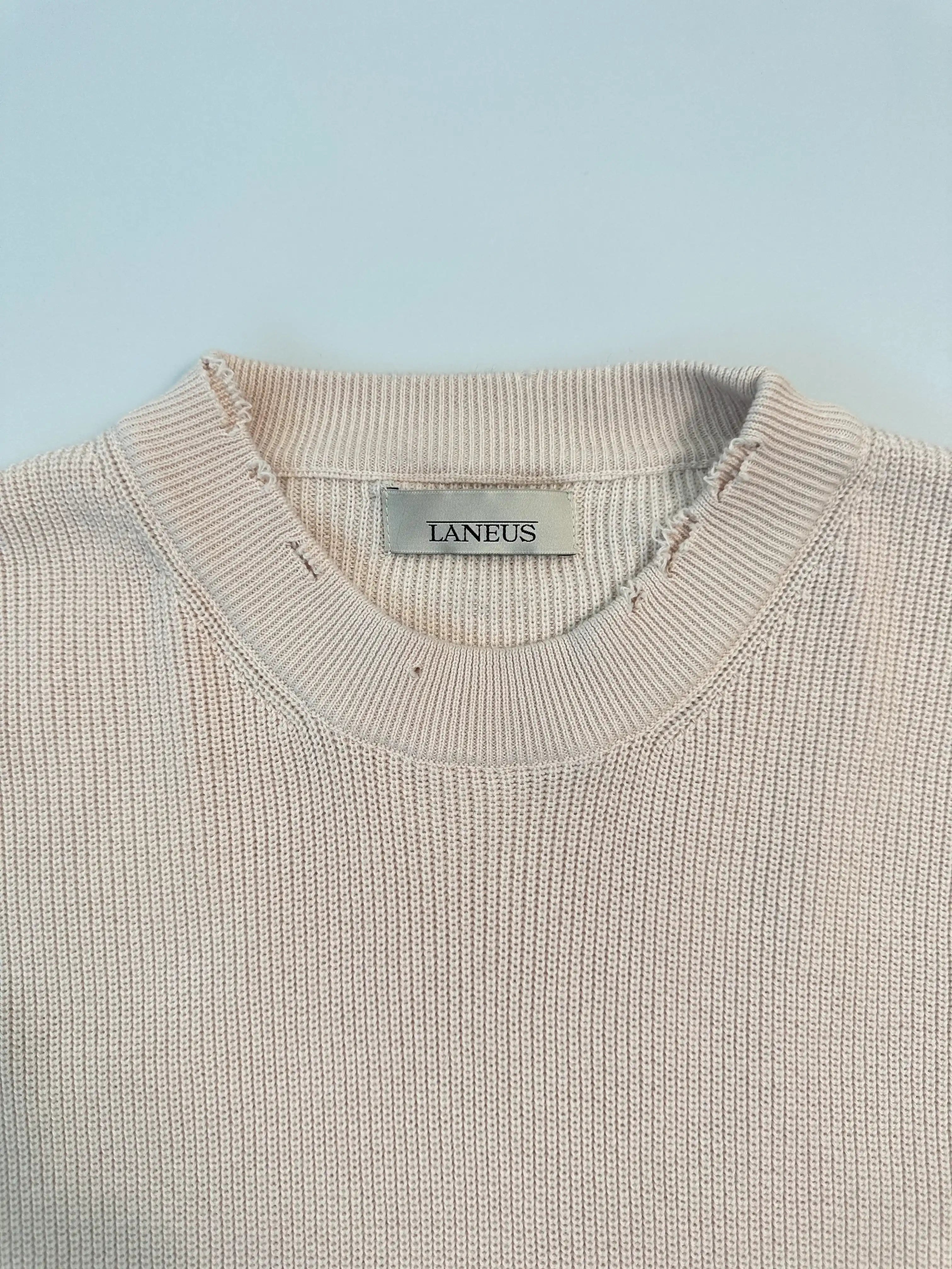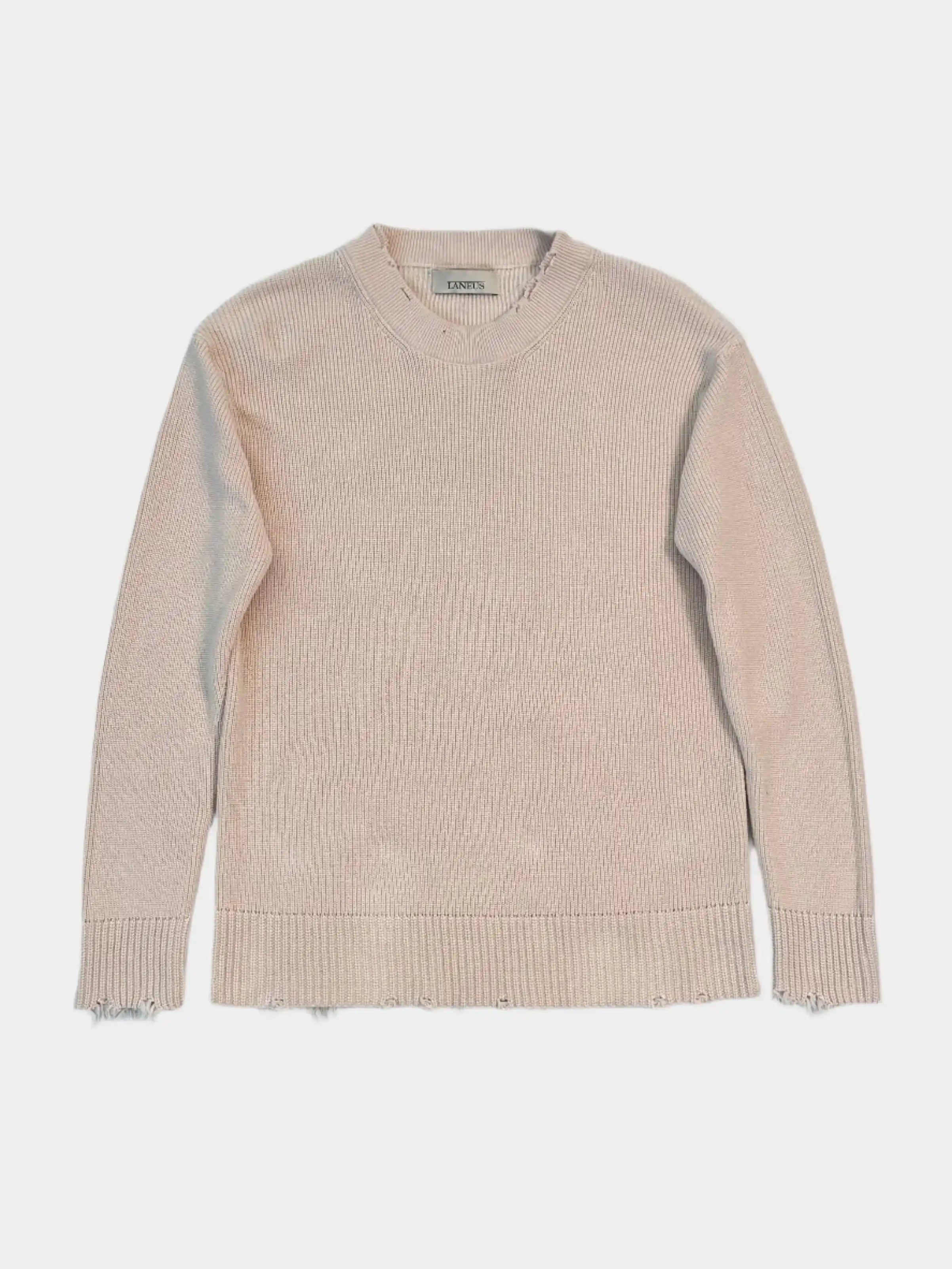 A sweater with an artisanal feel, designed by Laneus, combining elegance and grunge details. Crafted from a compact knit, it features a frayed hem, cuffs, and neckline. Perfect for completing minimalist looks with a bold twist, it adapts to any season with style and personality.