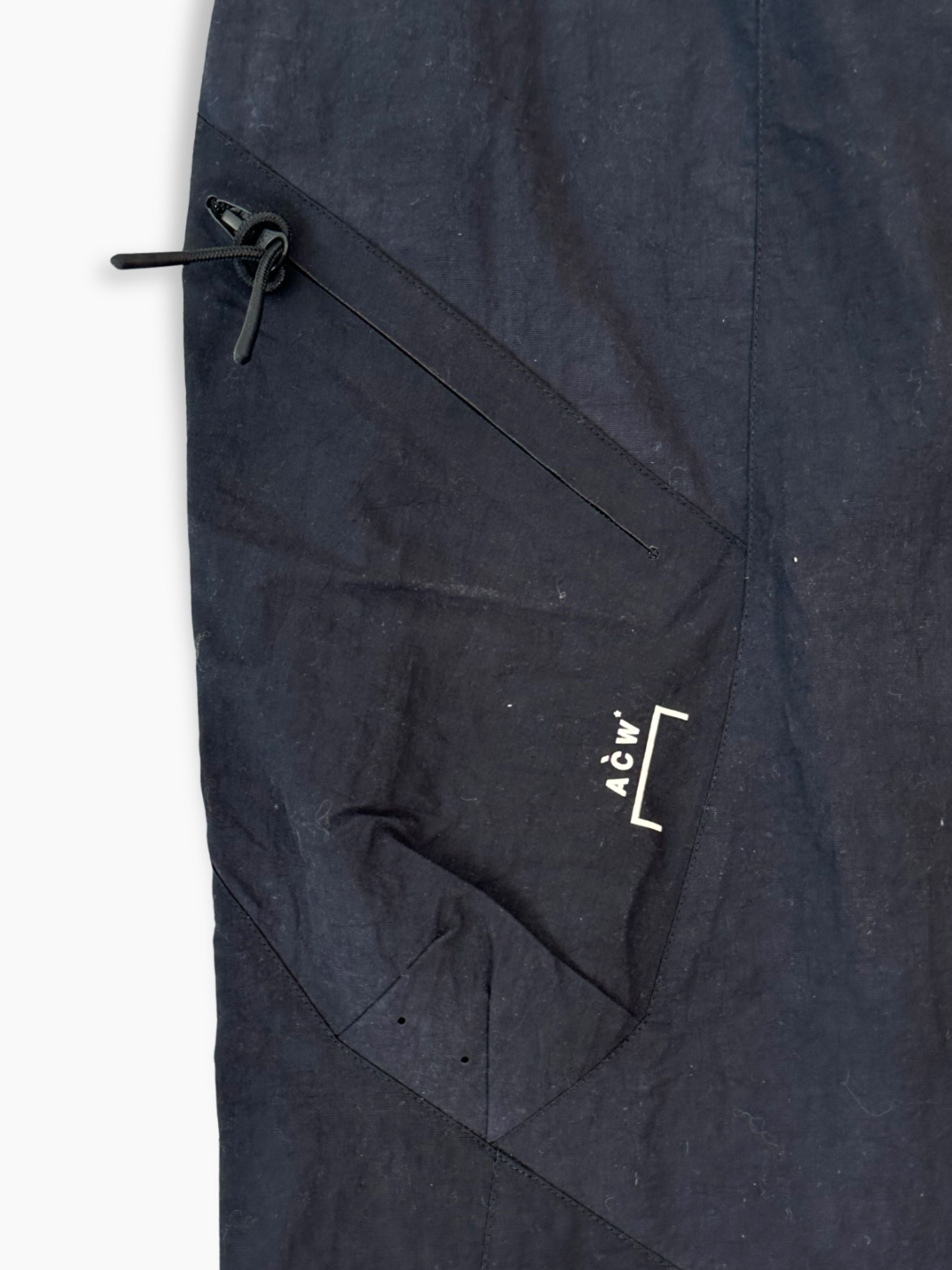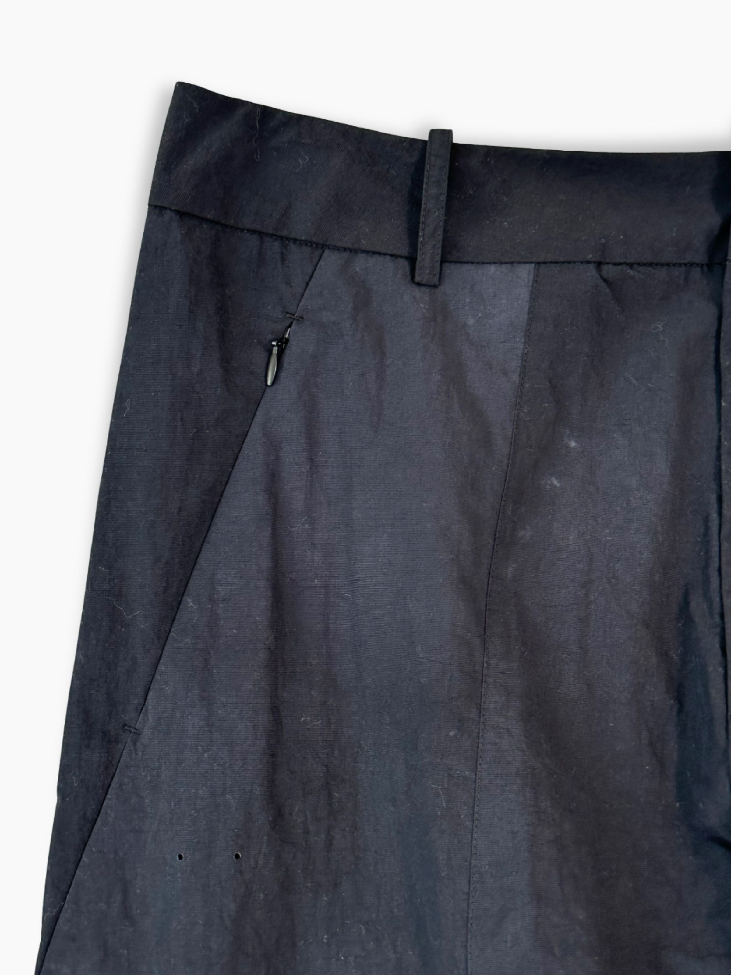 Straight-fit trousers made of black technical fabric with a washed-effect finish and tone-on-tone panels. The geometric stitching and asymmetrical leg cut recall the brand's experimental and industrial DNA, lending the piece a contemporary and conceptual aesthetic. Ideal for those seeking a statement yet versatile piece, they can be worn with both sneakers and more elegant shoes.