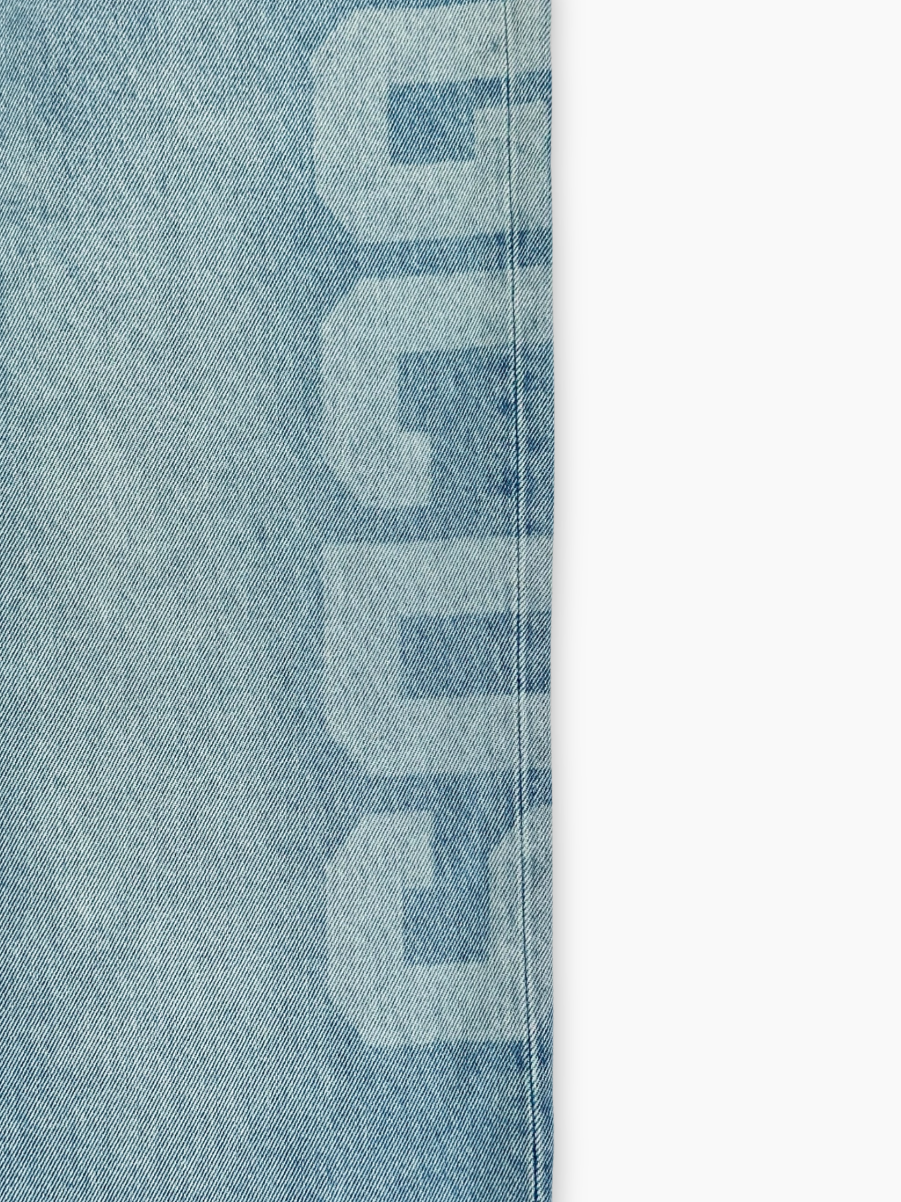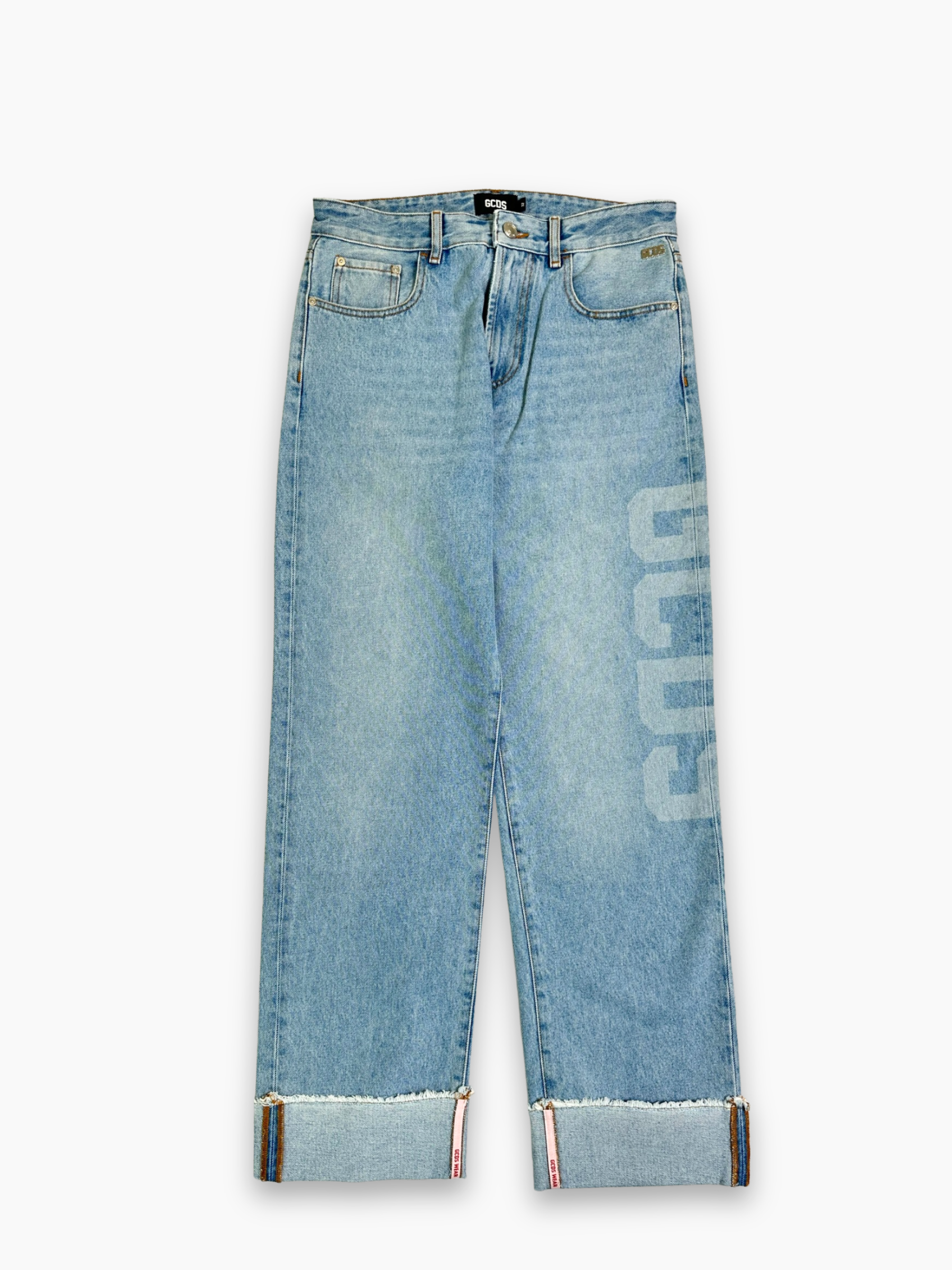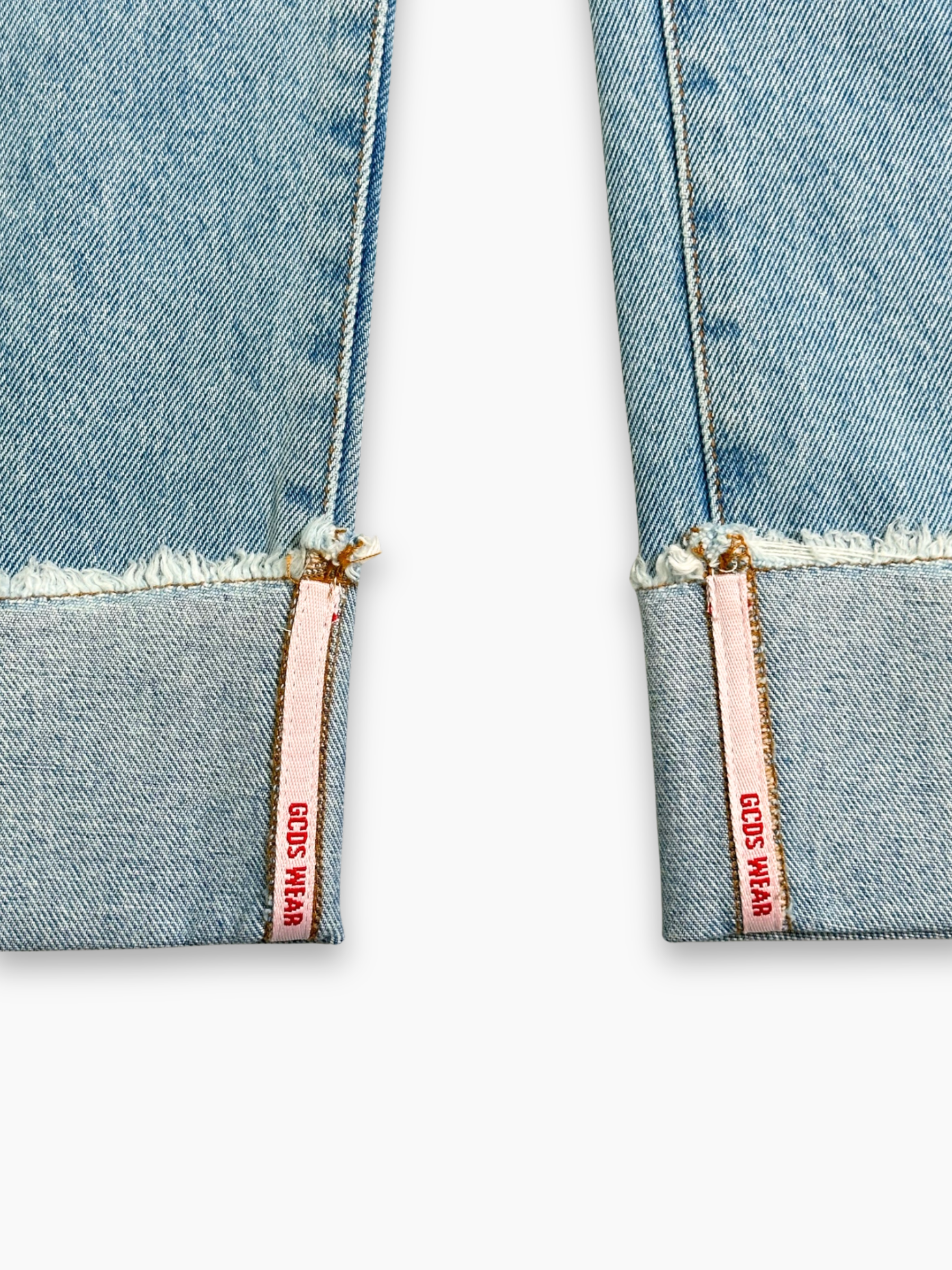 Jeans in denim chiaro a gamba dritta con maxi logo GCDS laterale tono su tono e risvolti sfrangiati multicolor sul fondo. Un modello contemporaneo che aggiorna il classico denim con dettagli iconici e un’estetica moderna.