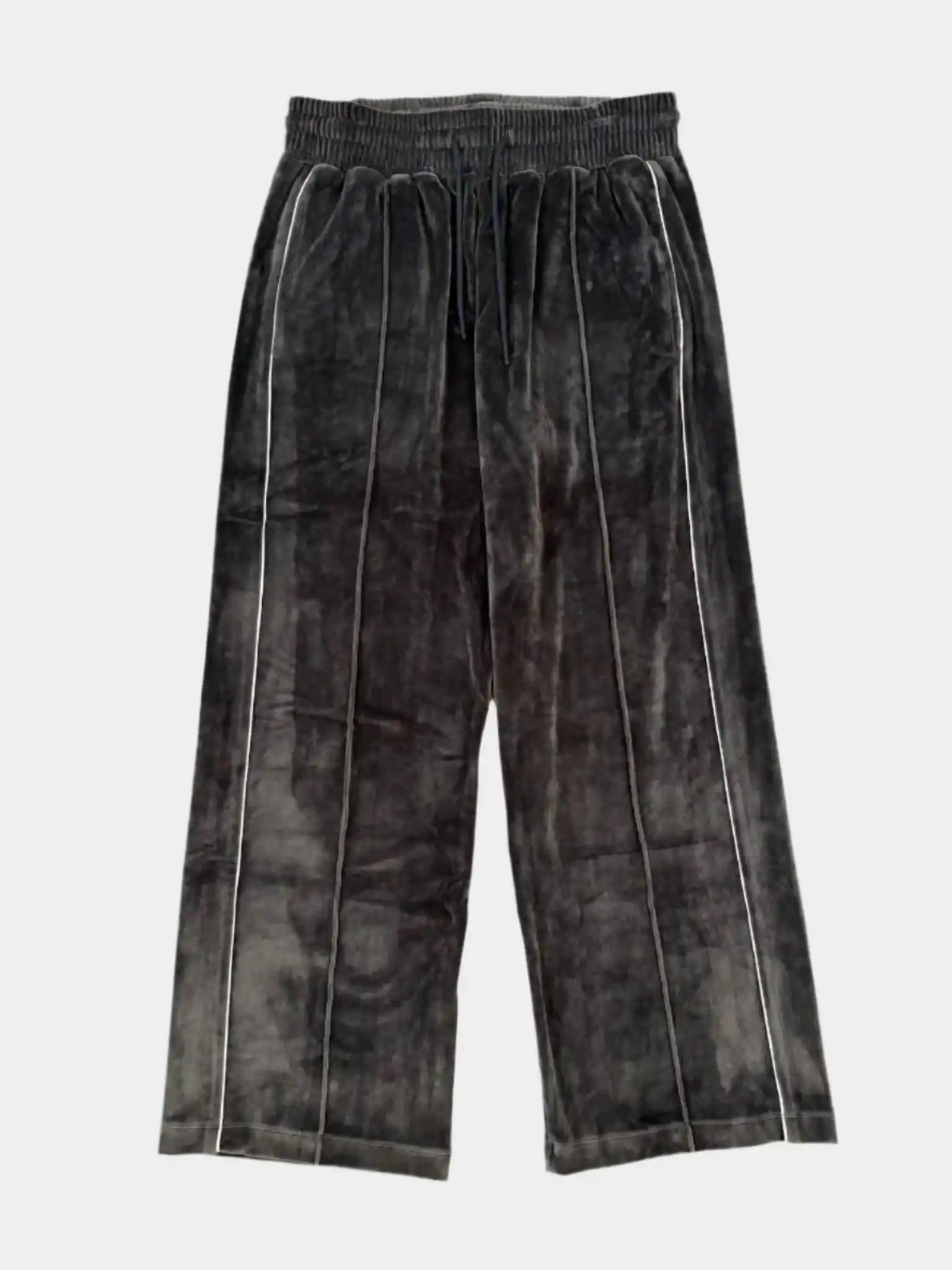 A relaxed yet sophisticated piece: these straight-leg trousers in iron-colored chenille with a velvety finish offer an elegant, contemporary look. The vertical ribbing and contrasting trims along the legs slim the figure. An elasticated waist with an adjustable drawstring and a patch pocket on the back complete the comfortable, versatile design.