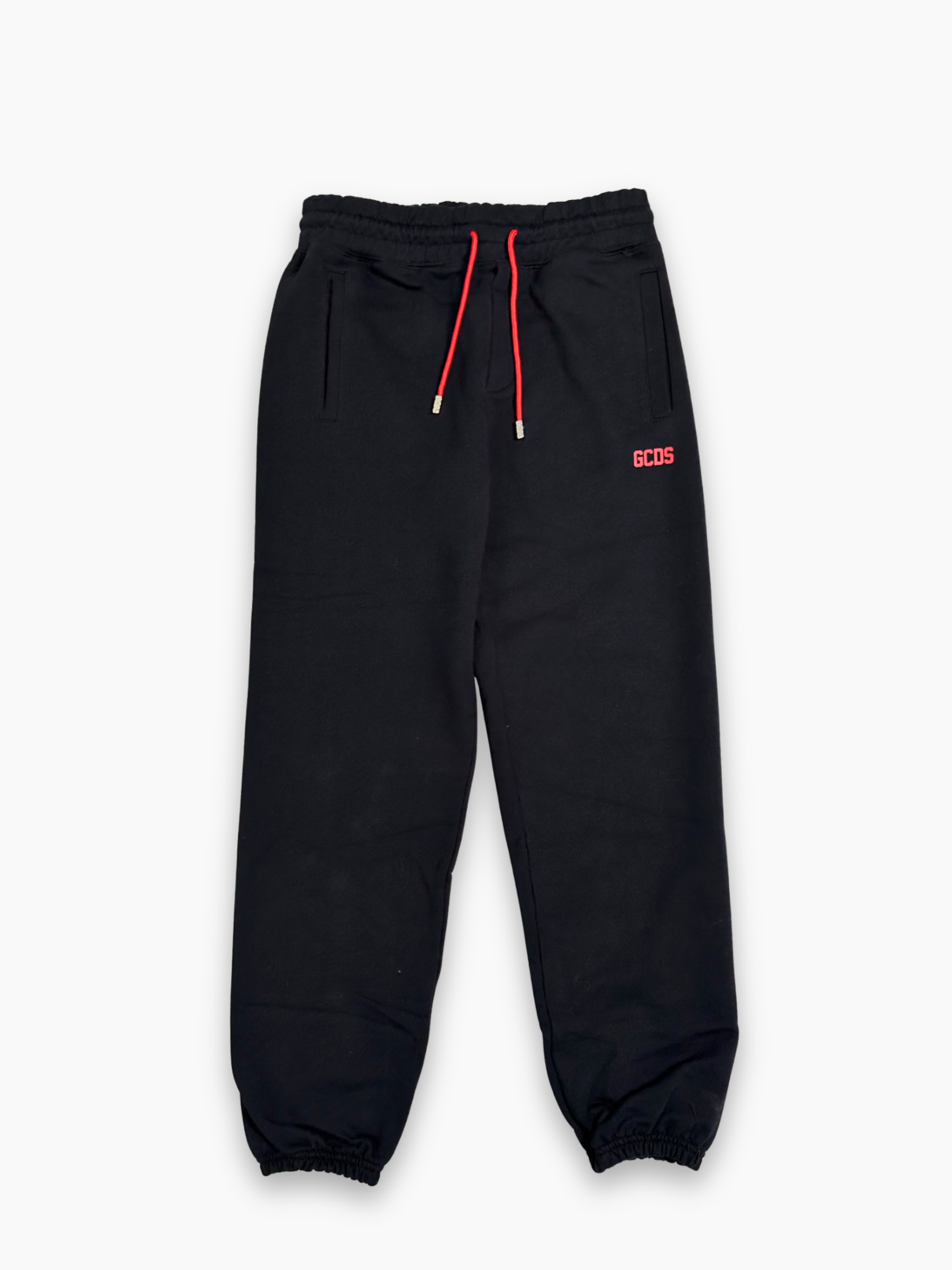 Black joggers with an elastic waistband and contrasting red adjustable drawstring. Crafted from soft fleece, they offer comfort and practicality for everyday wear. The embroidered GCDS logo on the leg adds a distinctive touch to the understated design. Perfect for casual and streetwear looks.