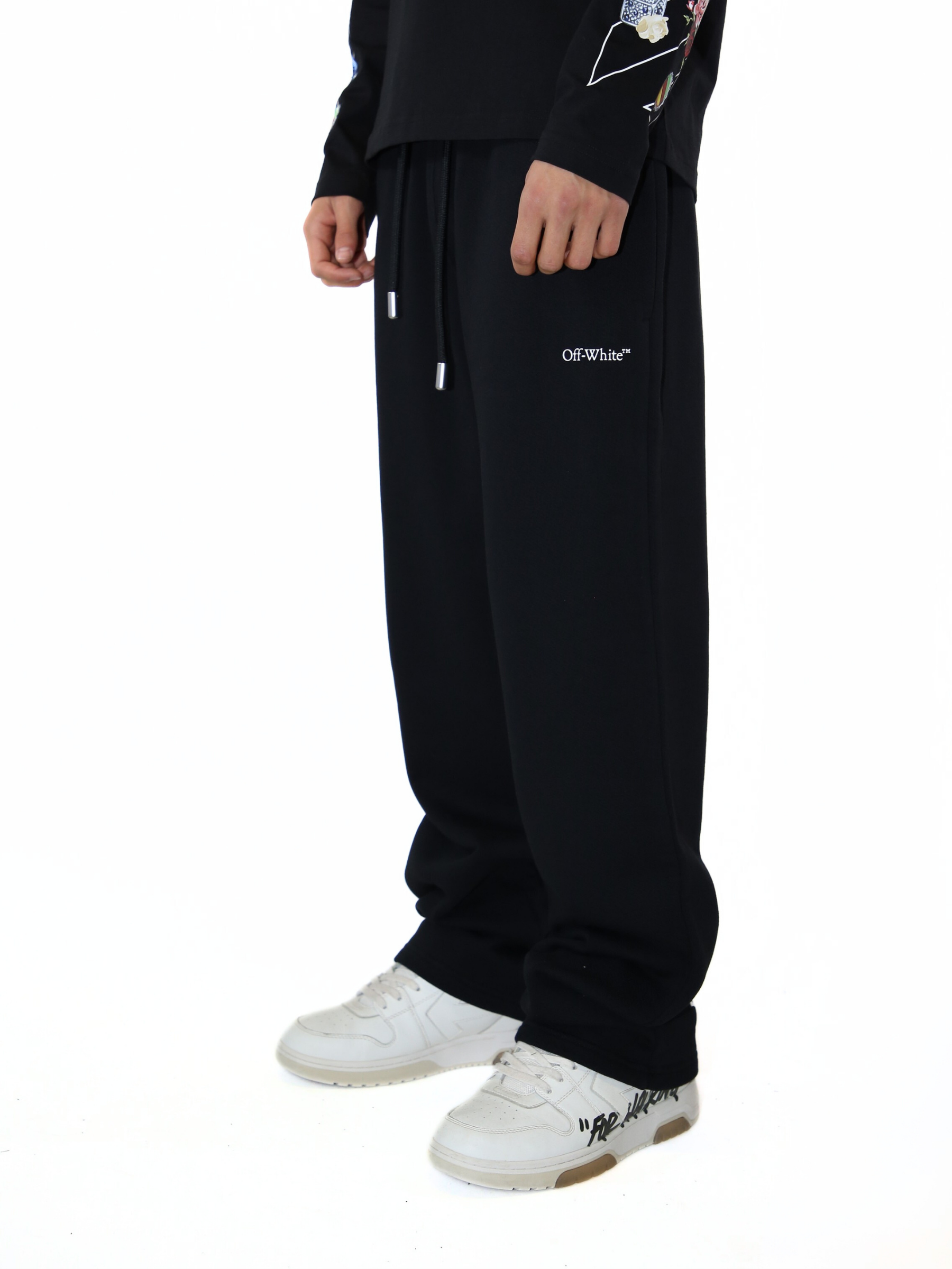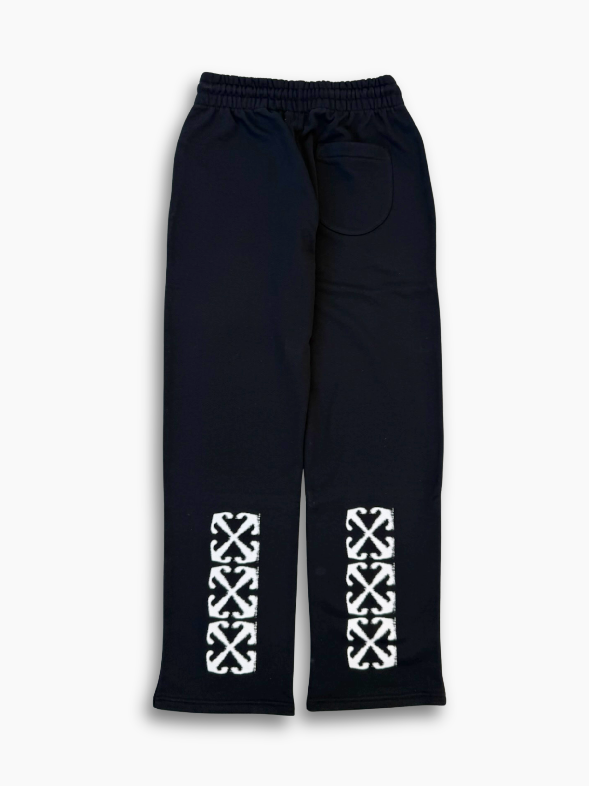 Soft black cotton trousers by Off-White™, featuring an embroidered logo on the front and the iconic white arrows printed on the back of the legs. A streetwear essential, they combine comfort and bold style for a contemporary urban look.