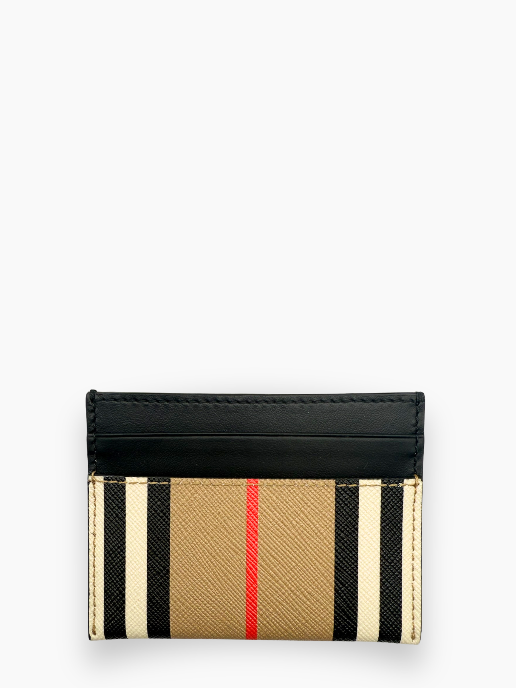 Porta carte compatto in canvas rivestito con iconico motivo Burberry nelle tonalità black e neutre, con dettagli a righe e profili neri. Elegante, resistente e perfetto per organizzare carte e documenti essenziali con stile minimal e distintivo.