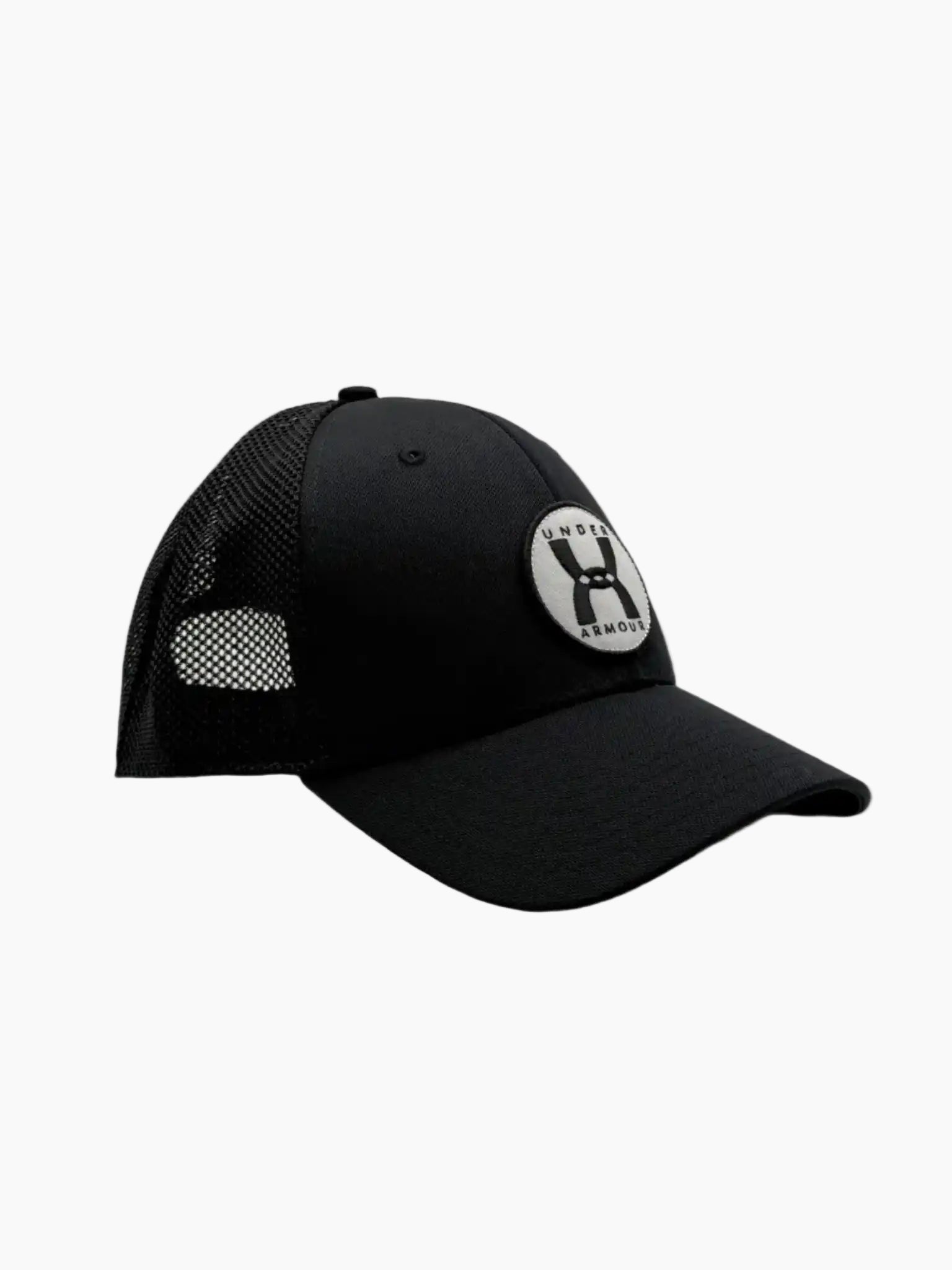 Black trucker cap Under Armour with curved visor and mesh panels on the back, perfect to complete a sporty and casual look. The round logo embroidered on the front gives a distinctive and urban touch. Made with breathable fabric, it guarantees comfort and an adjustable fit thanks to the snapback closure.