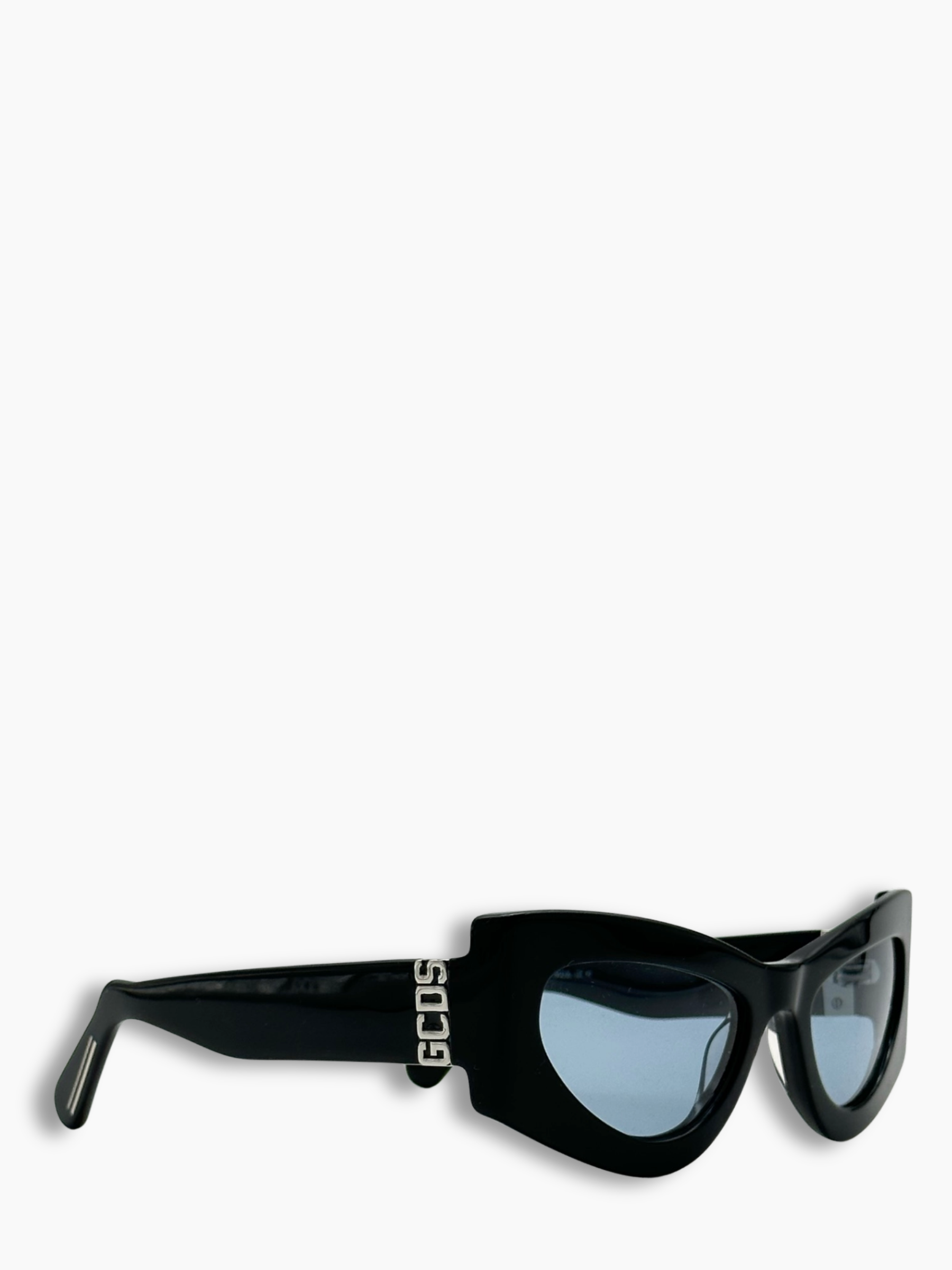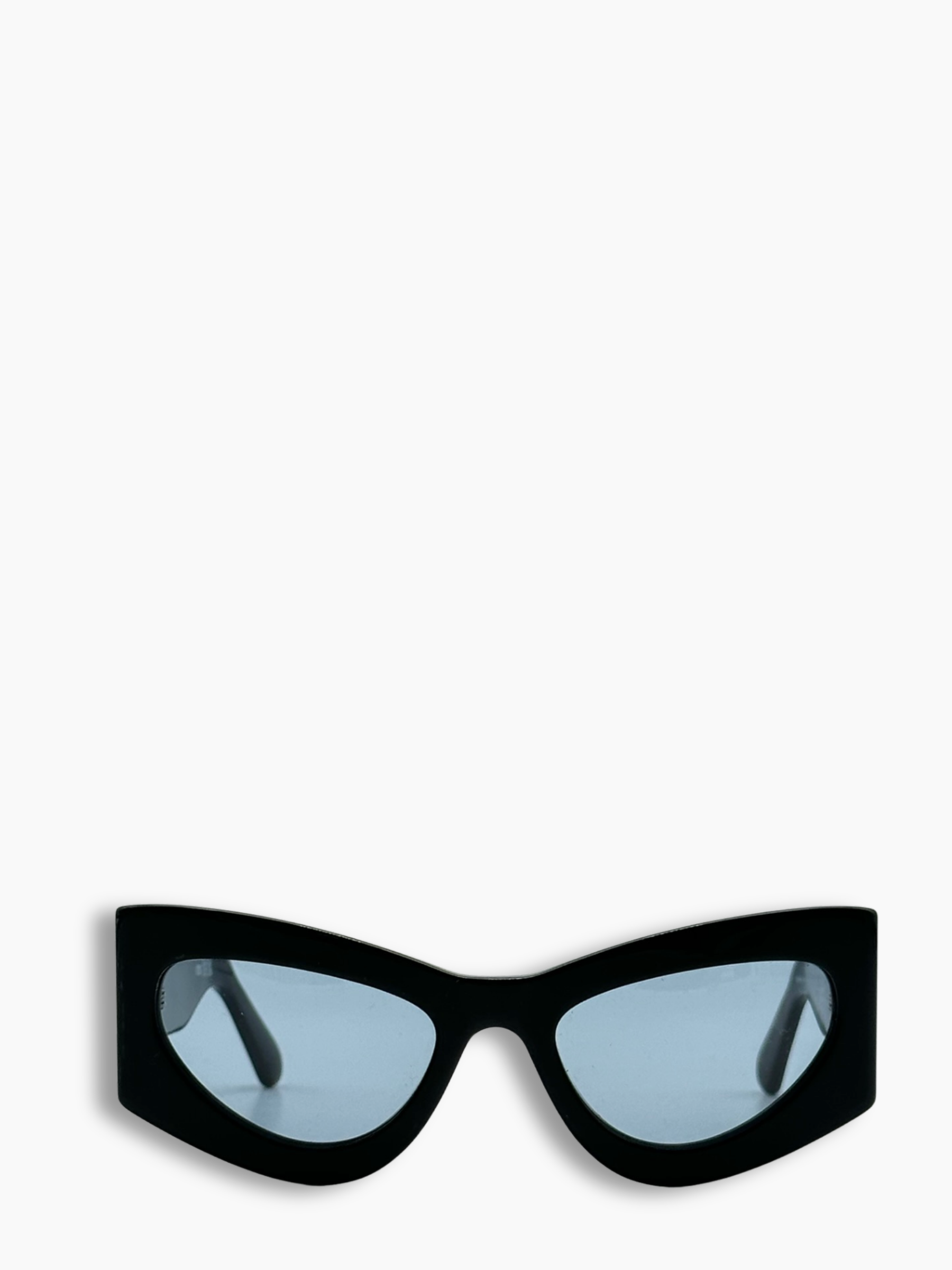 Occhiali cat-eye con montatura nera a punta e lenti azzurre che donano un twist futuristico. Un modello affusolato e ultra contemporaneo, ideale per look audaci e fashion-forward.