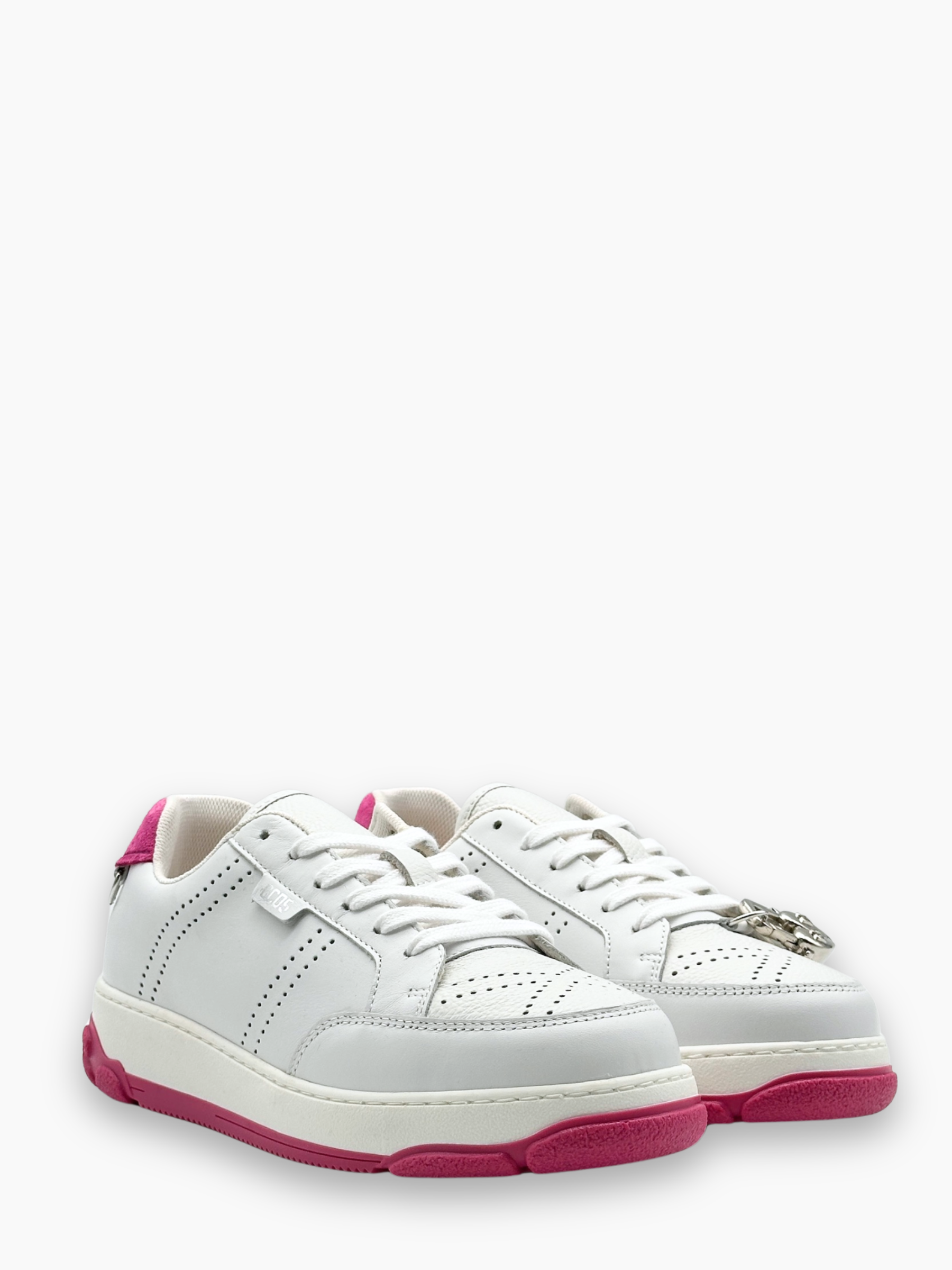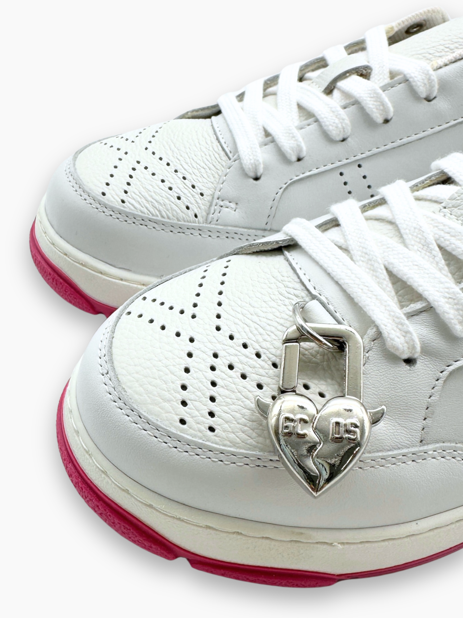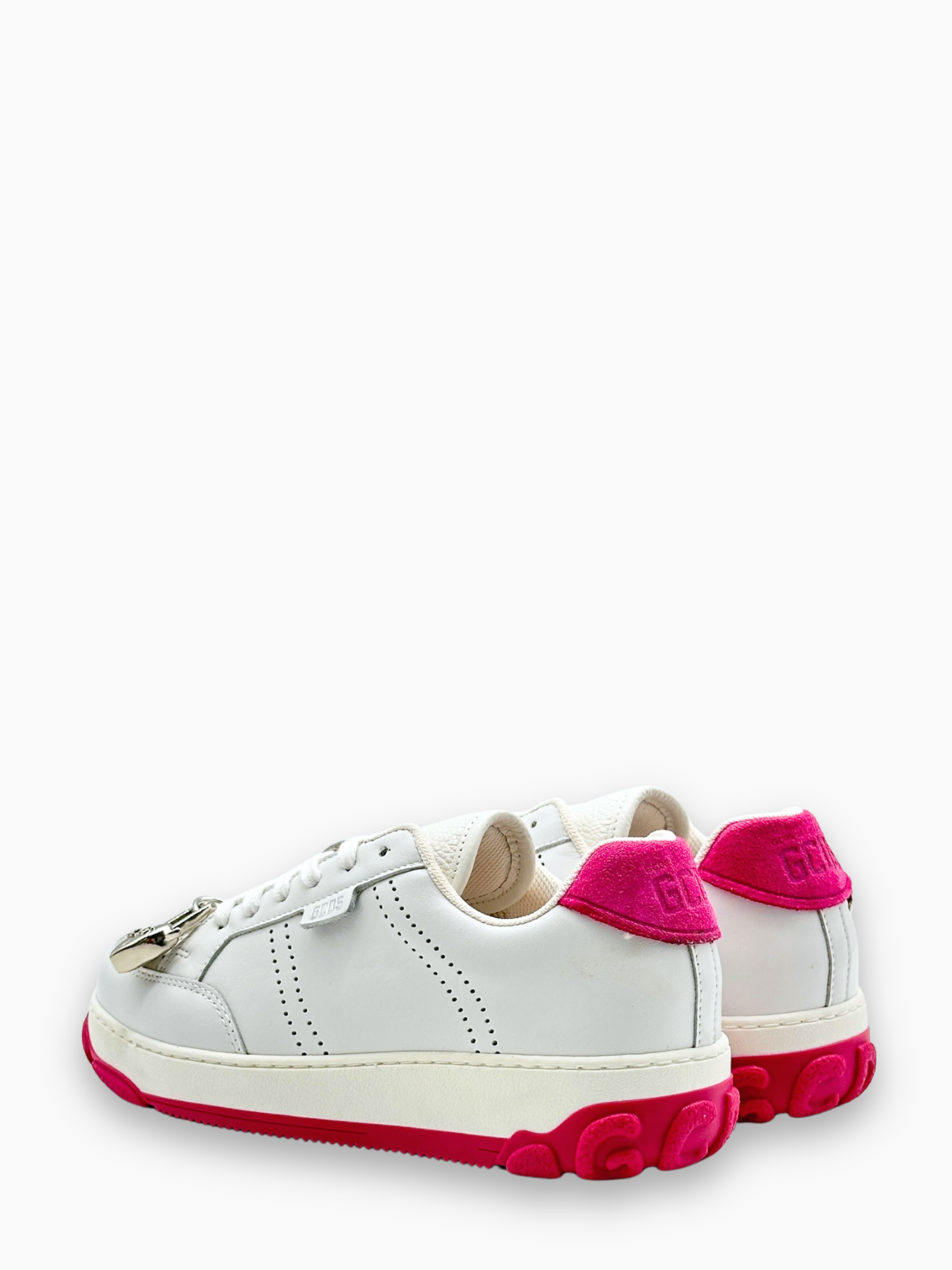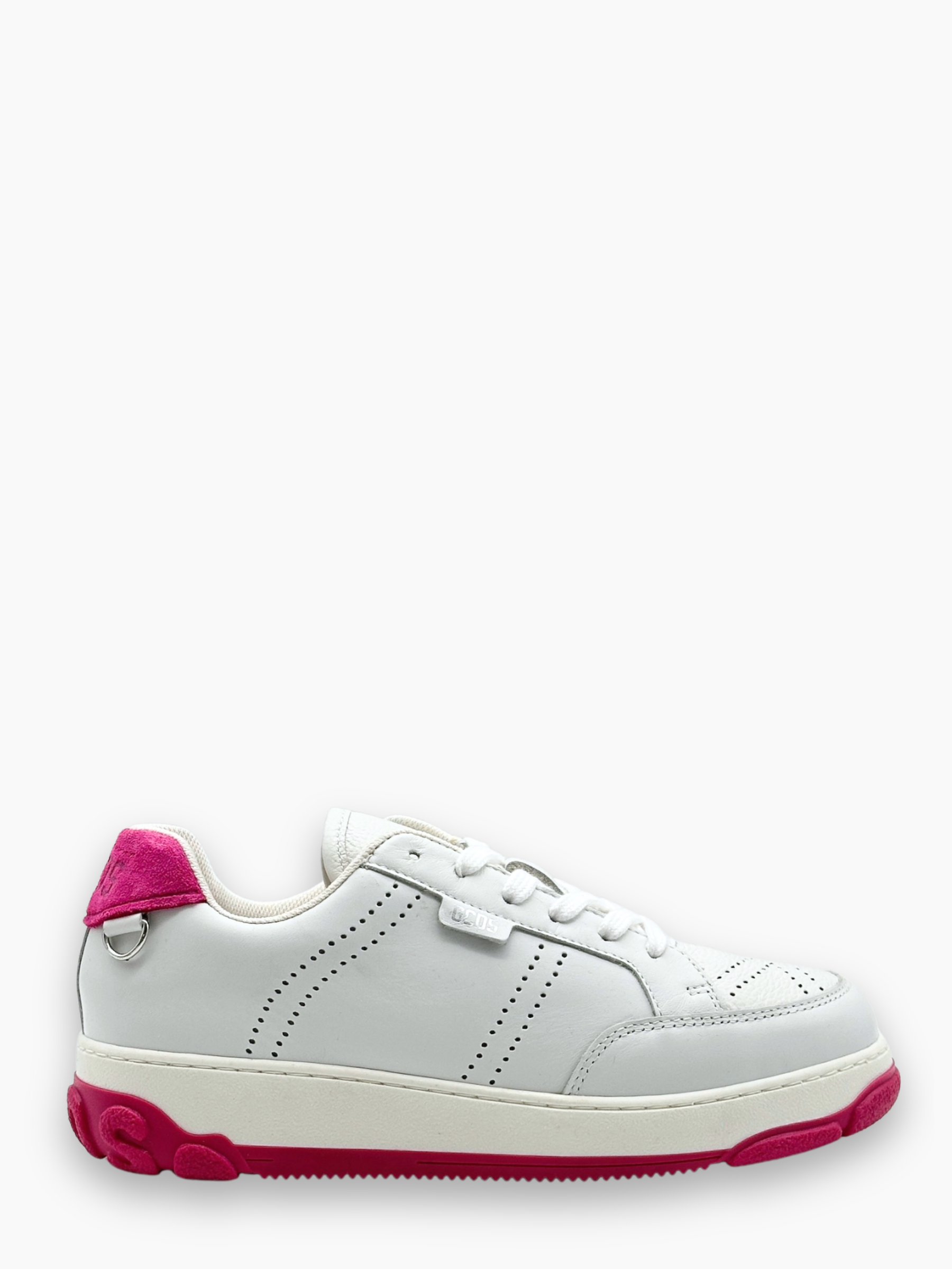 The Essential Nami sneakers from GCDS in white and fuchsia add a pop of color to your outfit. Featuring a white leather upper, fuchsia suede detail on the heel, and a contrasting two-tone sole, they combine bold style and comfort. The side logo and metallic detail on the heel complete the striking design.