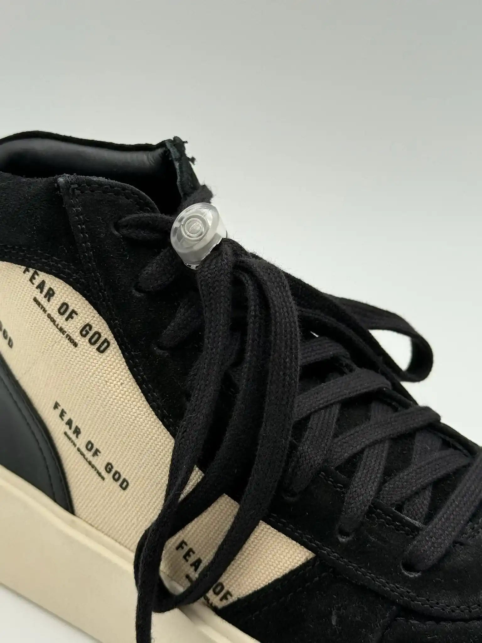 These Fear of God high-top sneakers blend premium materials and a sophisticated urban design. The upper combines black suede with white logo canvas inserts, creating a graphic and contemporary contrast. The chunky ivory sole adds character to the look, while the high-top construction with a lace-up closure and logo stopper adds a technical touch. Perfect for elevating streetwear outfits with a modern, luxurious appeal.