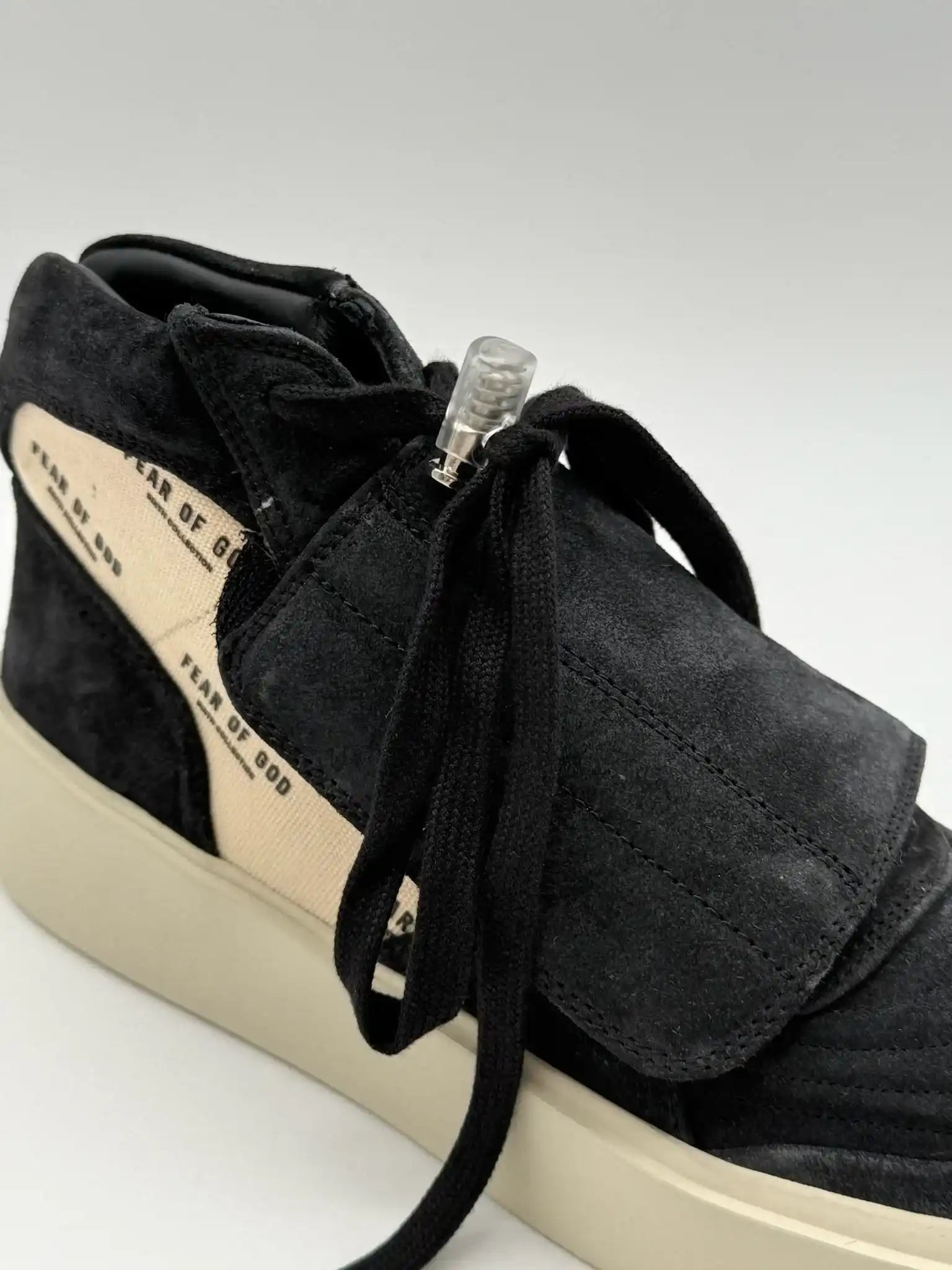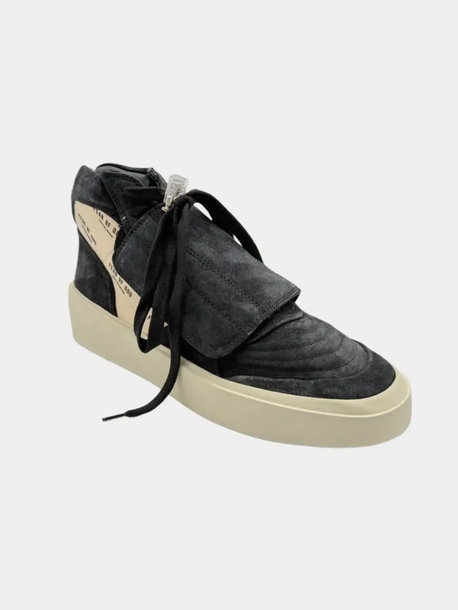 These Fear of God high-top sneakers offer a distinctive mix of premium materials and functional details. The black suede upper is paired with white logo canvas inserts, creating a graphic and modern contrast. The black lace-up closure with Velcro strap adds character and practicality to the design. The urban-style ivory sole completes the look, perfect for those who want to stand out with a touch of luxury and streetwear spirit.