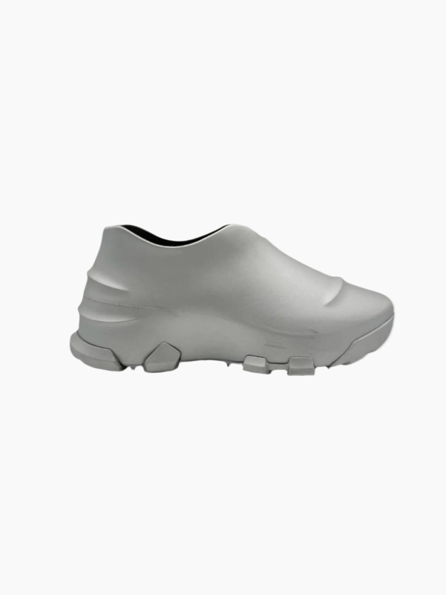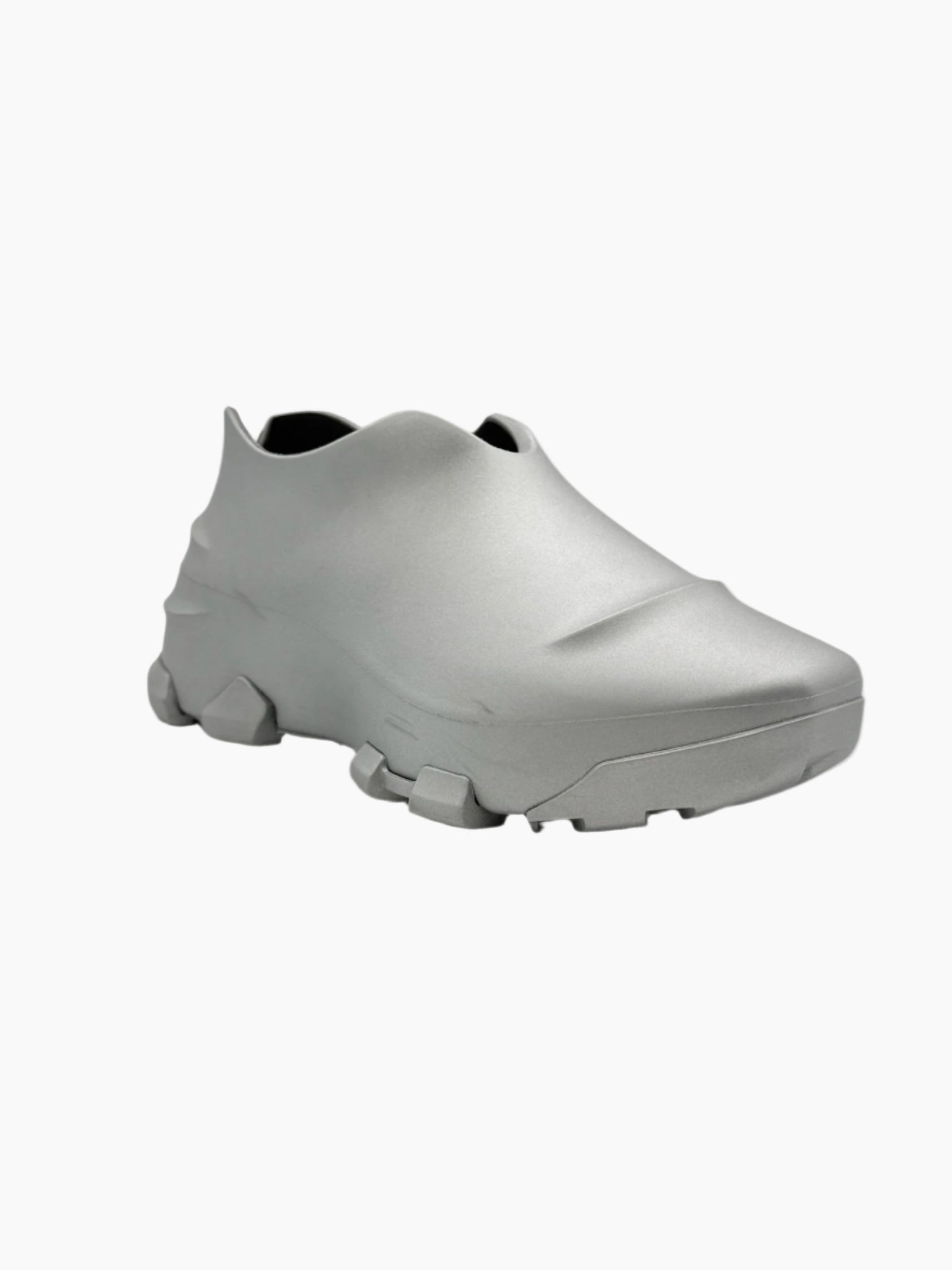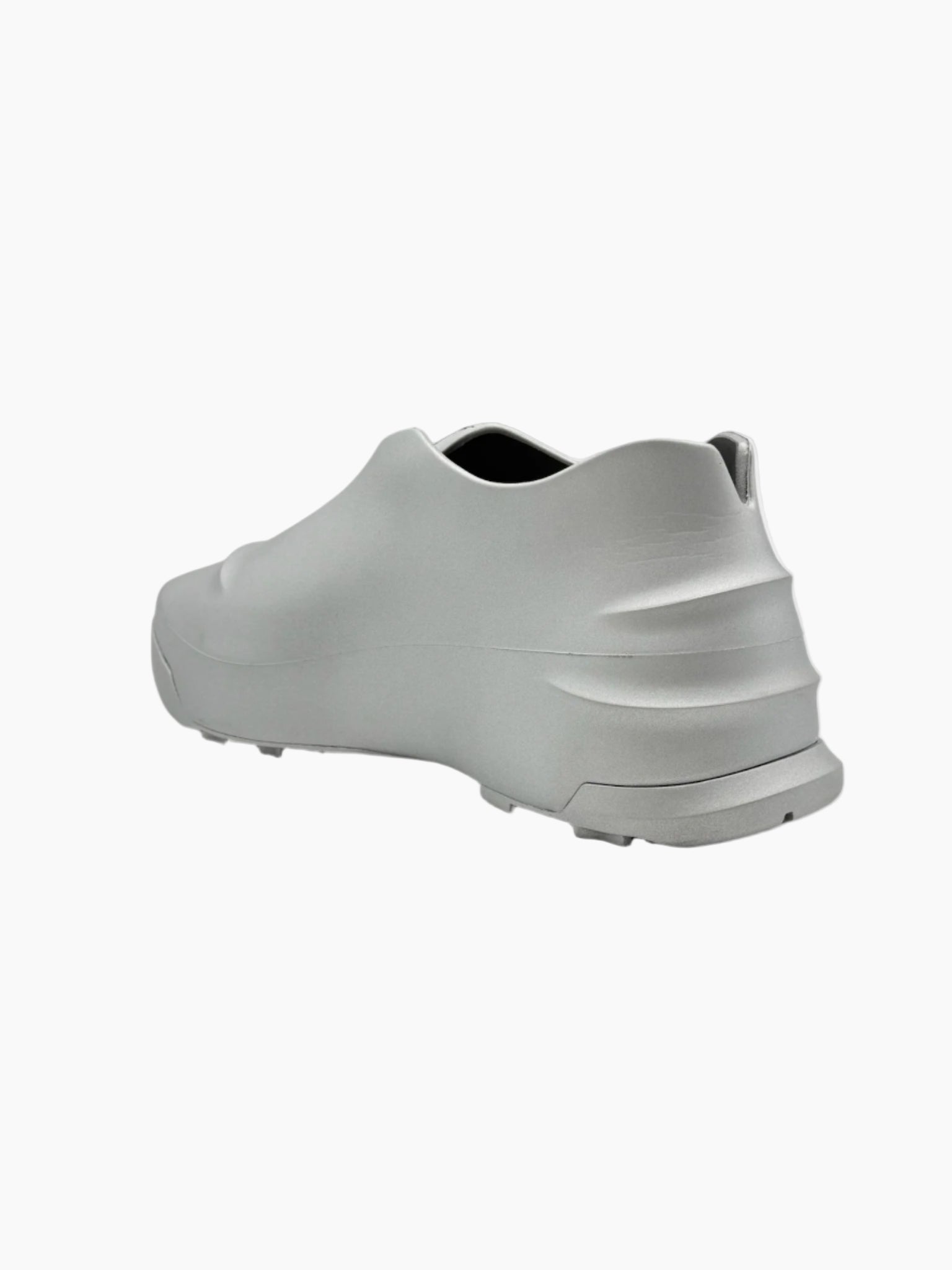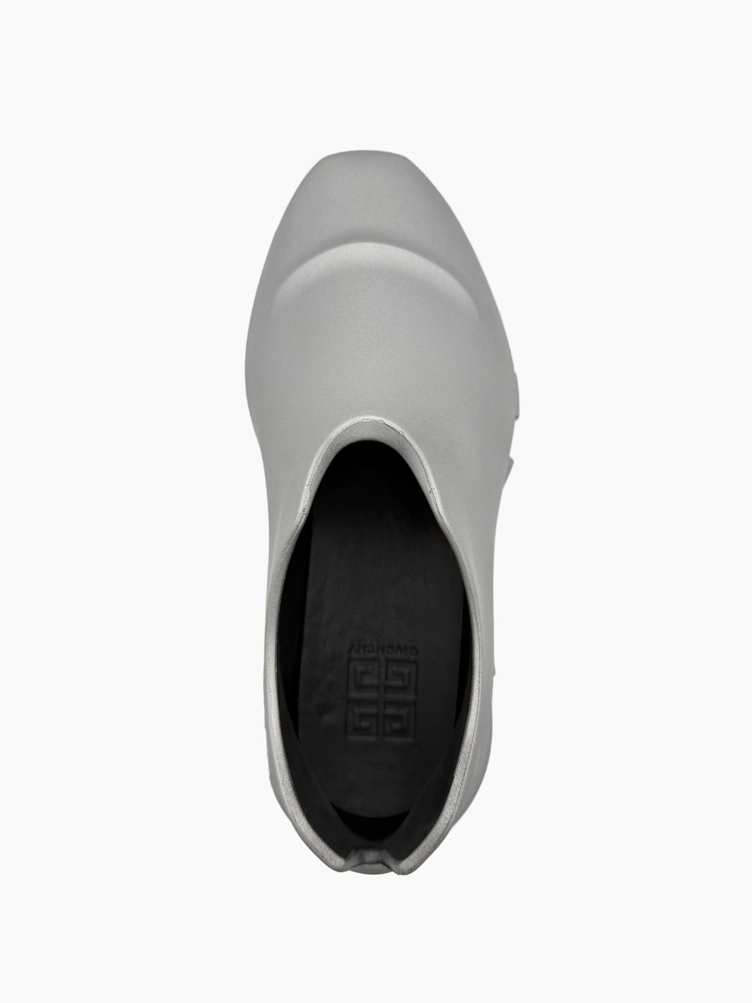 Givenchy's sculptural, futuristic slip-on is crafted from a single rubber construction with a matte silver finish. The wraparound silhouette and chunky sole make this shoe a bold, contemporary choice for those seeking a unique, distinctive style. The embossed logo on the insole completes the look with a luxurious touch.