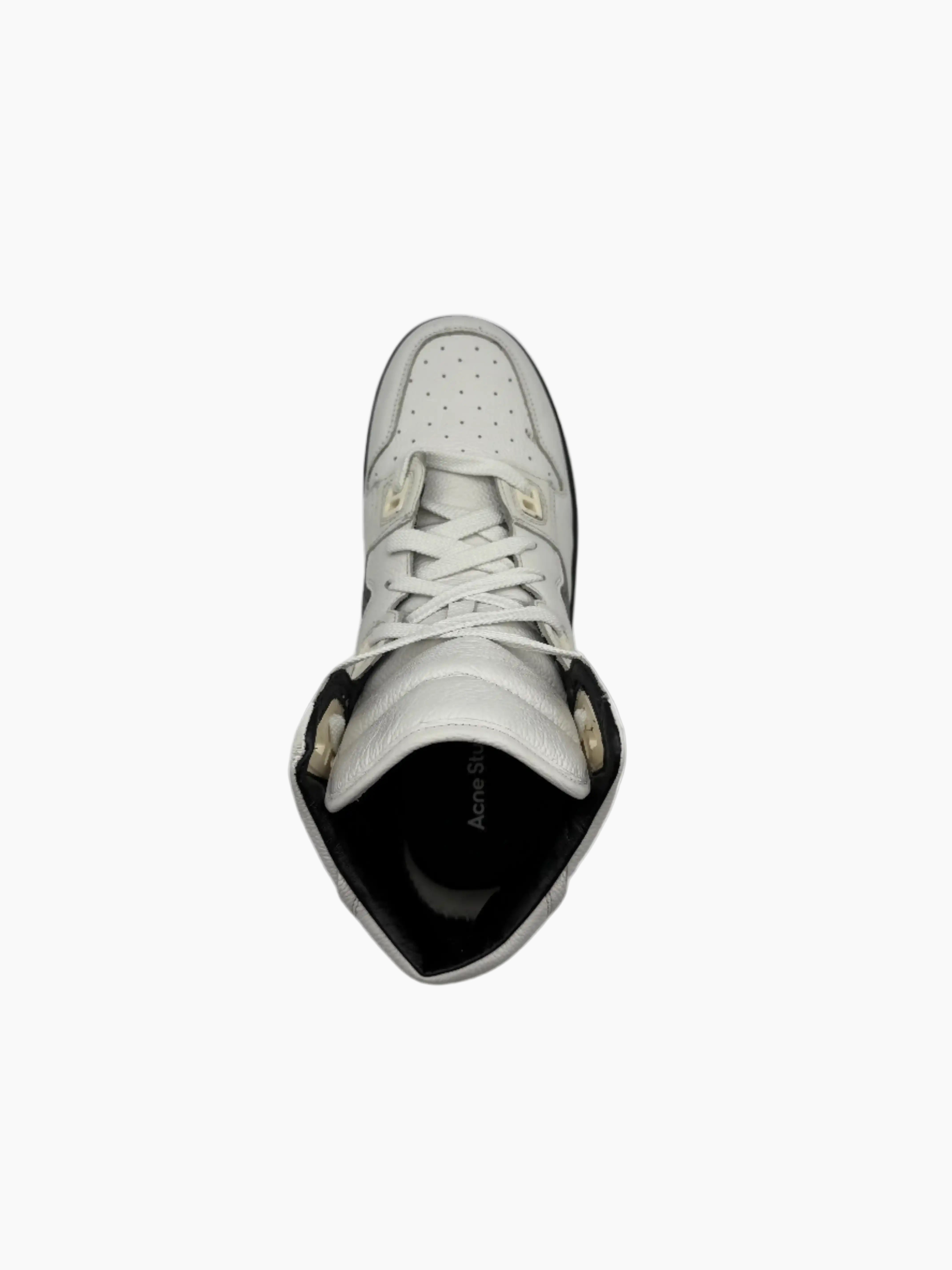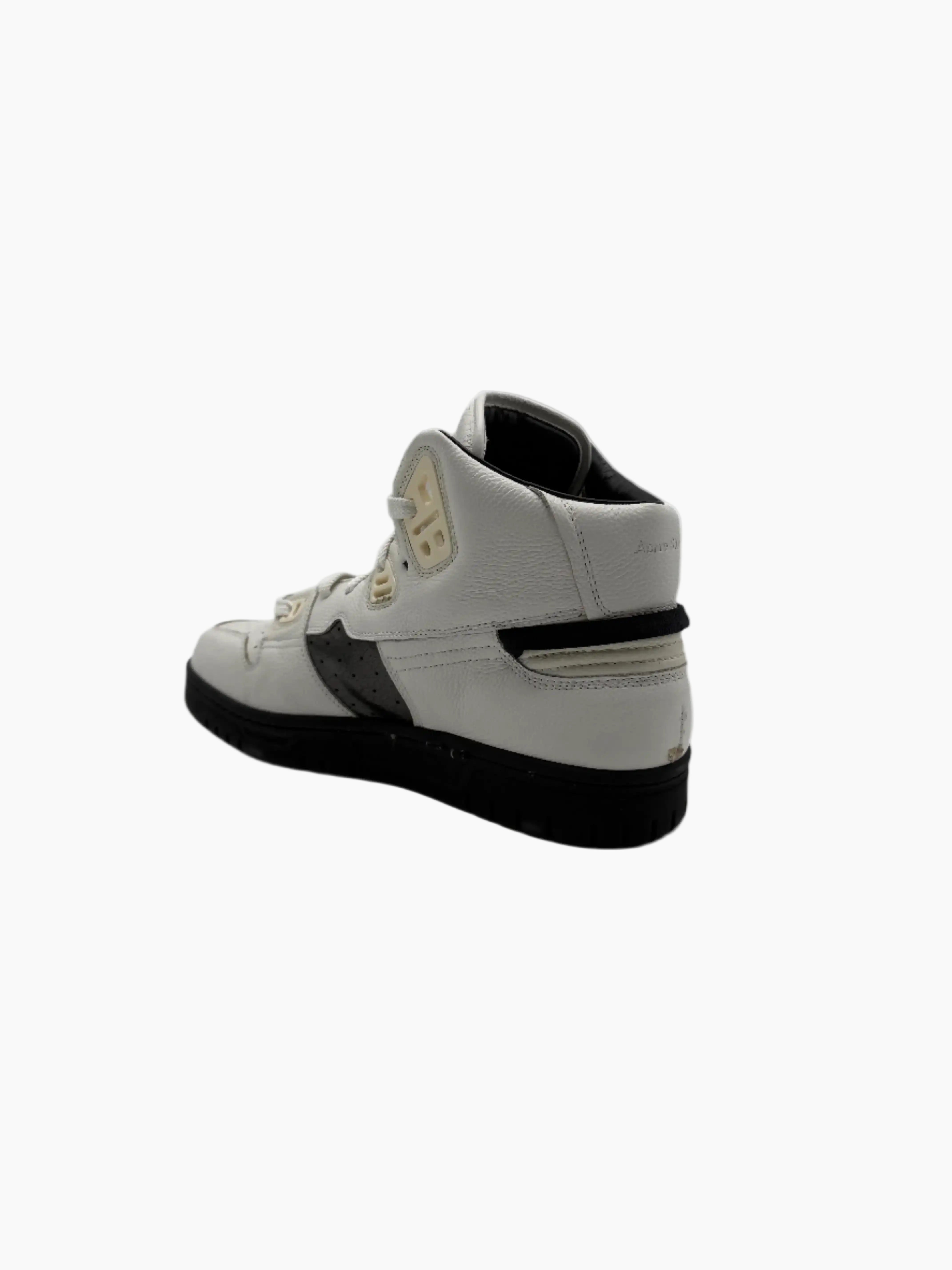 The High Pop sneakers from Acne Studios reinterpret basketball style with a minimal and contemporary aesthetic. Crafted from white premium leather with contrasting black inserts, they feature perforated details, a black rubber sole and subtle branding on the side. A refined high-top model, perfect for those who want a sophisticated streetwear look.