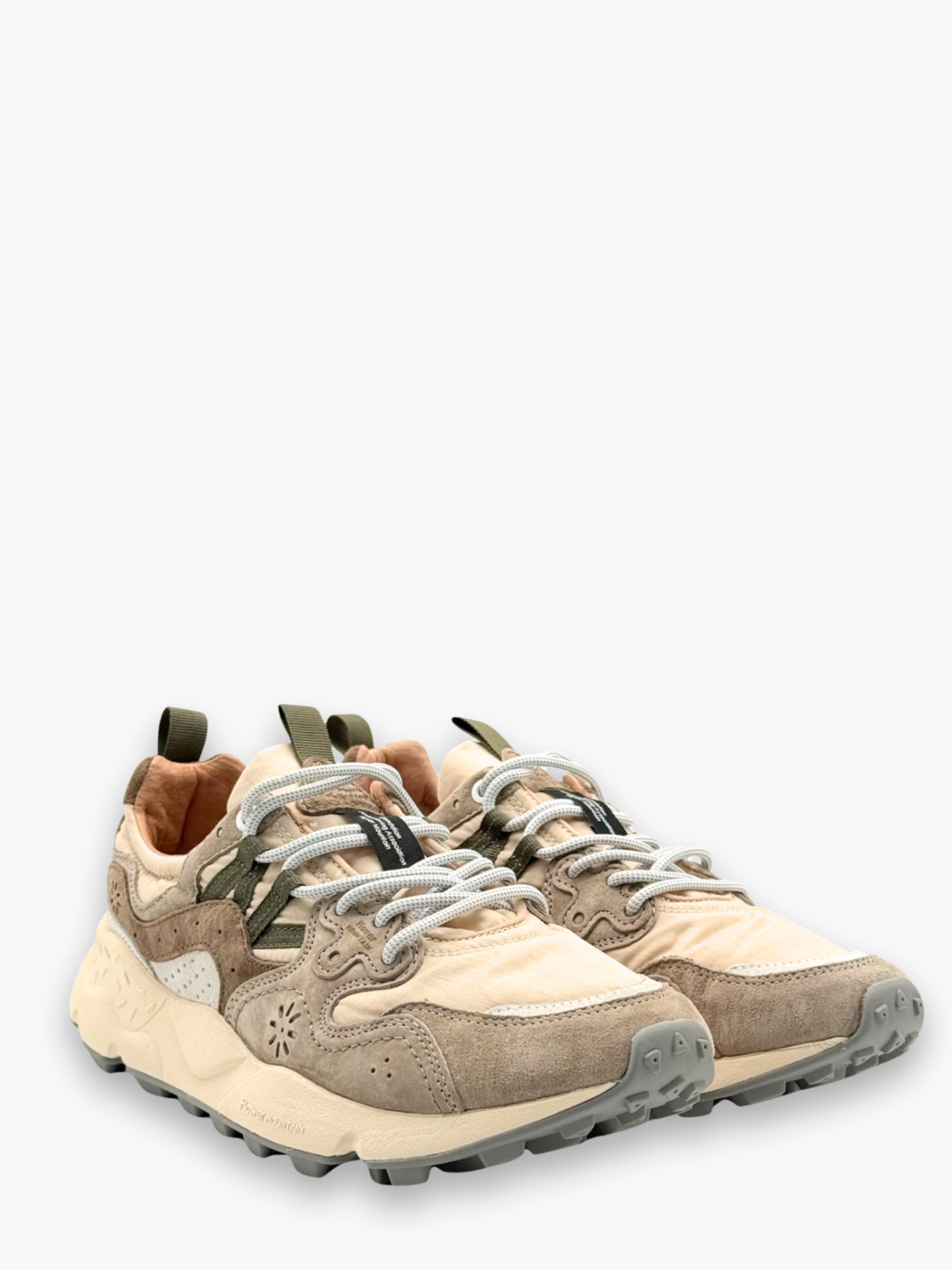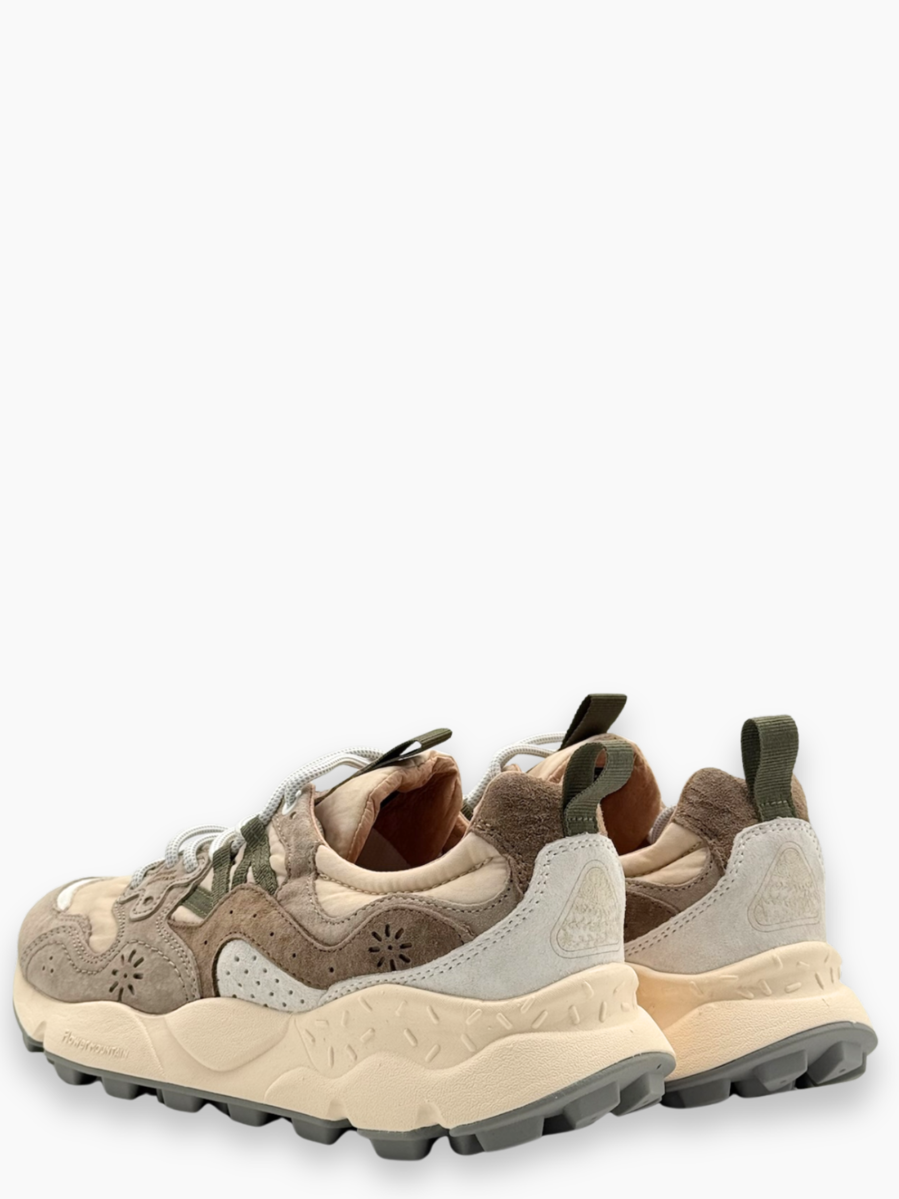 Sneakers in tonalità naturali realizzate con una combinazione di pelle, nabuk e inserti tecnici, pensate per un look contemporaneo e funzionale. La palette beige, tortora e marrone si unisce a dettagli traforati e sovrapposizioni multistrato, creando un design dinamico e ricercato. La suola chunky scolpita garantisce comfort e stabilità, rendendole ideali per outfit casual, outdoor o streetwear moderno.