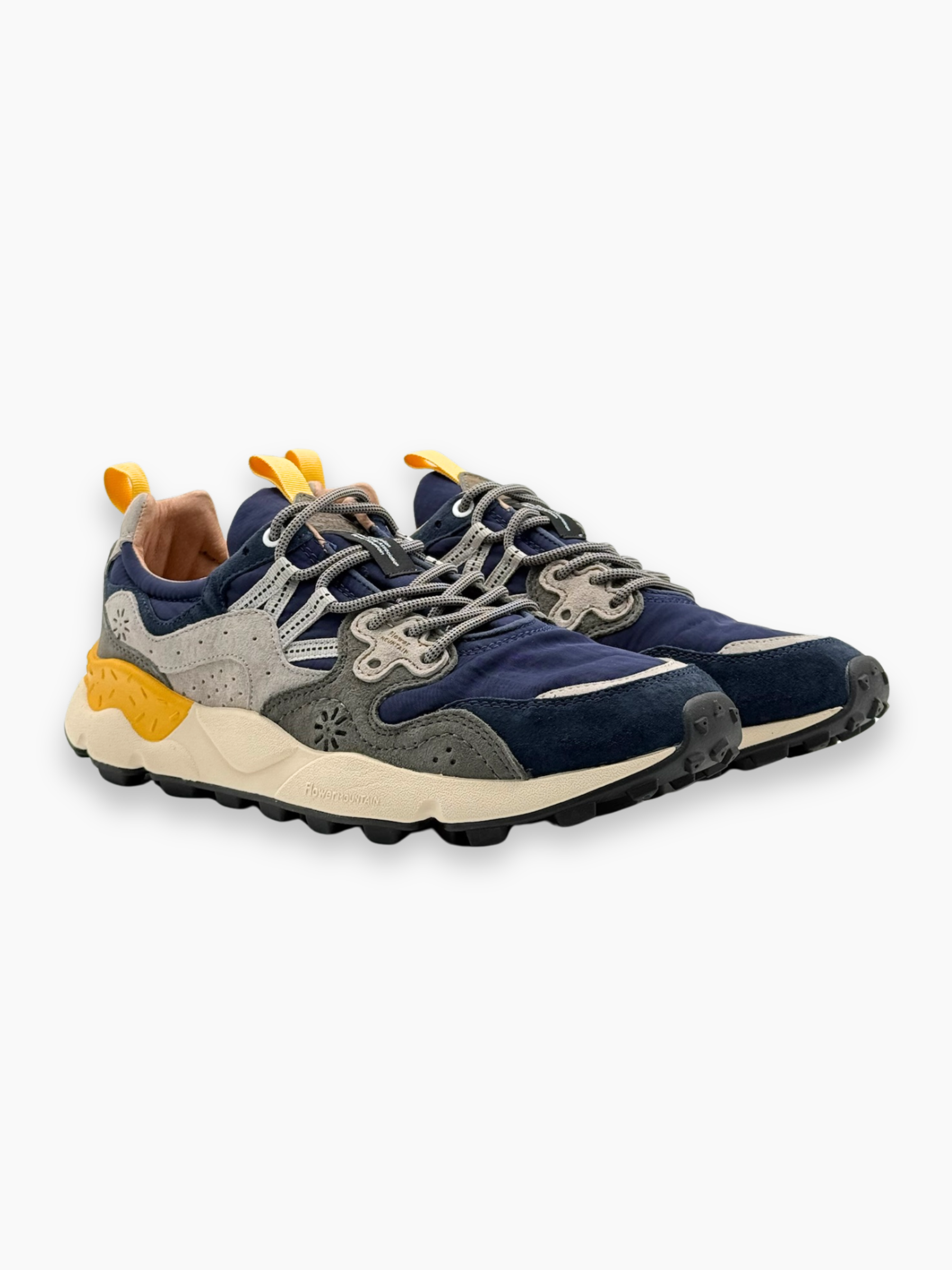 Sneakers dal design contemporaneo che combina tonalità blu, grigie e dettagli giallo ocra per un look dinamico e ricercato. La tomaia mixa pelle scamosciata, nabuk traforato e inserti in nylon tecnico, offrendo resistenza e comfort. La suola chunky chiara assicura stabilità e un’estetica moderna, mentre i lacci tecnici e le sovrapposizioni multistrato aggiungono carattere sportivo. Una sneaker perfetta per outfit streetwear e casual di tendenza.