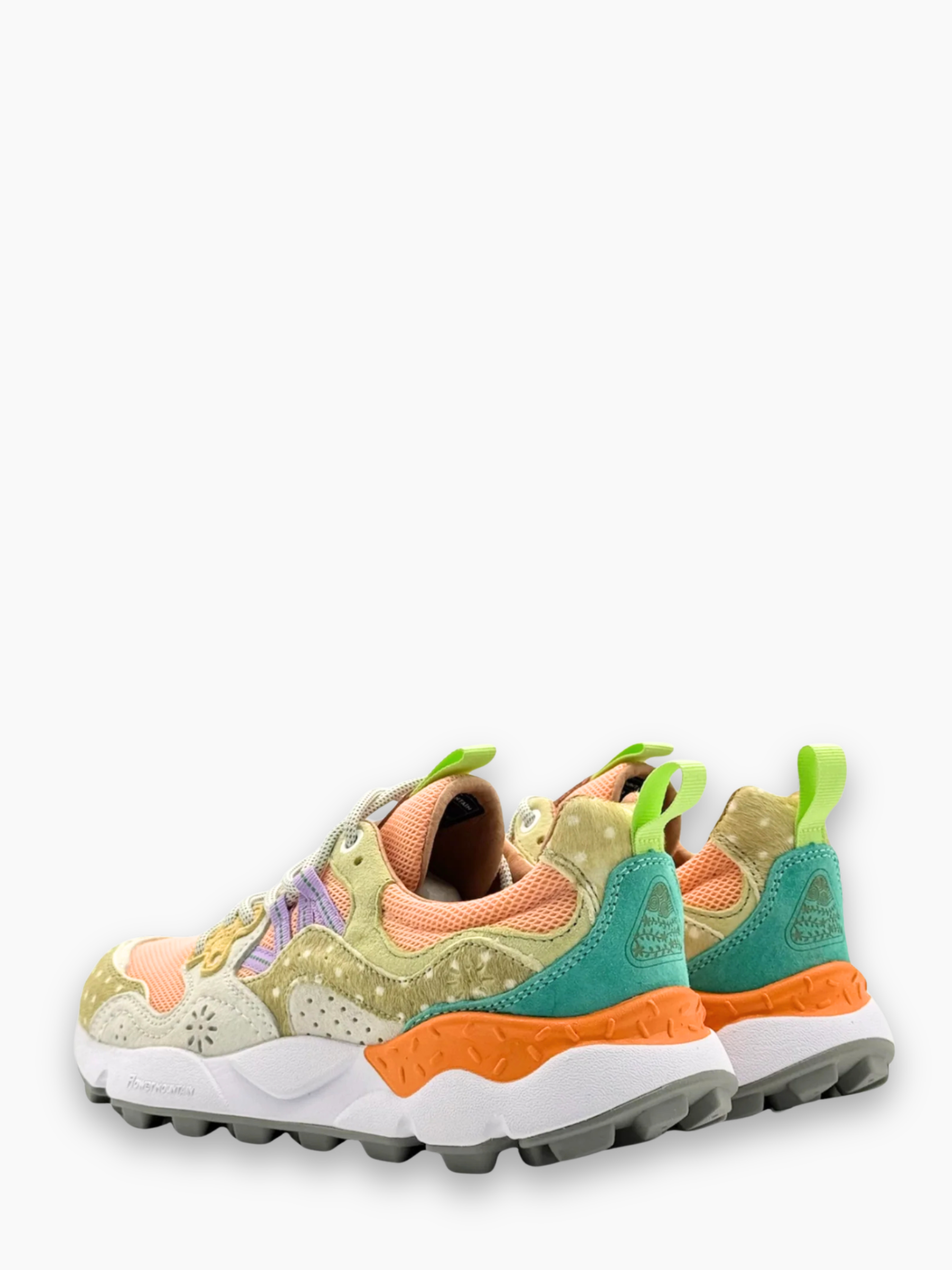 Sneakers multicolore dallo stile vivace e dinamico, realizzate con una combinazione di pelle, nabuk traforato e mesh traspirante. La palette cromatica unisce toni pesca, verde, lilla e arancione, creando un look fresco e contemporaneo. La suola chunky scolpita garantisce comfort e stabilità, mentre i lacci tecnici e i dettagli sovrapposti aggiungono un carattere sportivo e moderno. Perfette per outfit streetwear e casual con un tocco ricercato.