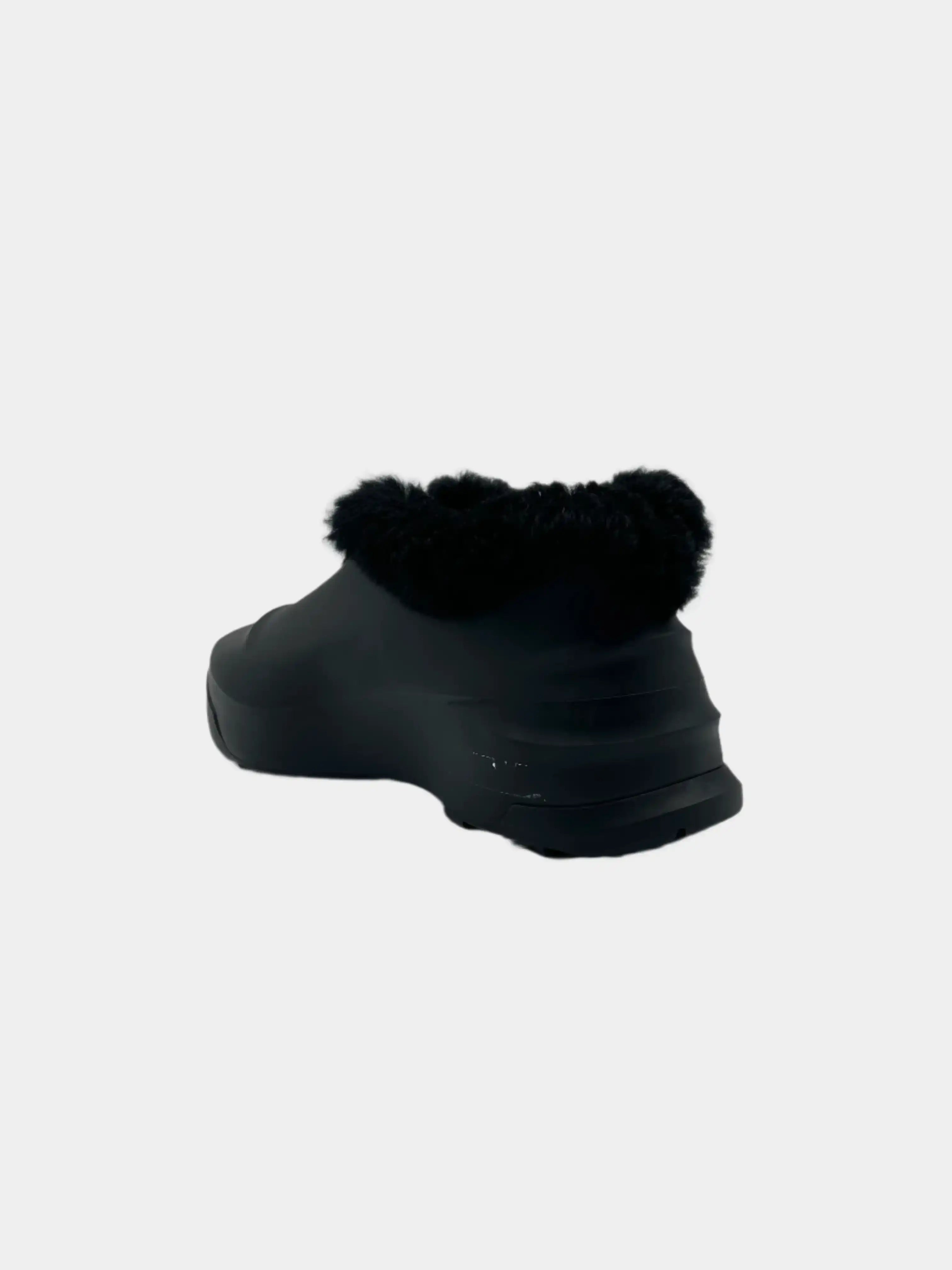 The Givenchy Monumental Mallow ankle boots in sabot version represent the perfect meeting between practicality and contemporary design. Crafted from 100% black rubber, they are enriched by a soft ton sur ton fur-effect inner lining, which offers comfort and protection on the coldest days. The sculpted and voluminous sole gives an urban and decisive twist to a model designed for a modern and casual style.