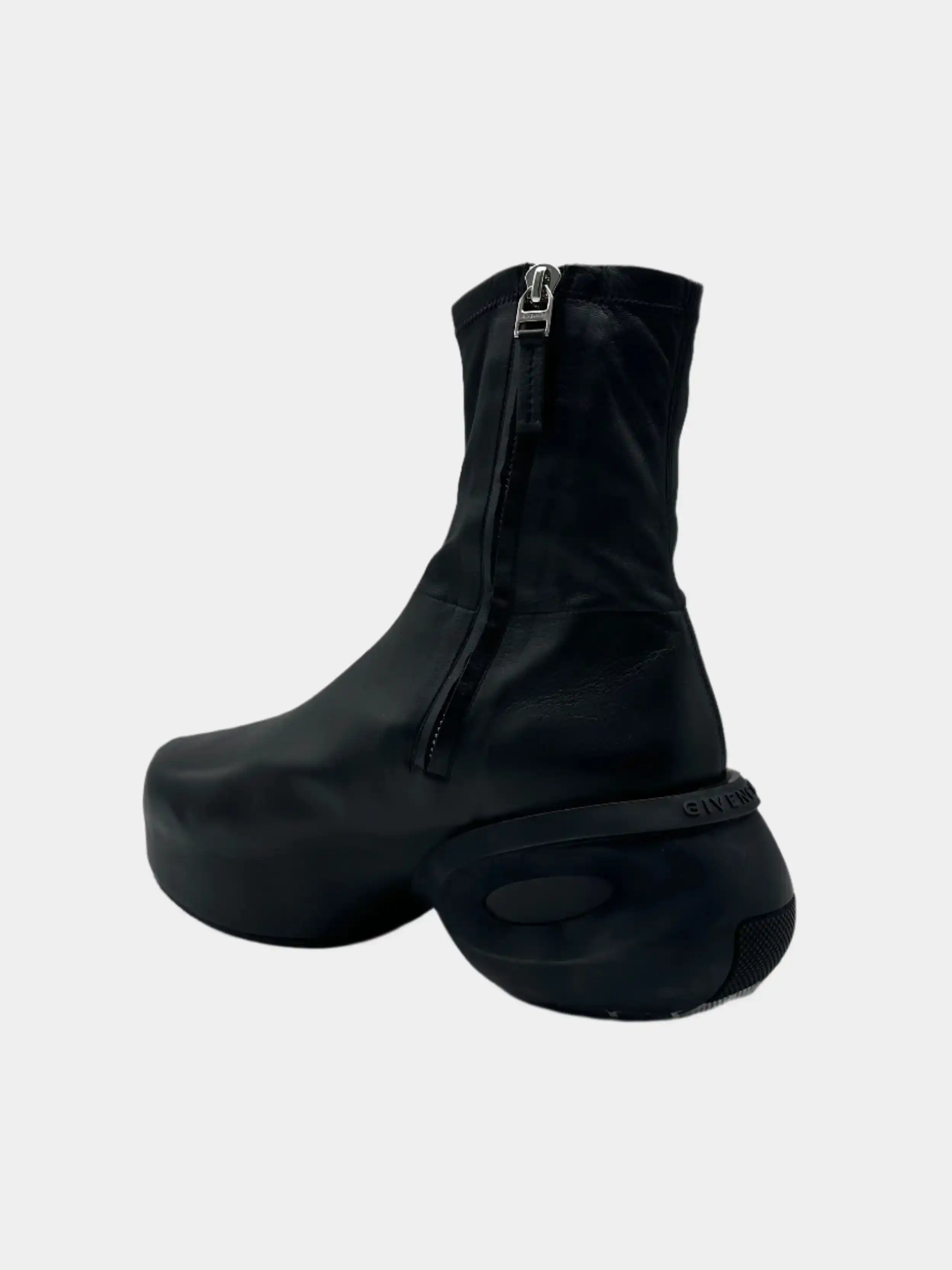 These black boots by Givenchy combine stylistic innovation and high-quality materials. Crafted from soft lambskin, they stand out for their minimalist design and modern silhouette, complemented by a flat sculptural sole and ergonomic details. The side zip ensures a practical and enveloping fit, perfect for an impactful and contemporary look.