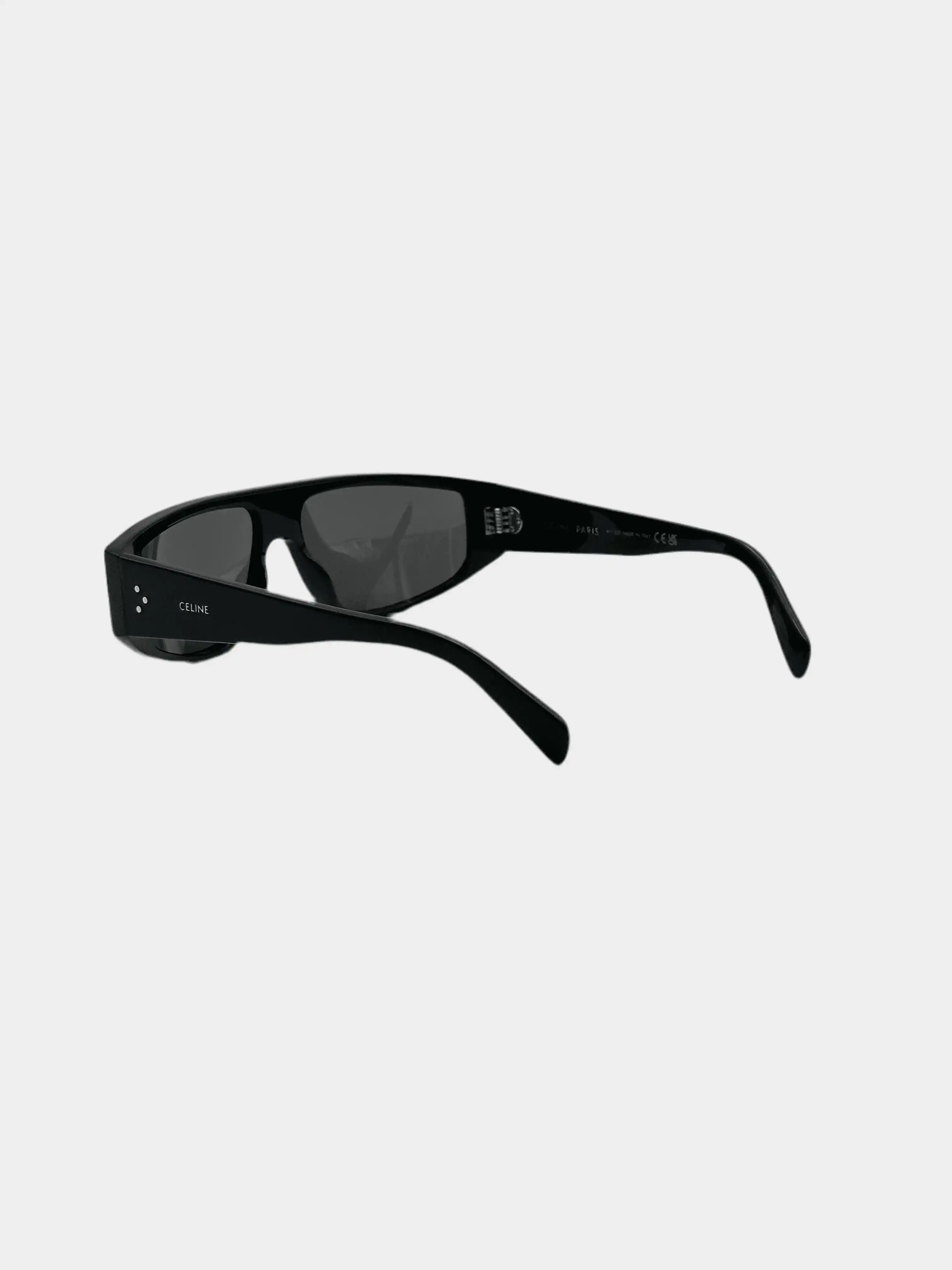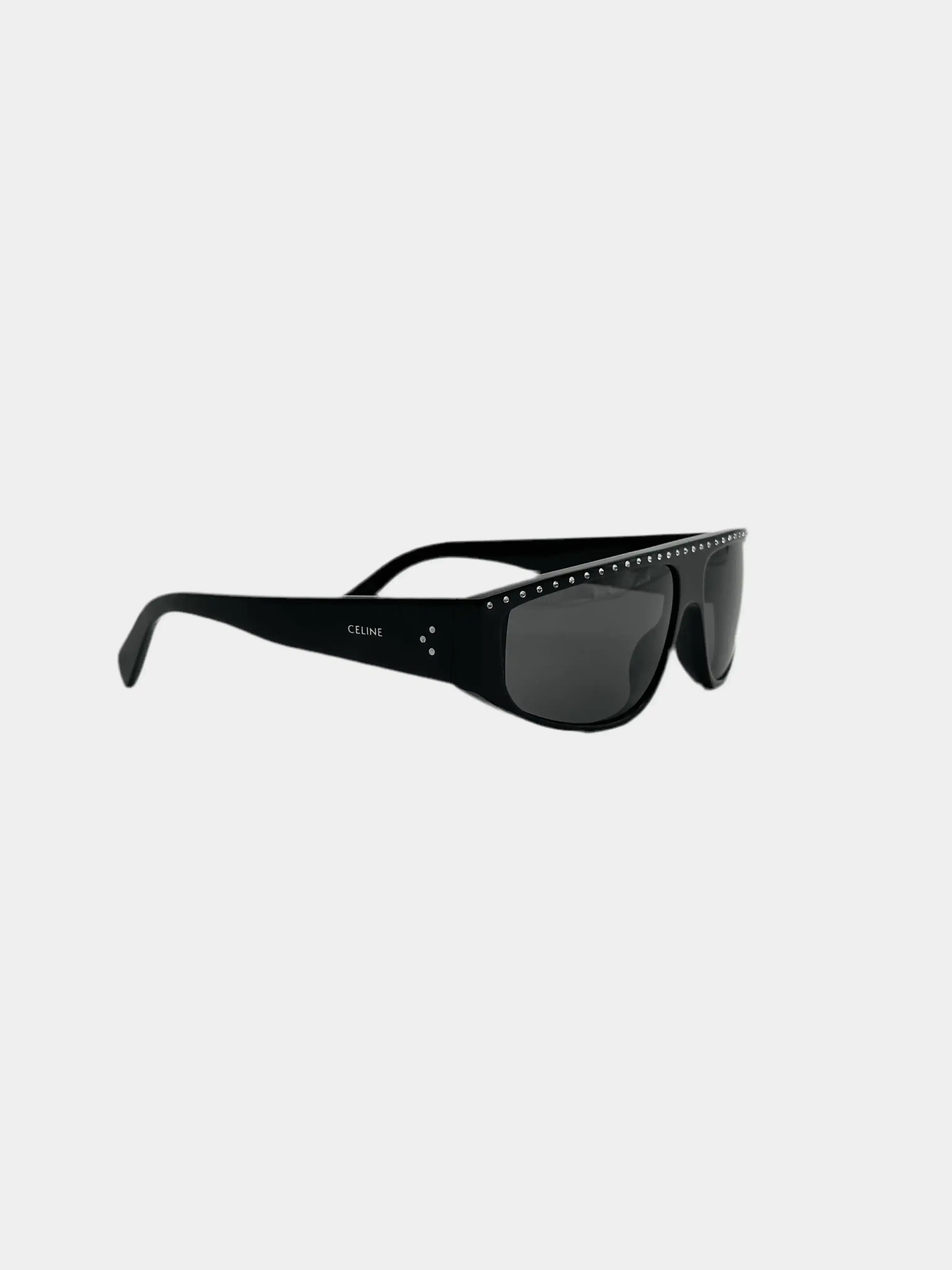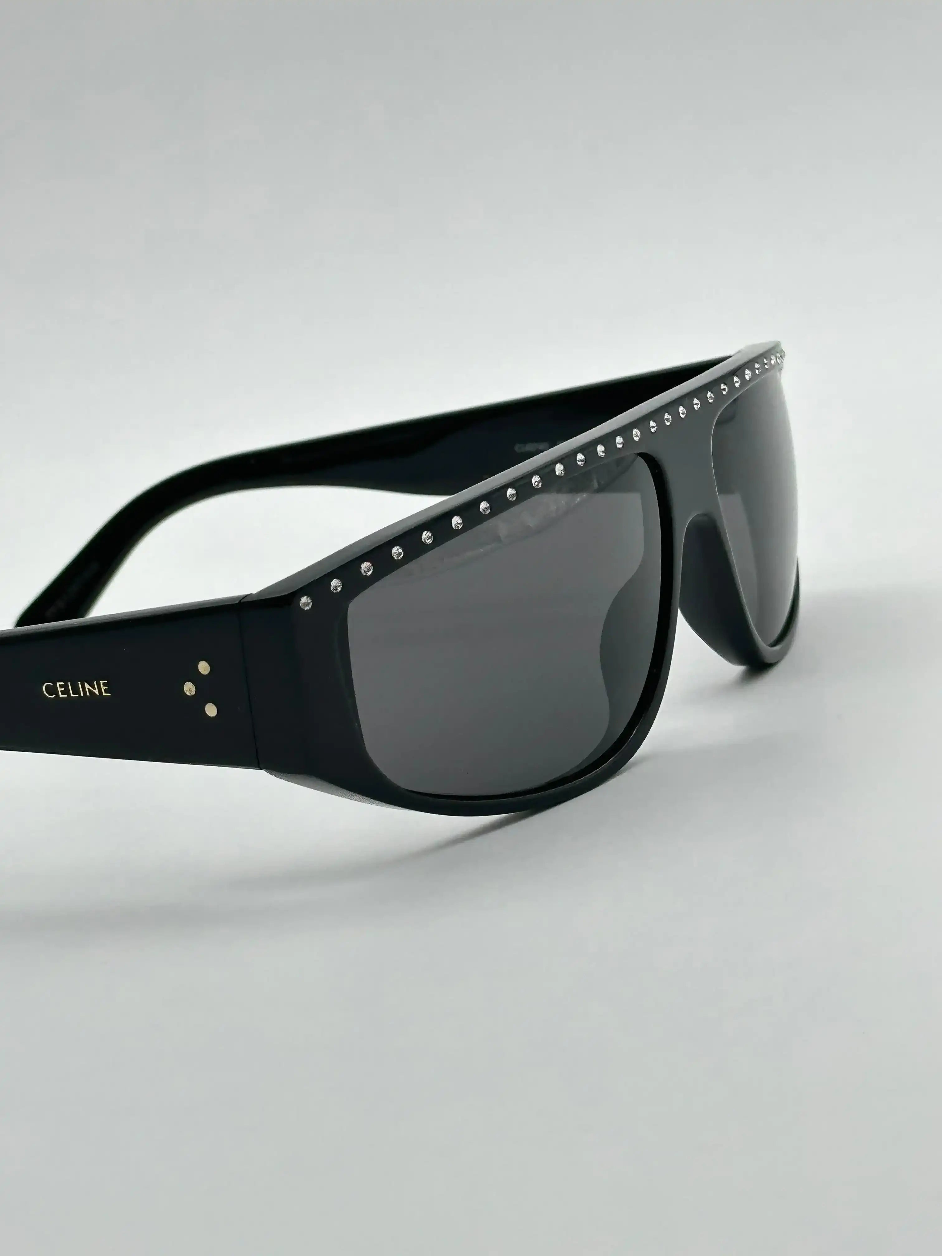 - Brand's signature dots and logo on temples