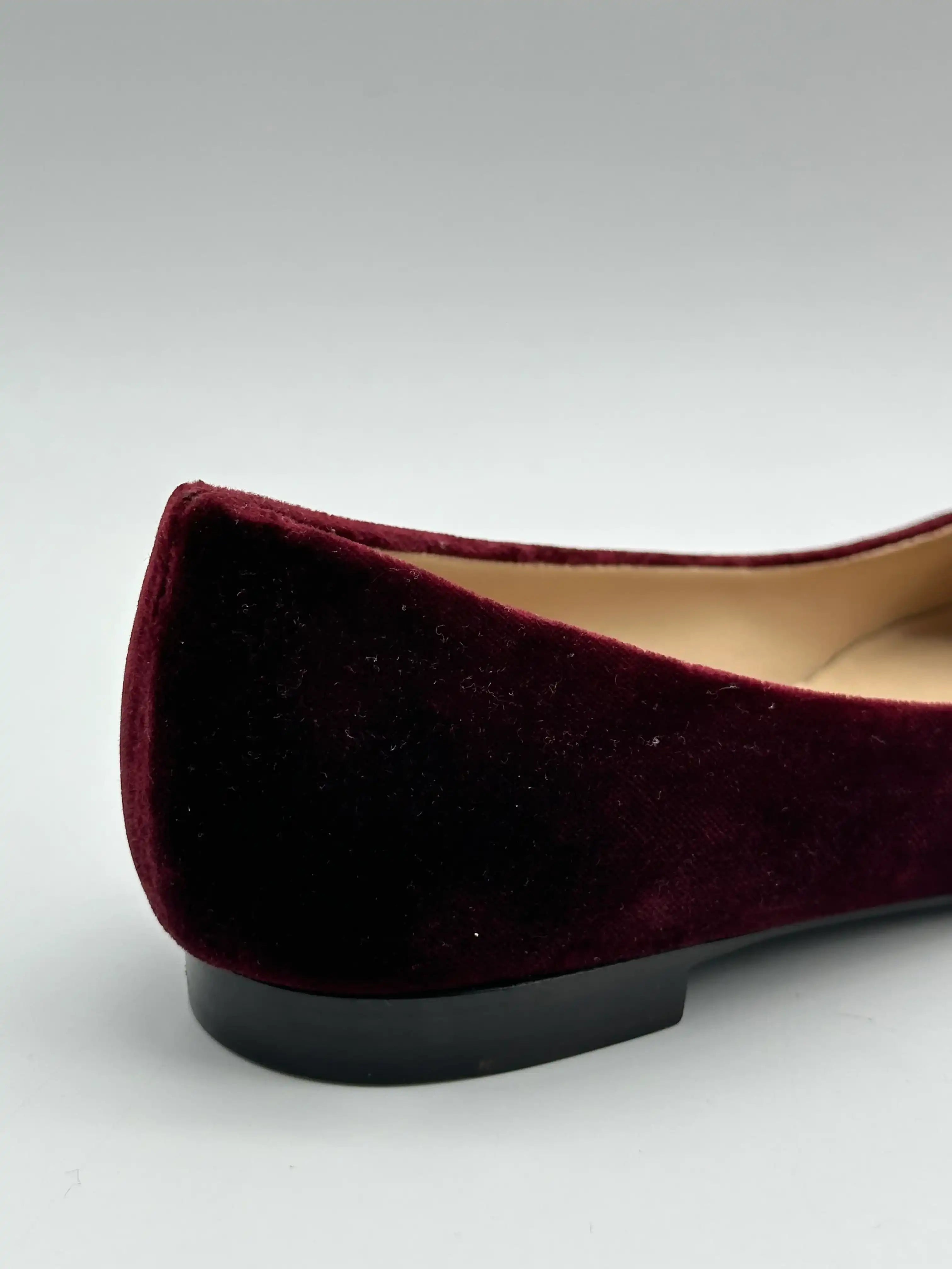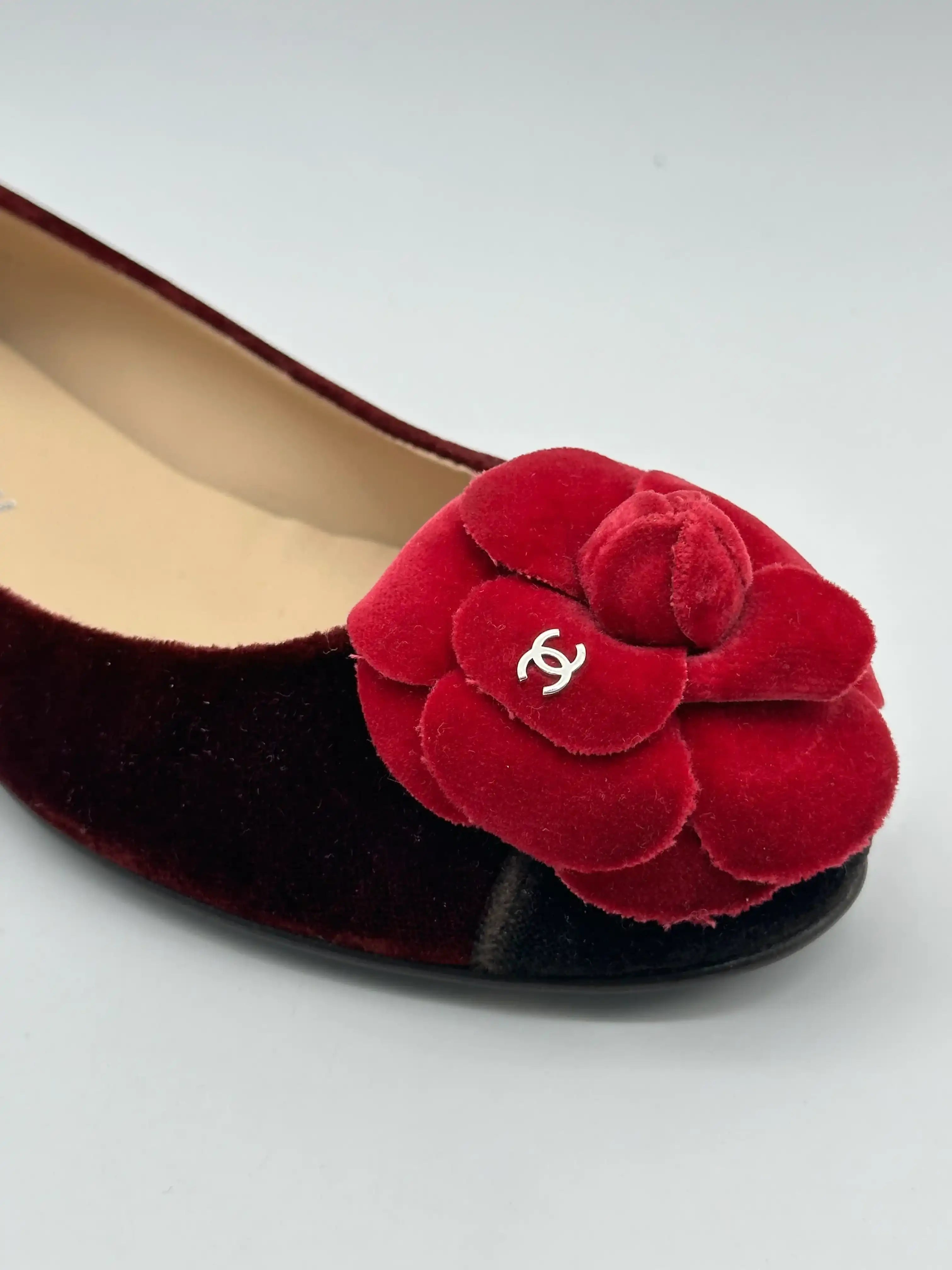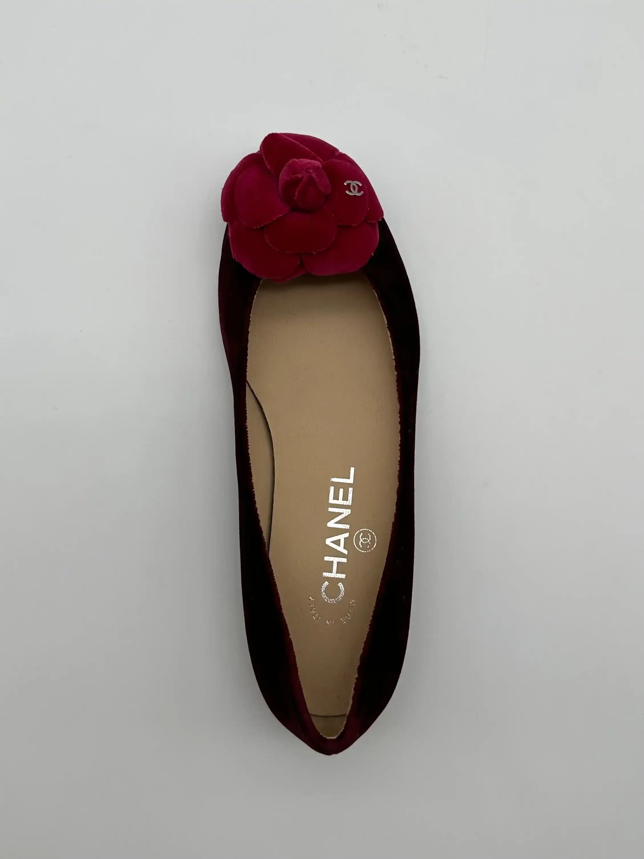 Queste ballerine firmate Chanel uniscono raffinatezza e femminilità in un design intramontabile. Realizzate in velluto bordeaux, presentano una punta a contrasto e un fiore decorativo applicato, impreziosito dal piccolo logo metallico della Maison. Perfette per completare look sofisticati con un tocco iconico.