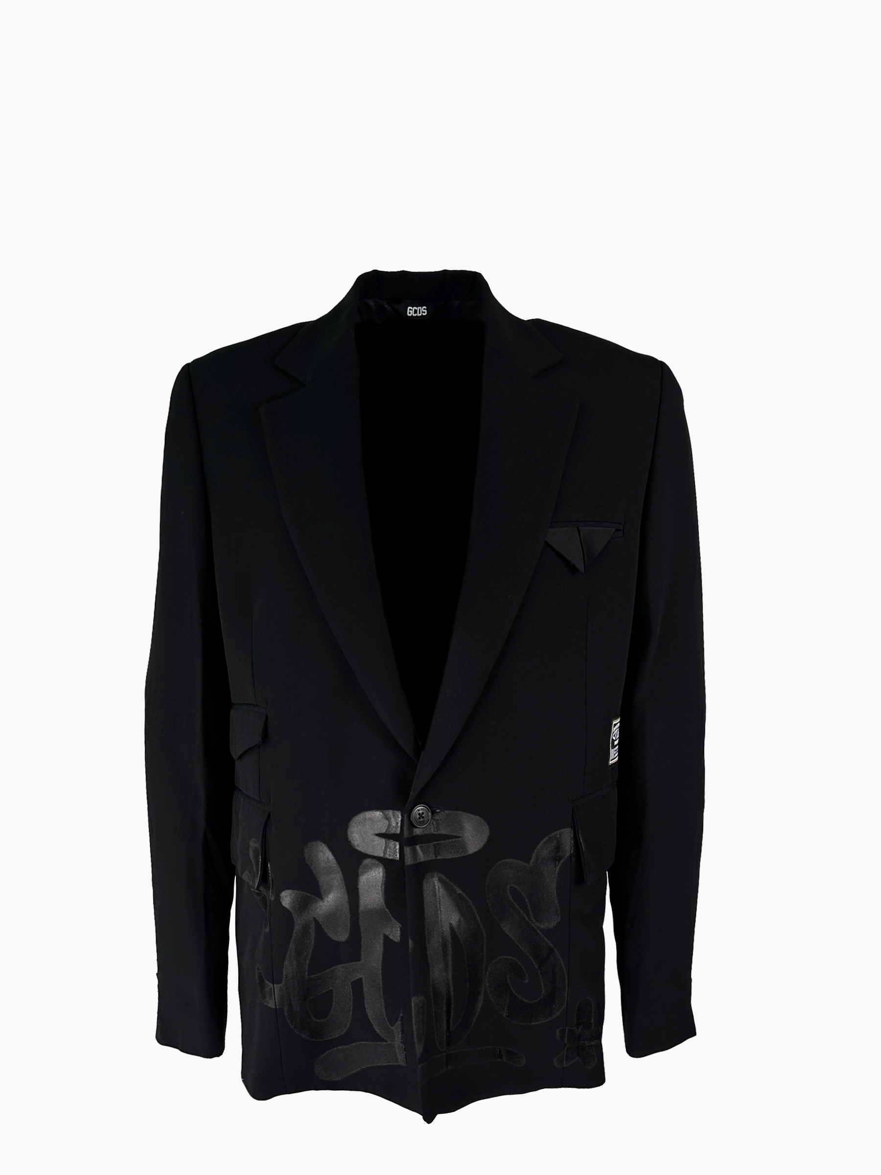 Blazer nero dal taglio moderno con grafica GCDS effetto spray sul fondo. Il modello presenta una costruzione strutturata, revers classici, tasche applicate e chiusura frontale a un bottone. L’interno foderato assicura comfort e vestibilità impeccabile, mentre il dettaglio grafico dona un’identità bold e contemporanea.