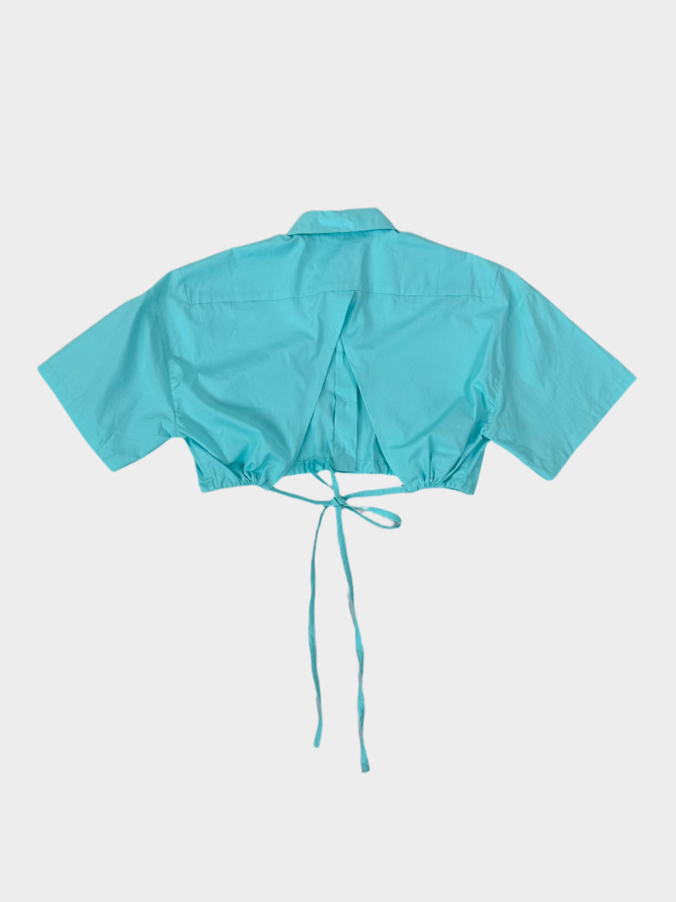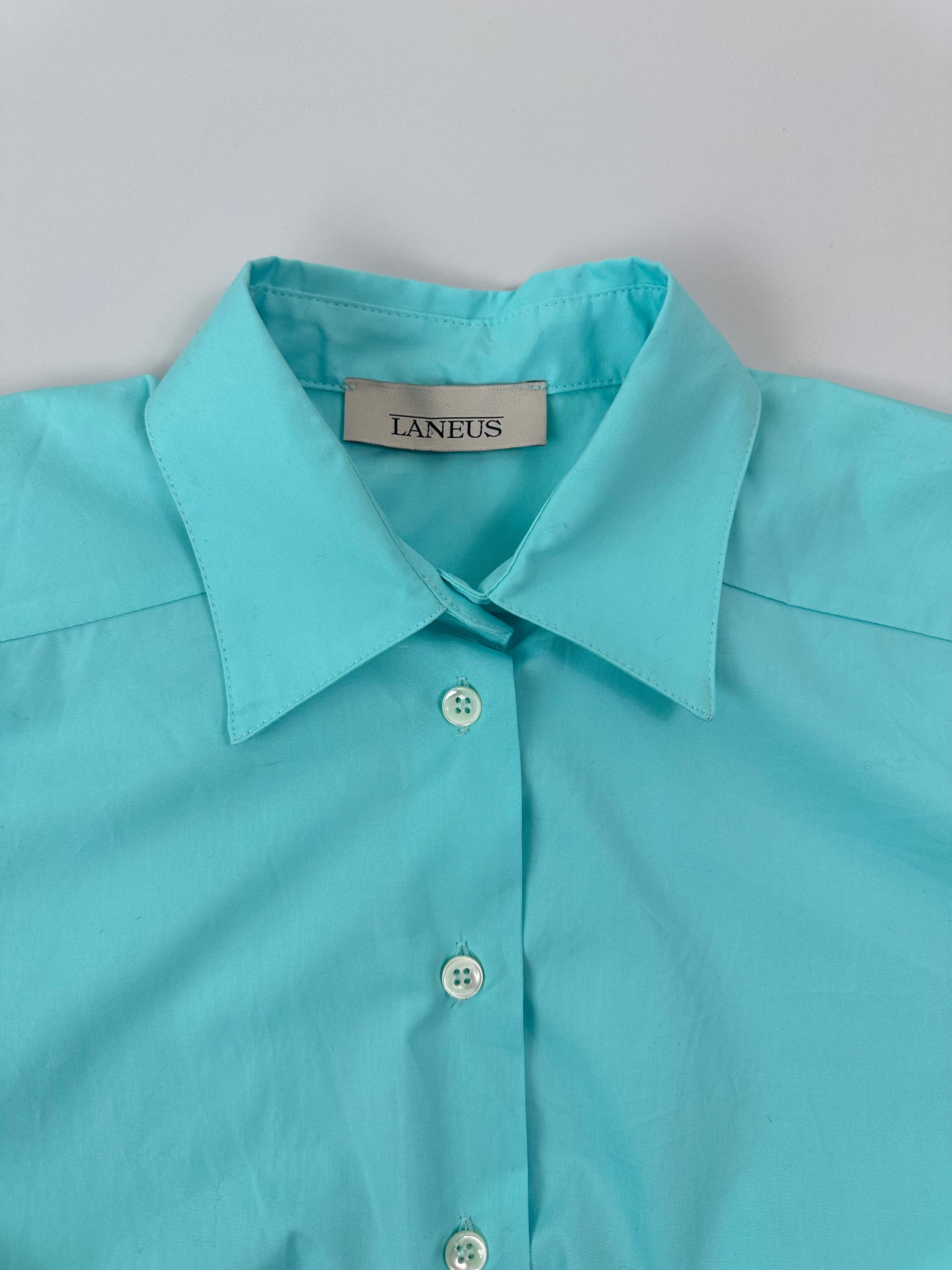 Camicia in maglia firmata Laneus, realizzata in una sofisticata tonalità acqua con laccio regolabile sul retro. Il design a maniche corte con colletto classico e chiusura frontale dona al capo un look fresco e versatile. Ideale da indossare aperta su una t-shirt o da sola per un outfit più audace e di tendenza.