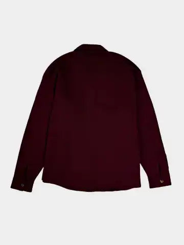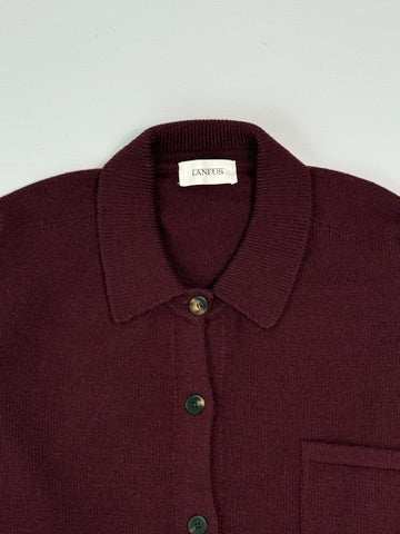 Camicia in maglia bordeaux firmata Laneus, realizzata in un filato morbido e caldo. Il modello presenta un design essenziale con colletto classico, tasca applicata sul petto e chiusura frontale con bottoni a contrasto. Il taglio regular e la lunghezza asimmetrica rendono il capo perfetto da indossare sia come camicia che come leggero over-shirt.