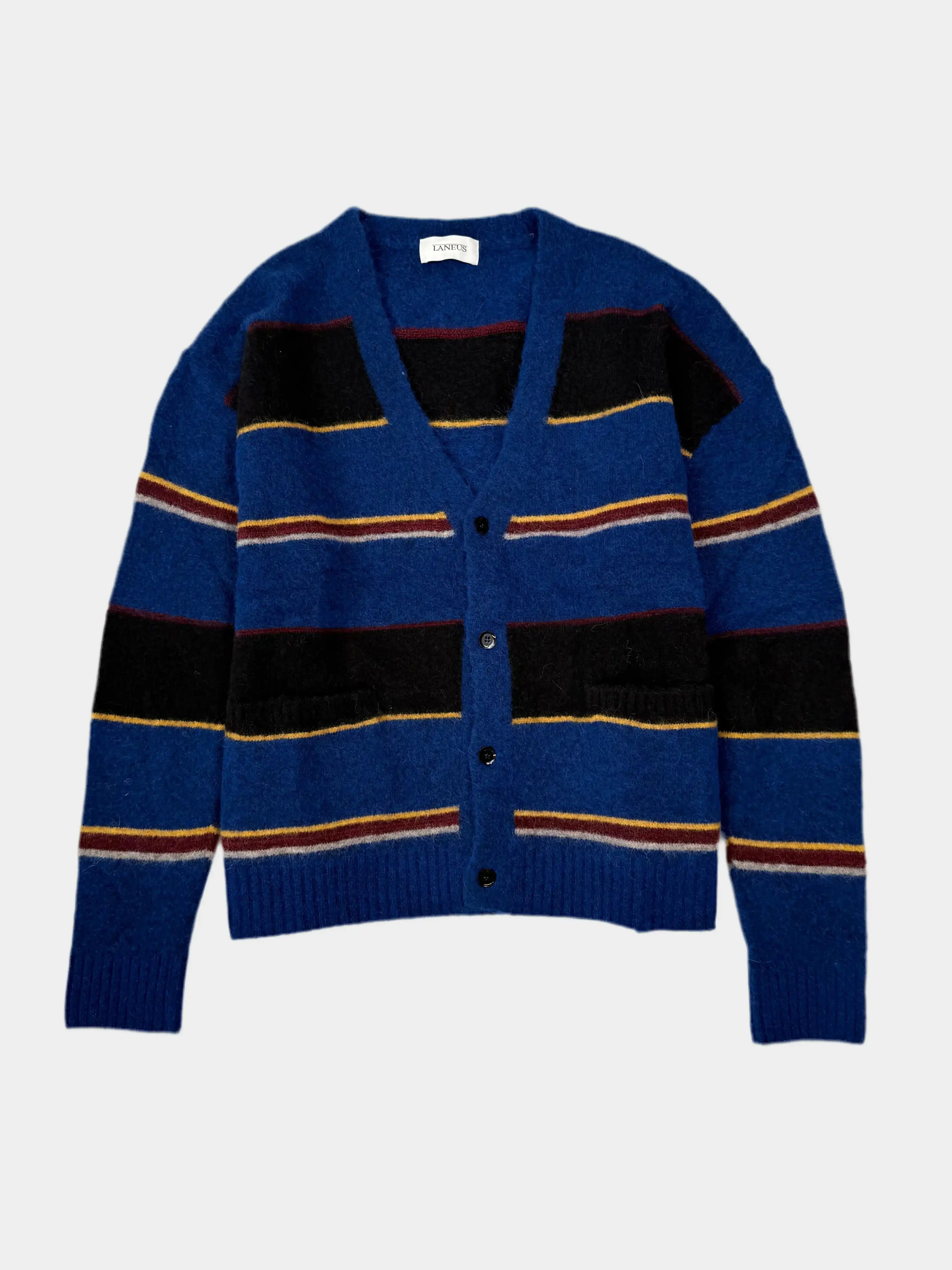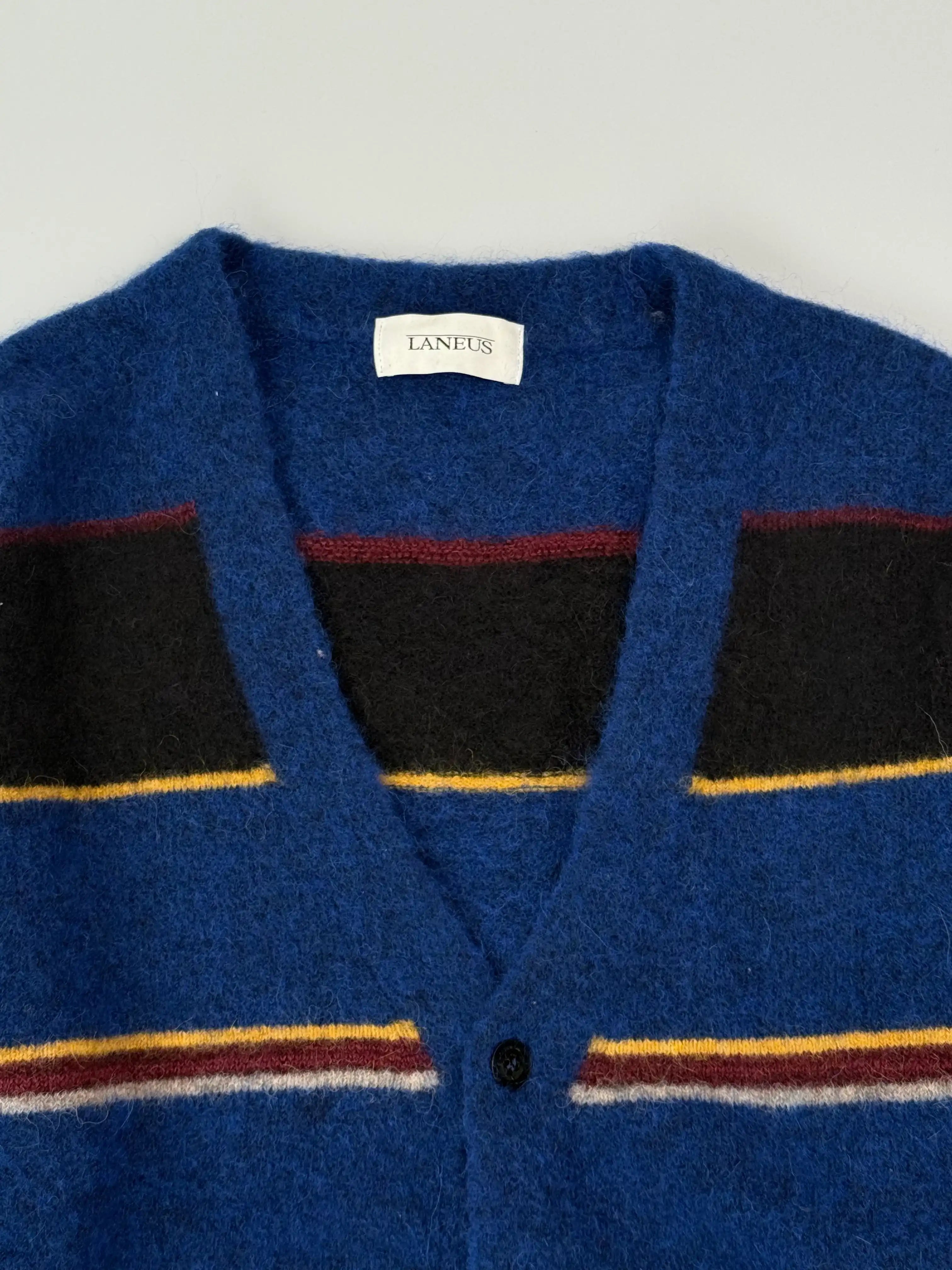Questo cardigan firmato Laneus unisce stile vintage e comfort moderno. Realizzato in morbida lana spazzolata, presenta un design a righe orizzontali nei toni del blu, nero, bordeaux, giallo e bianco. Il taglio rilassato con chiusura frontale a bottoni e tasche applicate lo rende un capo ideale per completare con carattere i look di stagione.