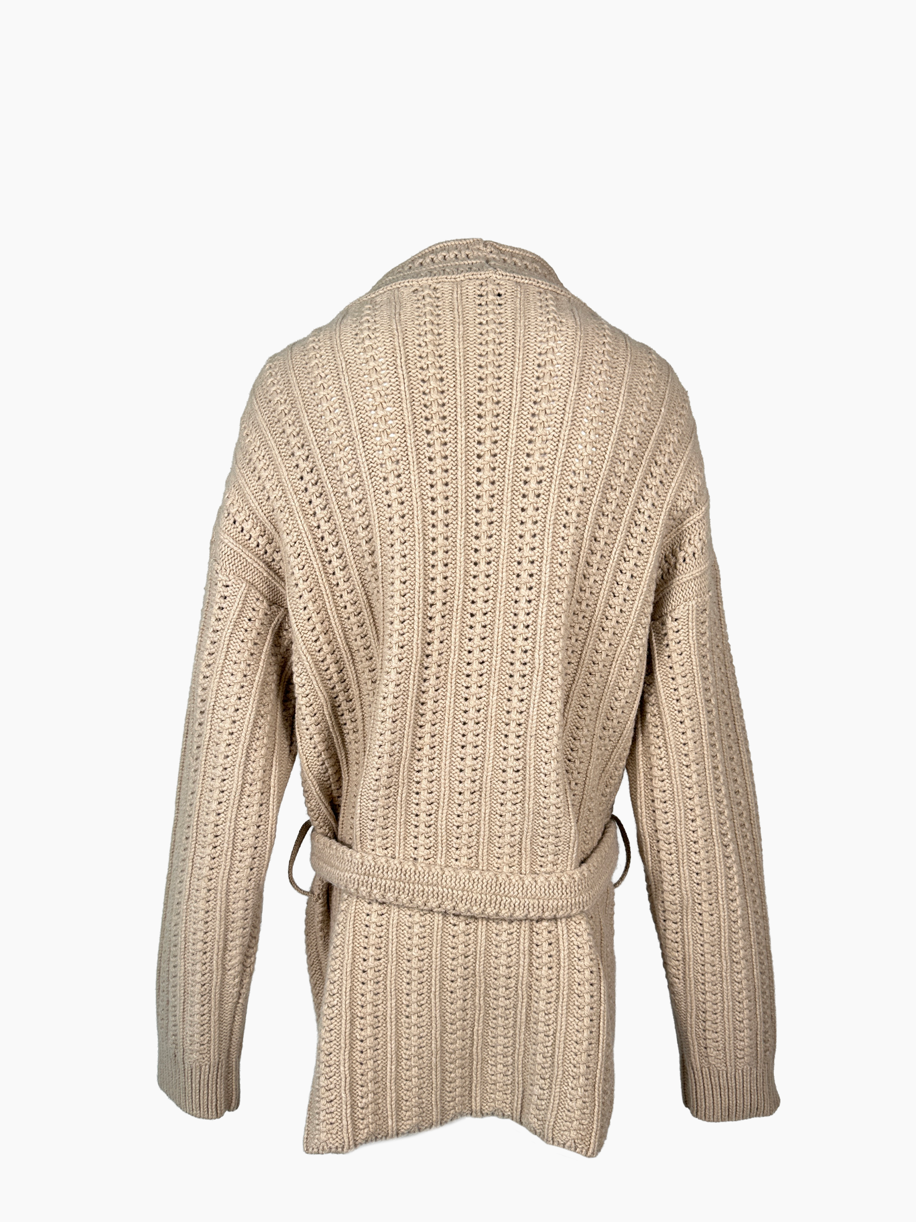 Questo cardigan in 100% lana vergine è la perfetta combinazione tra calore e stile. Il design a maglia spessa con motivo intrecciato e la cintura coordinata in vita lo rendono un capo ideale per le mezze stagioni o per un look rilassato e sofisticato da interni. Le tasche applicate e il taglio senza chiusure aggiungono comfort e praticità a un capo senza tempo.