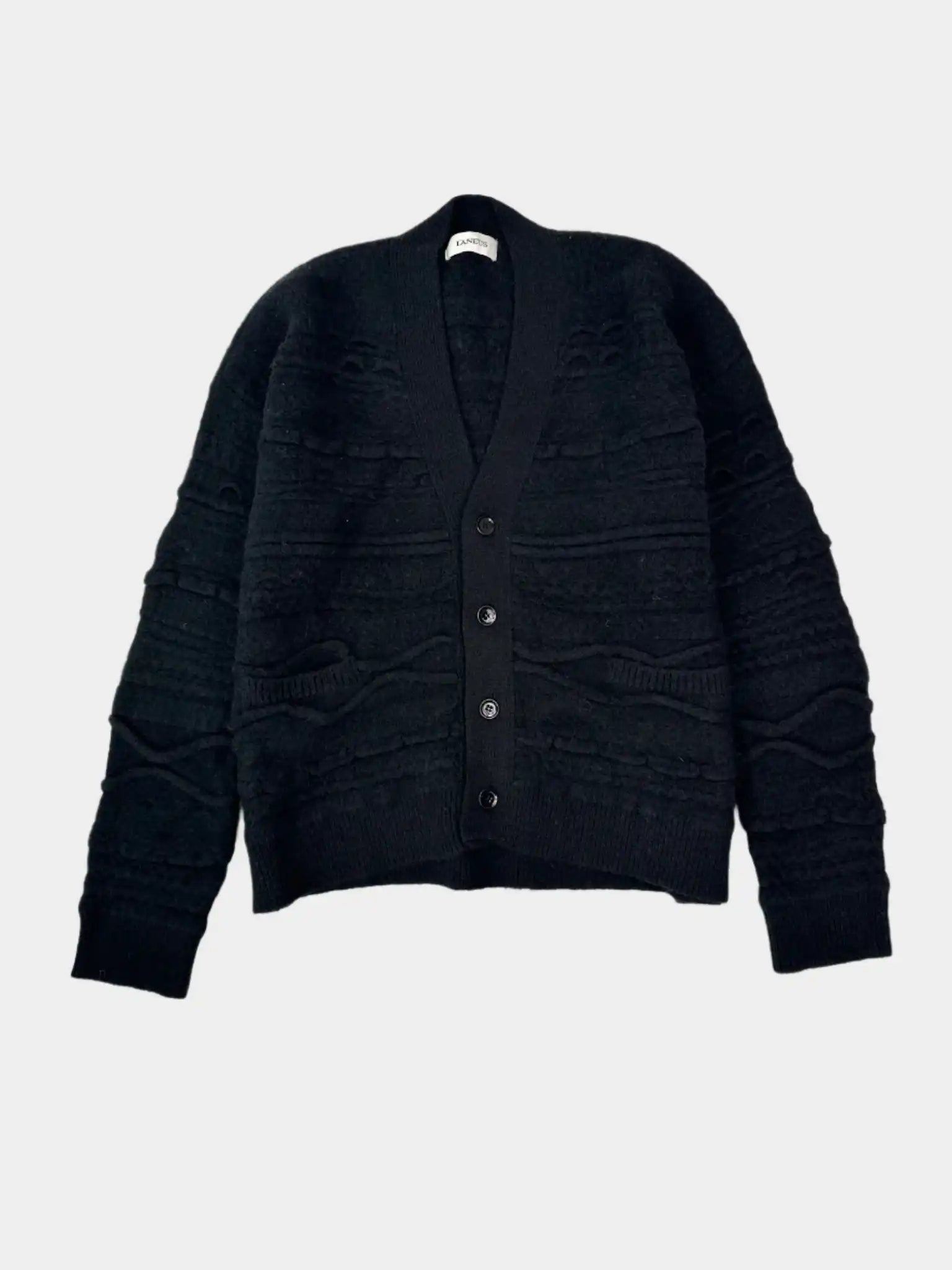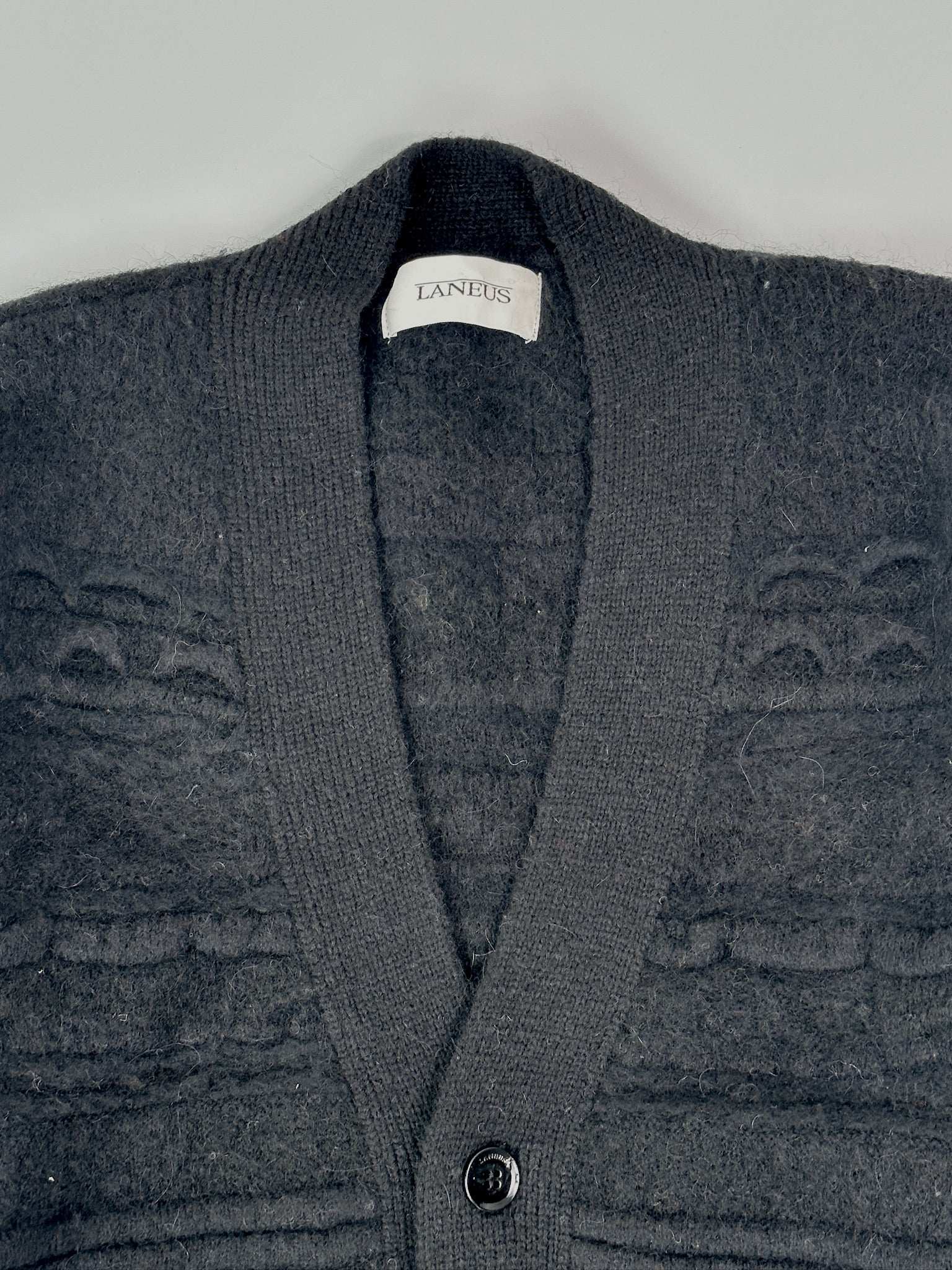 Questo cardigan nero firmato Laneus esprime un'eleganza discreta grazie alla lavorazione materica multistrato che conferisce profondità e carattere al capo. Il design presenta una texture ricca e tridimensionale, con colletto a V e chiusura con bottoni, perfetto da indossare sia con outfit casual che in contesti più sofisticati.