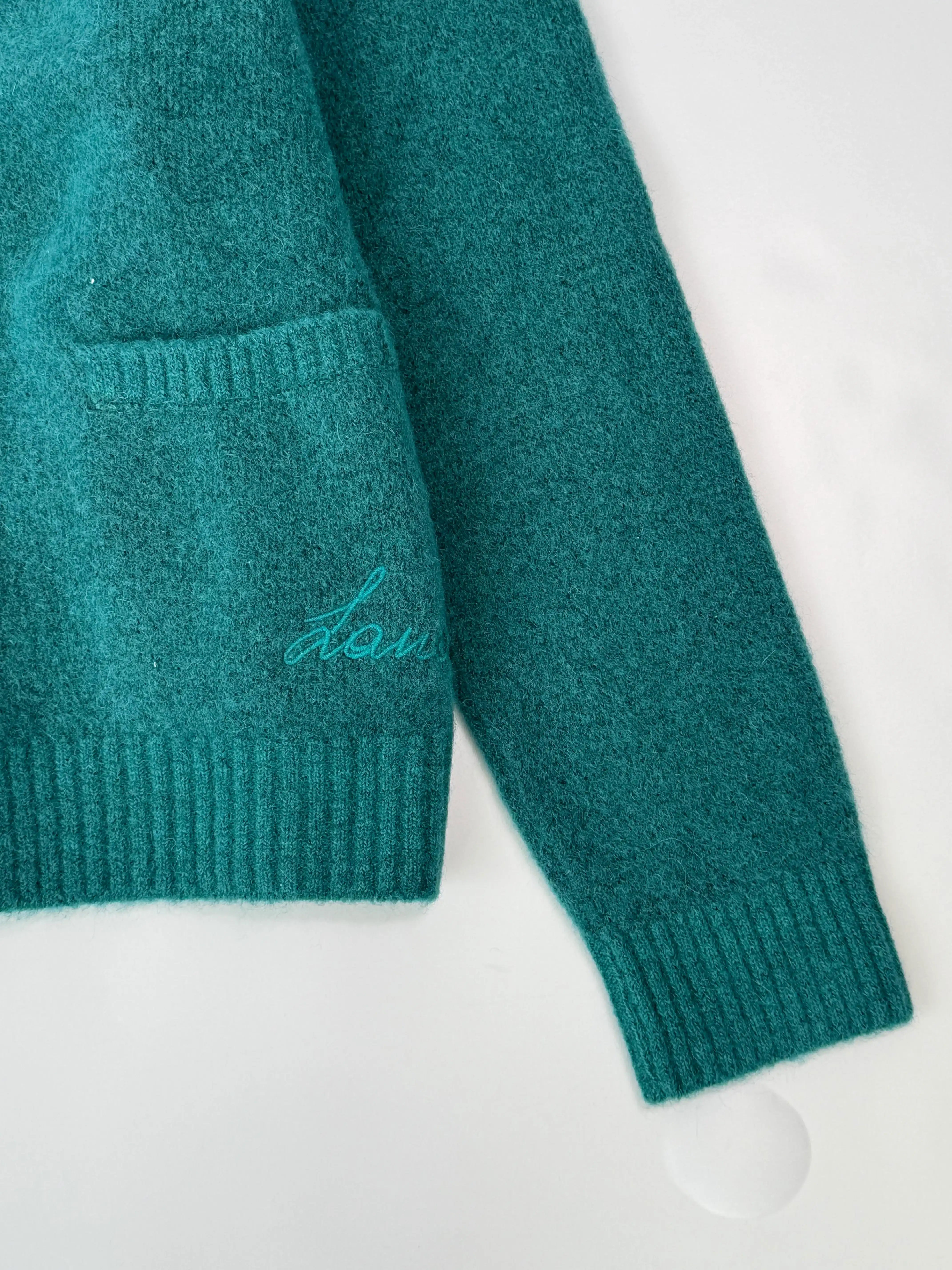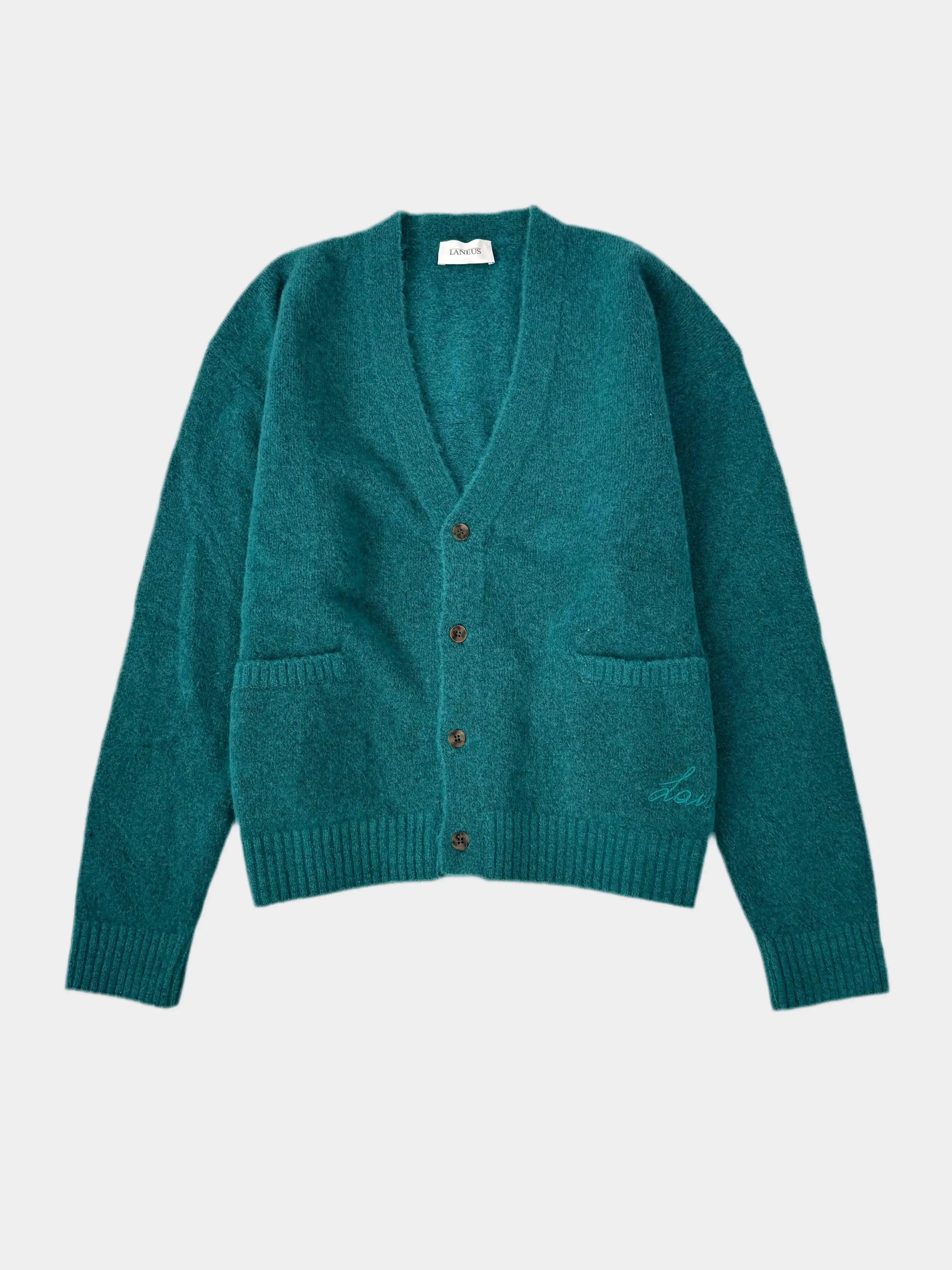 Un cardigan dallo stile rilassato ma sofisticato, firmato Laneus. Realizzato in una calda lana spazzolata turchese, presenta una silhouette morbida con chiusura a bottoni frontale, scollo a V e tasche applicate. Il ricamo tono su tono del logo Laneus aggiunge un dettaglio discreto e raffinato, perfetto per look casual o per stratificazioni eleganti.