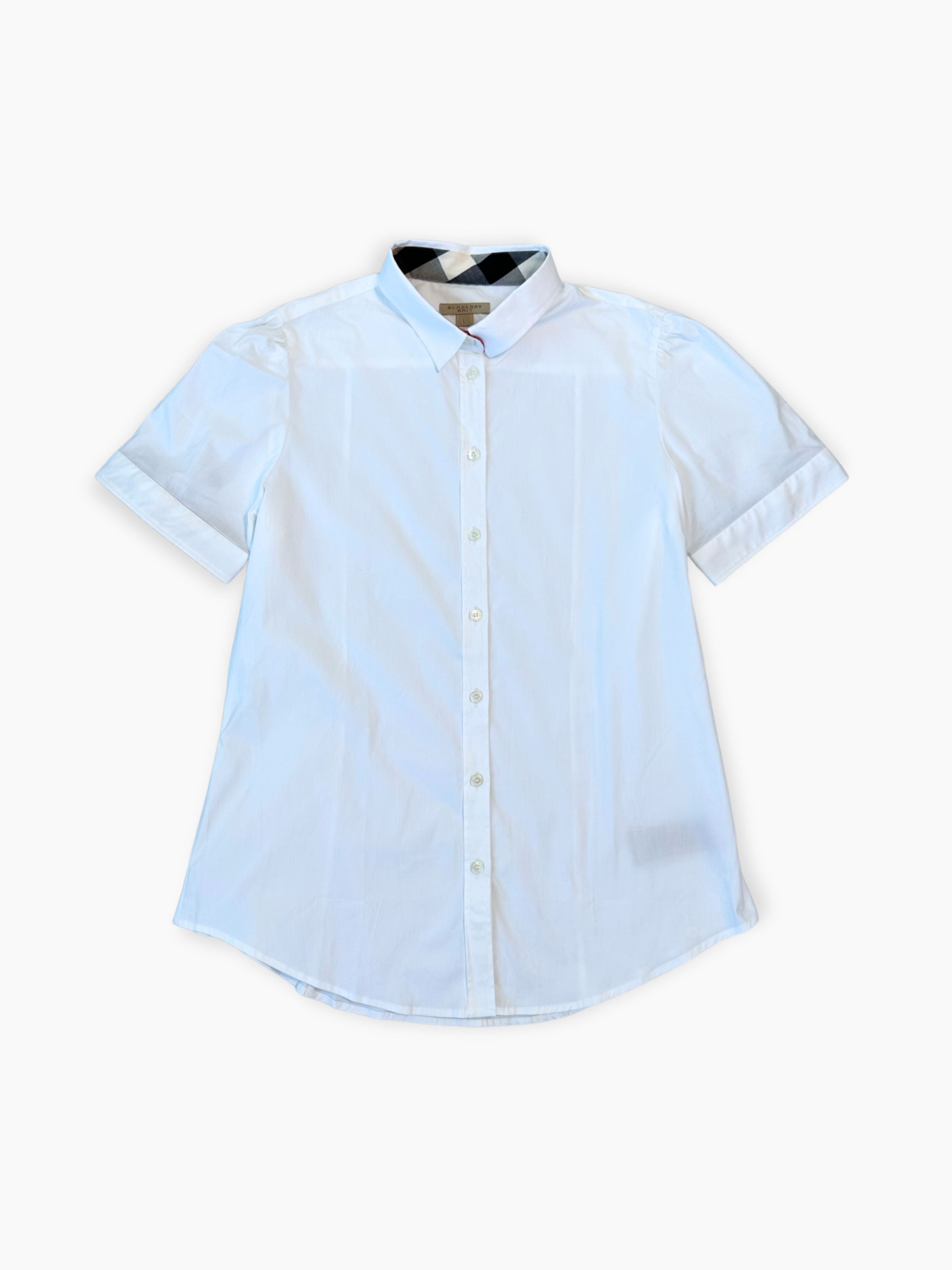 La camicia bianca Burberry in cotone con maniche corte unisce semplicità ed eleganza. Realizzata in tessuto fresco e leggero, è caratterizzata da una linea pulita e versatile. Il colletto con interno in fantasia check aggiunge il tipico tocco iconico del brand. Ideale da indossare sia per look casual raffinati sia sotto un blazer per uno stile più formale.