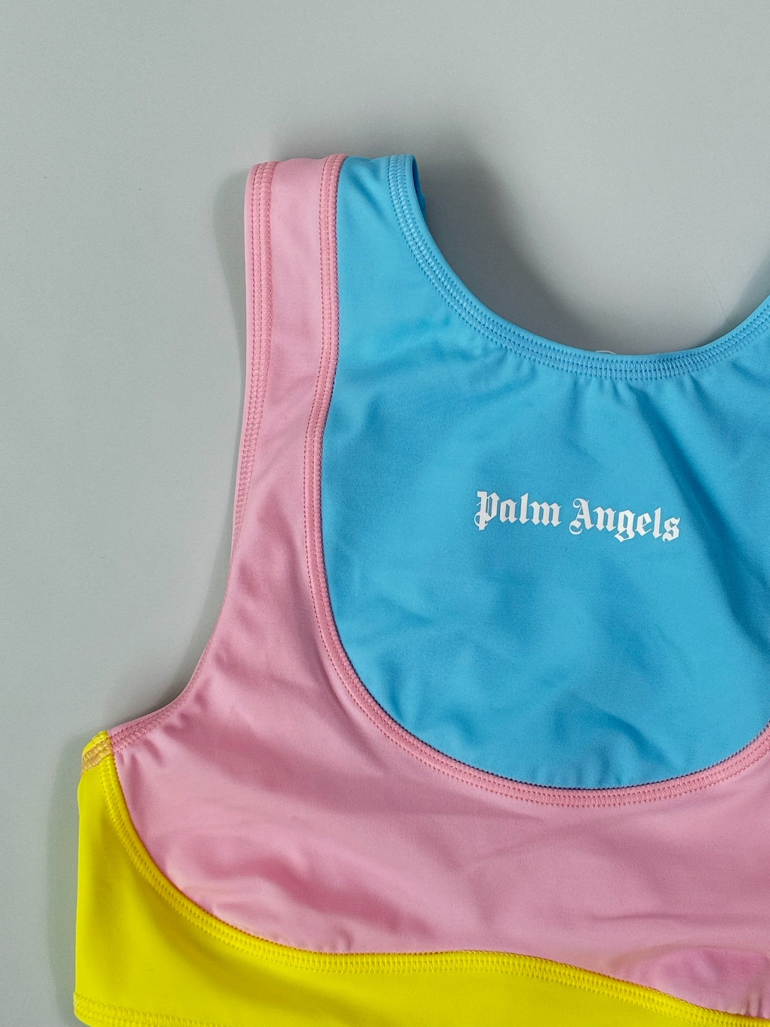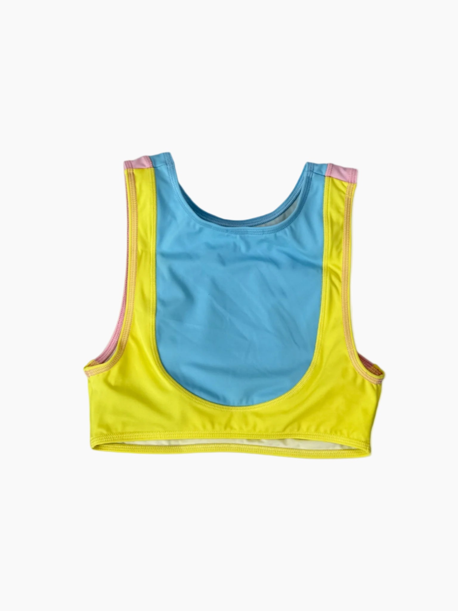 Top sportivo a fascia alta con spalline larghe e design color block nei toni pastello: azzurro, rosa e giallo. Logo bianco stampato sul retro. Un capo vivace e funzionale pensato per lo sport, ma perfetto anche in look streetwear estivi.