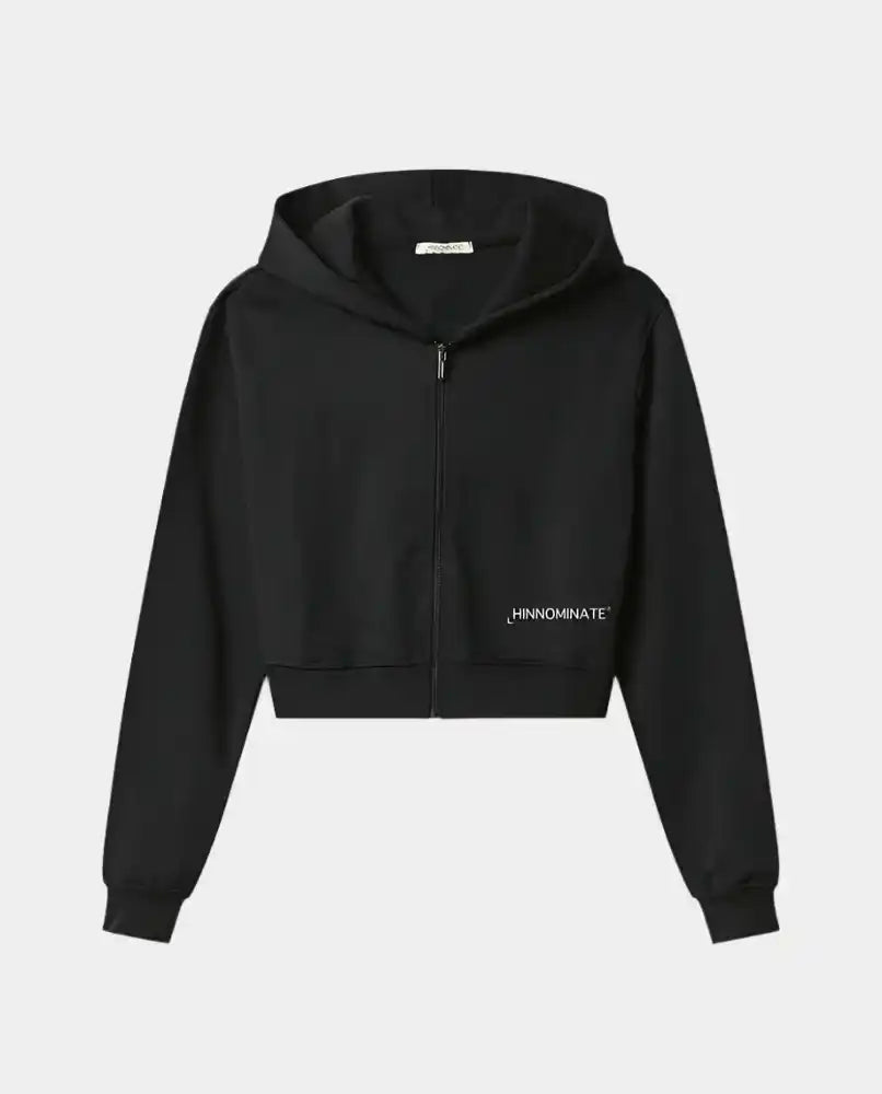 Felpa corta nera Hinnominate con cappuccio e zip frontale, dallo stile contemporaneo e minimal. Perfetta per look casual e sportivi, è realizzata in jersey elasticizzato e rifinita con fondo e polsini a costine. Il logo stampato sul petto aggiunge un tocco distintivo e urbano.