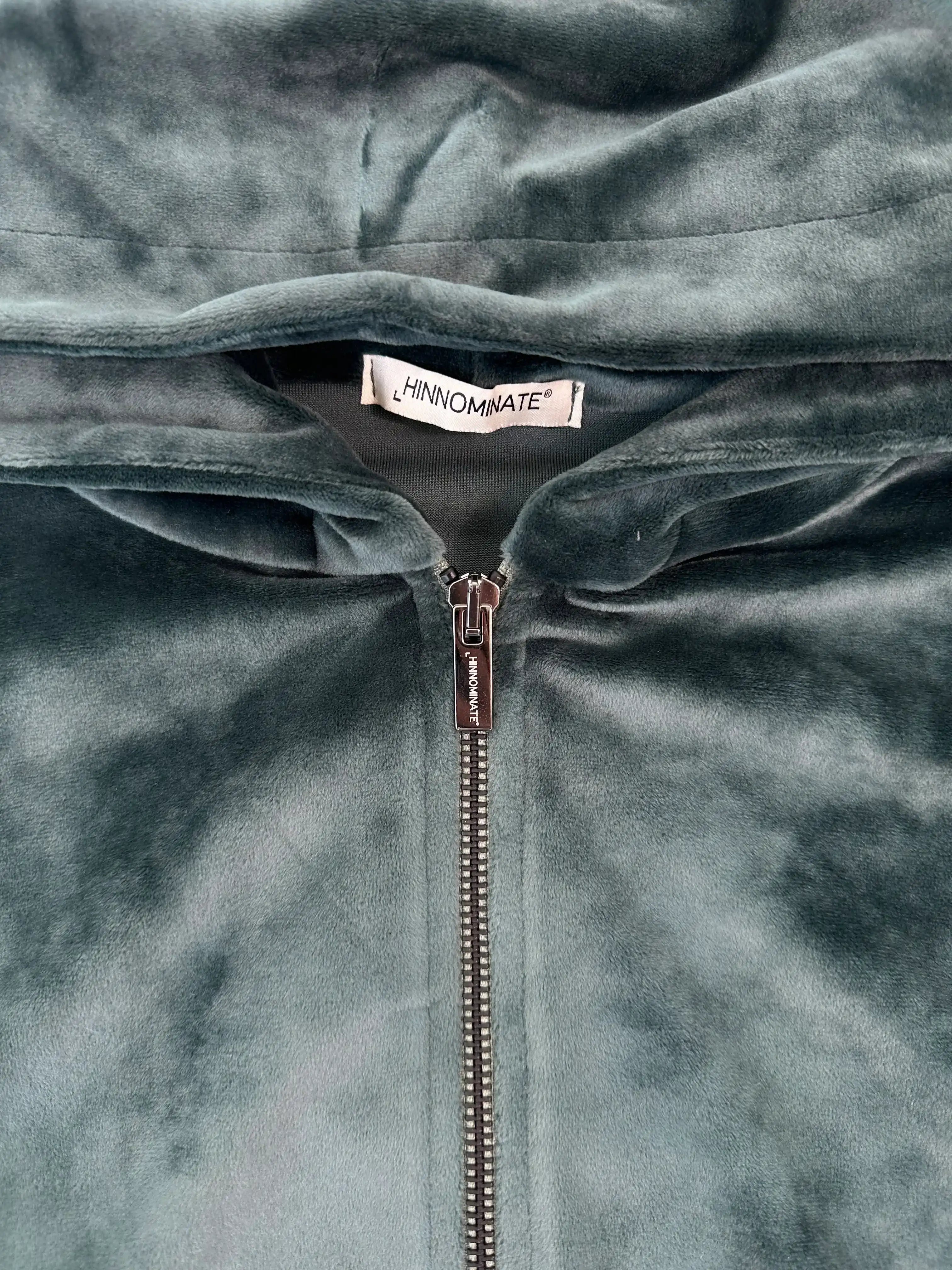 Felpa Hinnominate in morbida ciniglia salvia con zip integrale e cappuccio, dal taglio corto e moderno. Il fondo e i polsini elasticizzati donano comfort e struttura, mentre l’etichetta applicata sulla manica aggiunge un dettaglio distintivo. Ideale per un look casual con un tocco sofisticato.