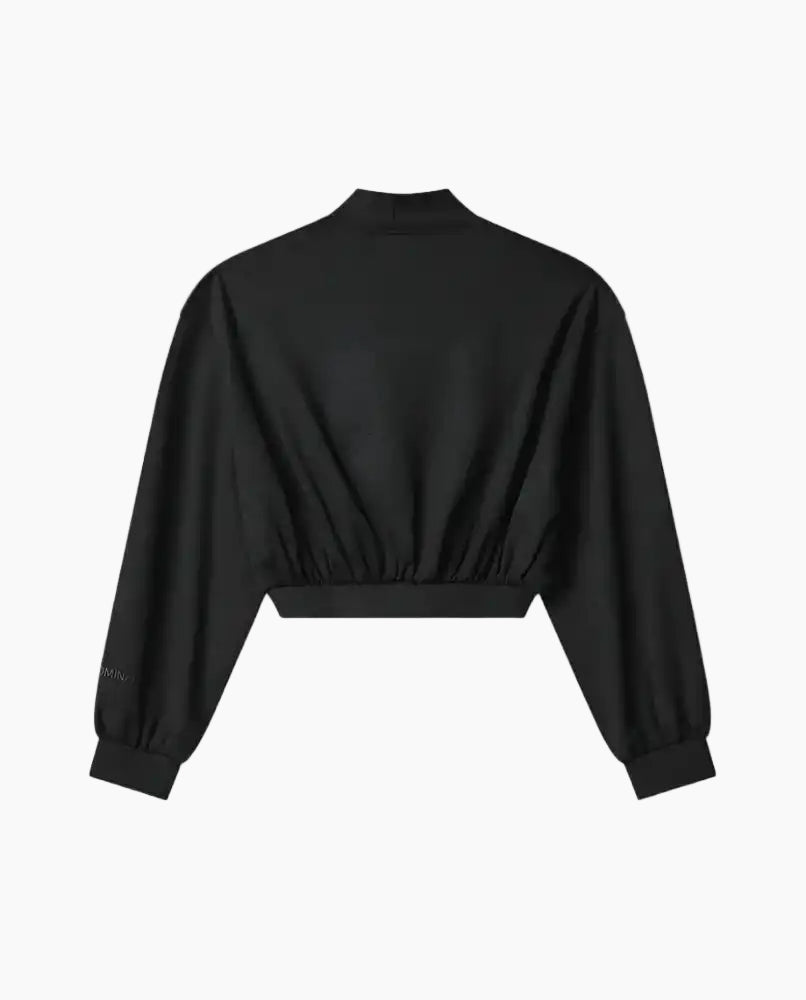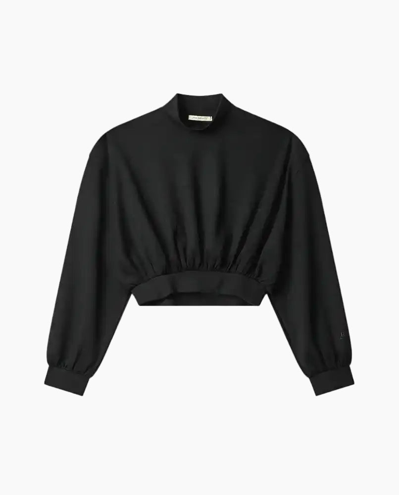 Felpa nera corta Hinnominate in tessuto modal, con collo dolcevita e orlo arricciato che valorizza il punto vita. Il design minimal è impreziosito dalla stampa rigonfiante tono su tono sul polsino, per un look sofisticato e versatile.