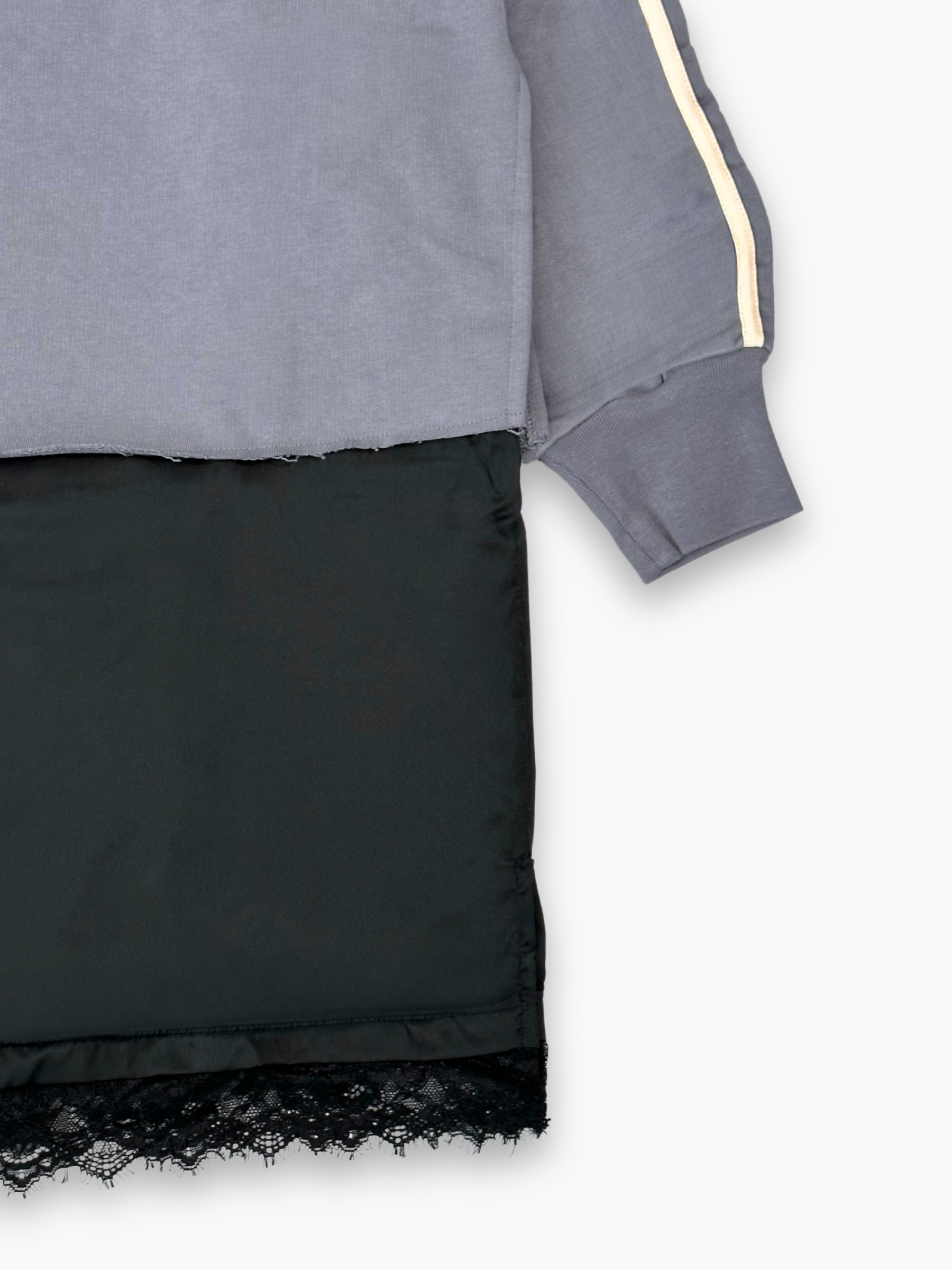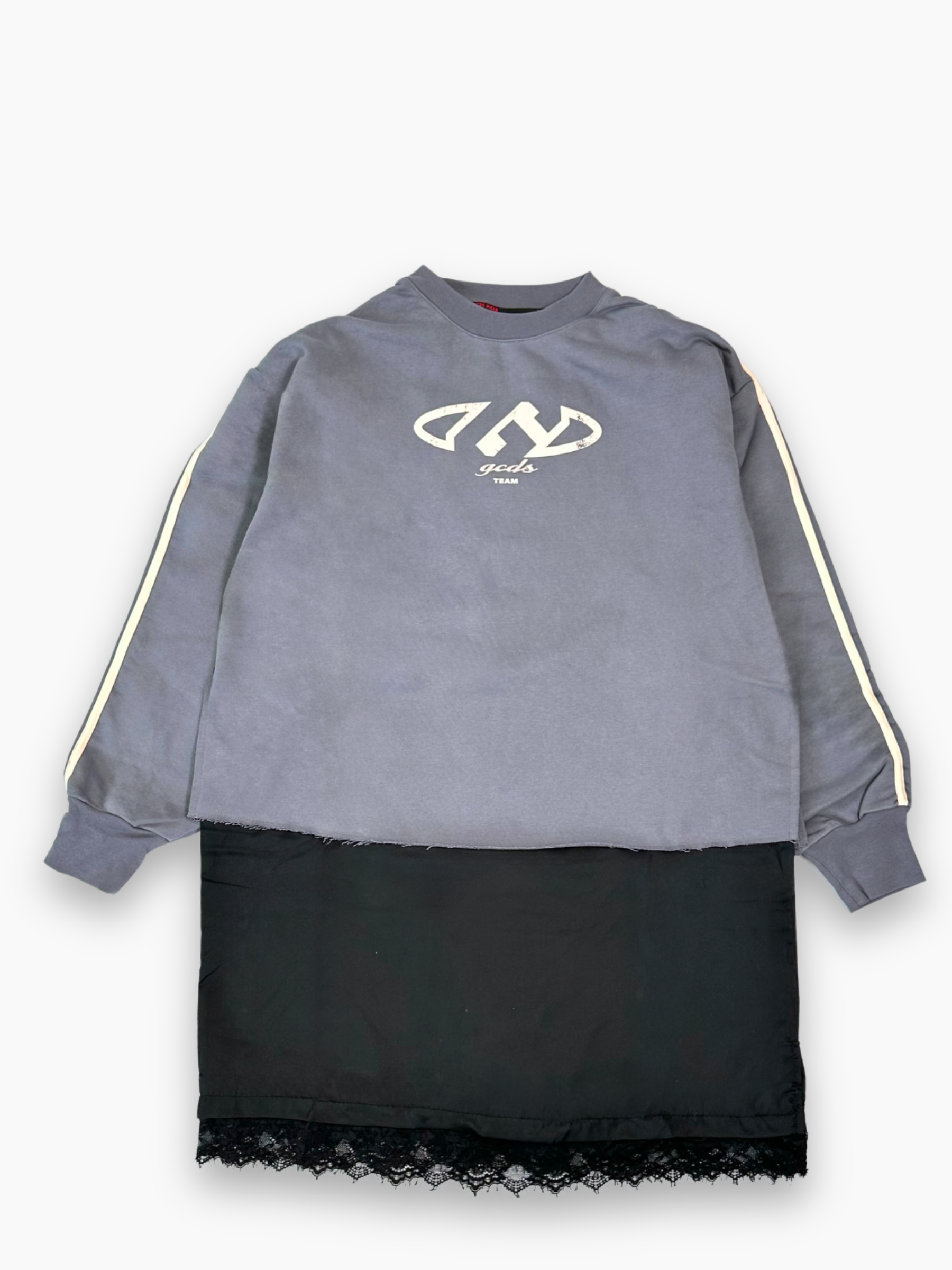 Felpa grigia effetto abito con fondo esteso in tessuto nero e dettaglio in pizzo. Il logo frontale GCDS e le bande a contrasto sulle maniche donano un’estetica sporty-chic unica nel suo genere. Il design ibrido unisce comfort e stile, ideale per look casual ricercati.
