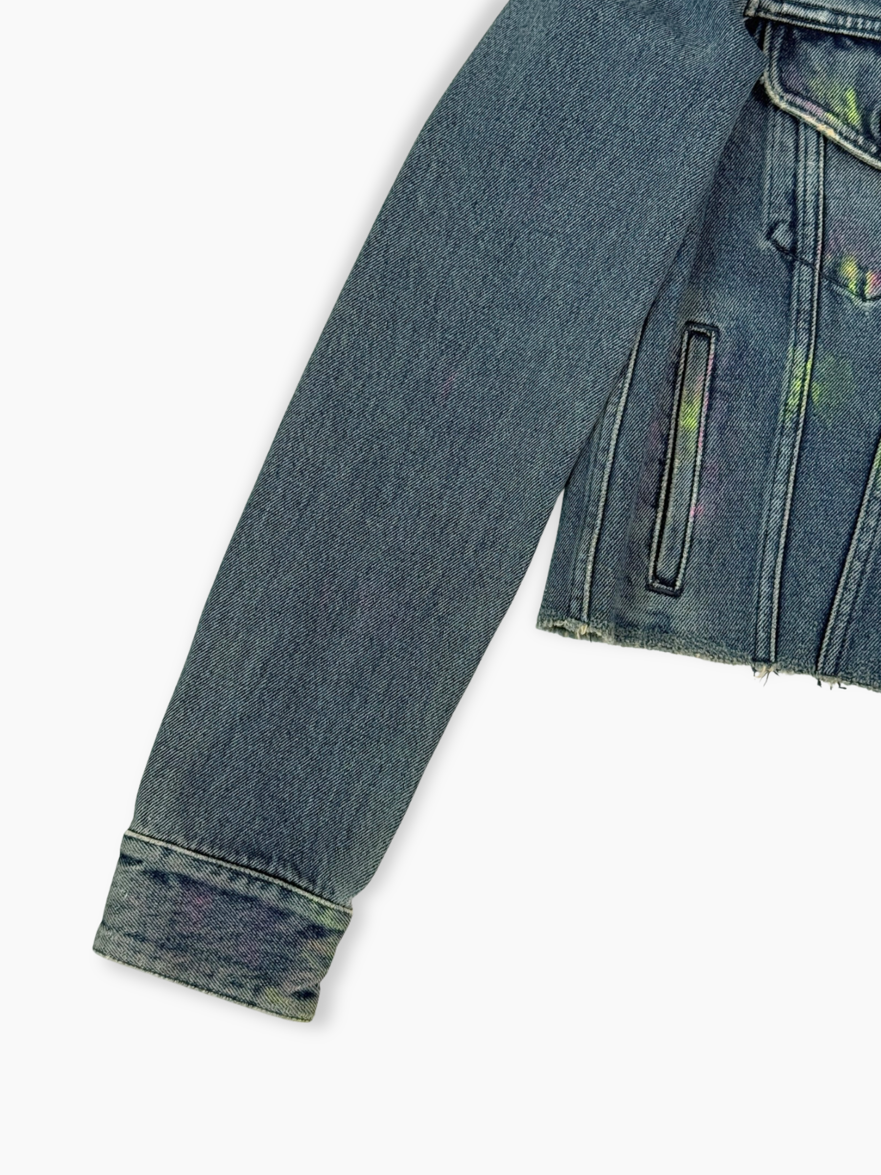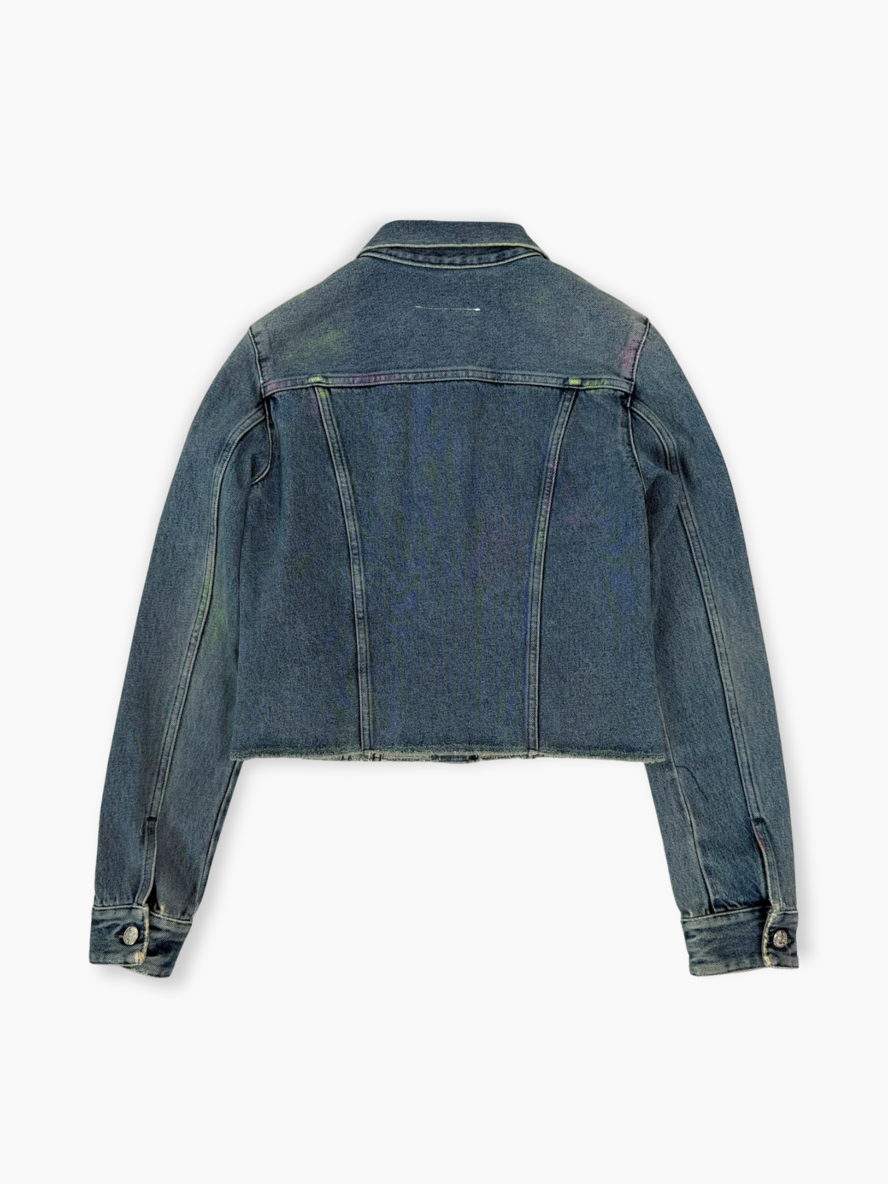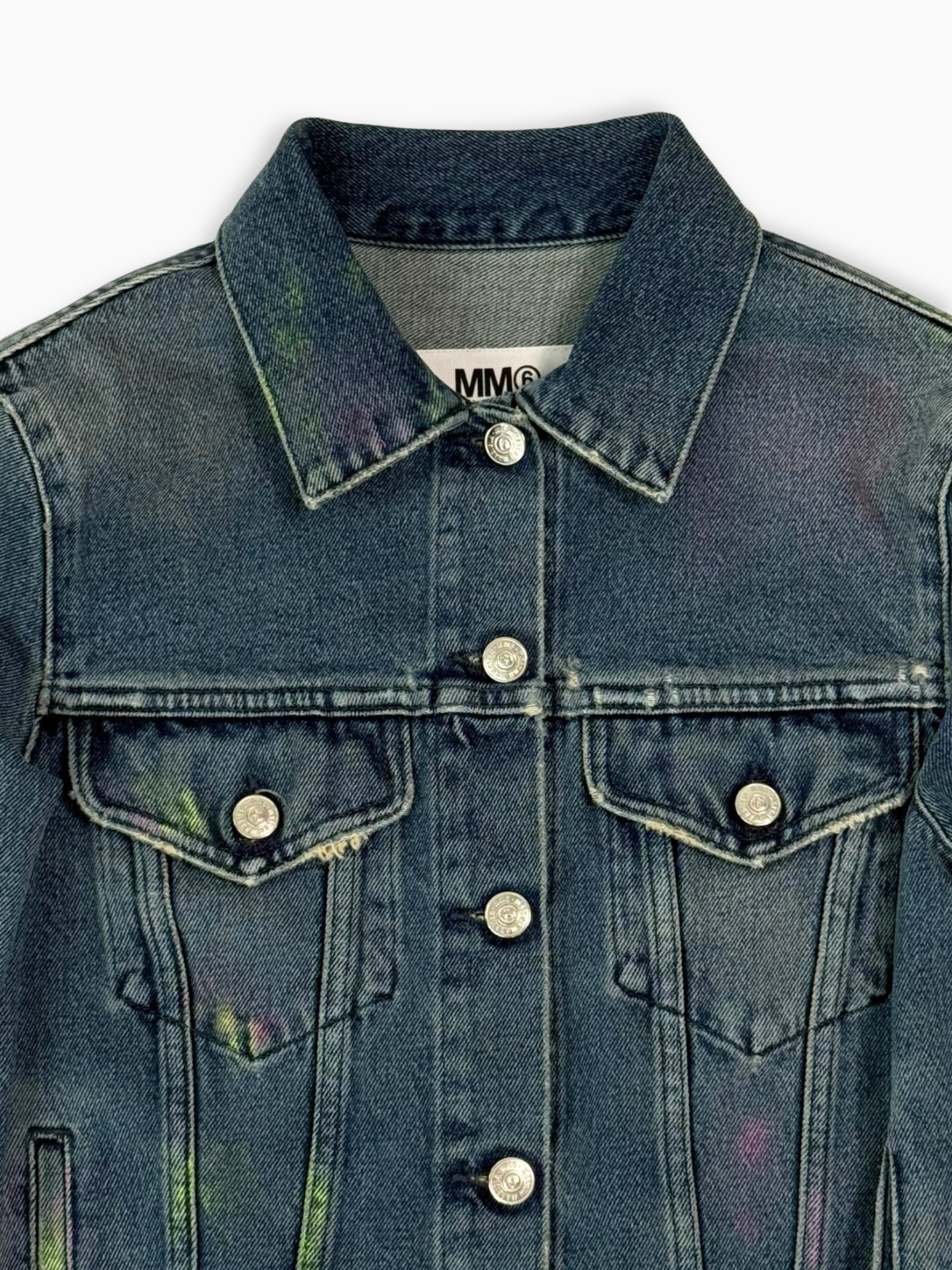 Questa giacca in denim corto MM6 Maison Margiela è un capo iconico e versatile, caratterizzato da un lavaggio blu effetto used con dettagli délavé e leggere sfumature multicolor che donano un tocco contemporaneo. La linea cropped con orlo vivo sfrangiato aggiunge un mood casual e grintoso, perfetto da abbinare a pantaloni a vita alta o gonne dal taglio femminile.