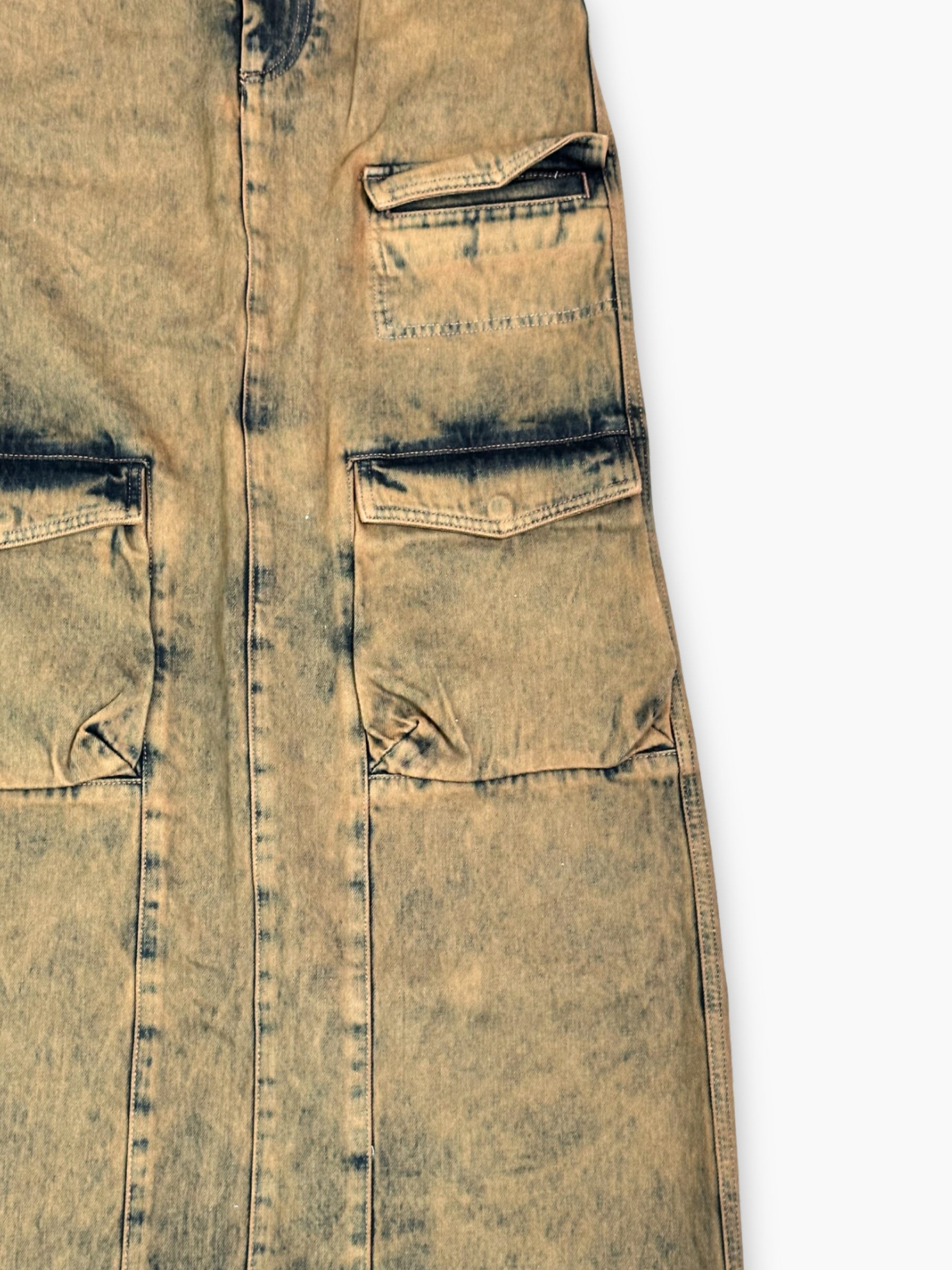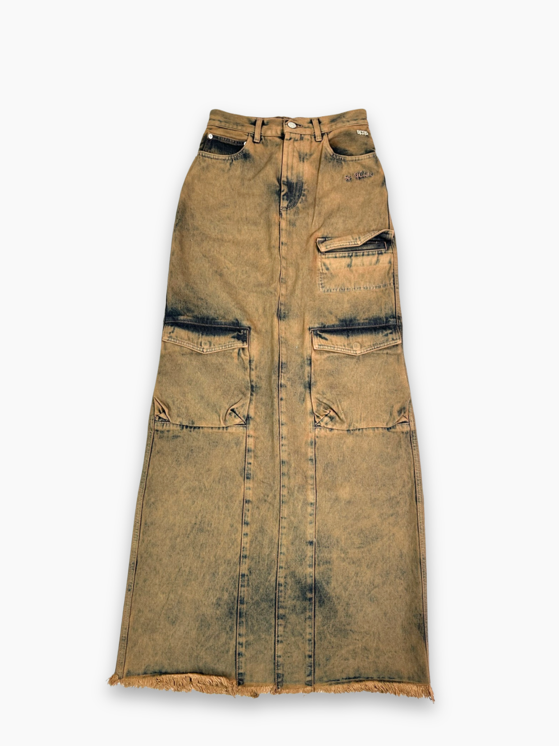 Gonna lunga in denim beige con effetto vissuto e lavaggio sfumato, caratterizzata da maxi tasche cargo frontali che aggiungono un tocco utility moderno. Il fondo sfilacciato dona un look grunge e contemporaneo. La struttura in denim la rende resistente e perfetta per outfit urban dal carattere deciso.
