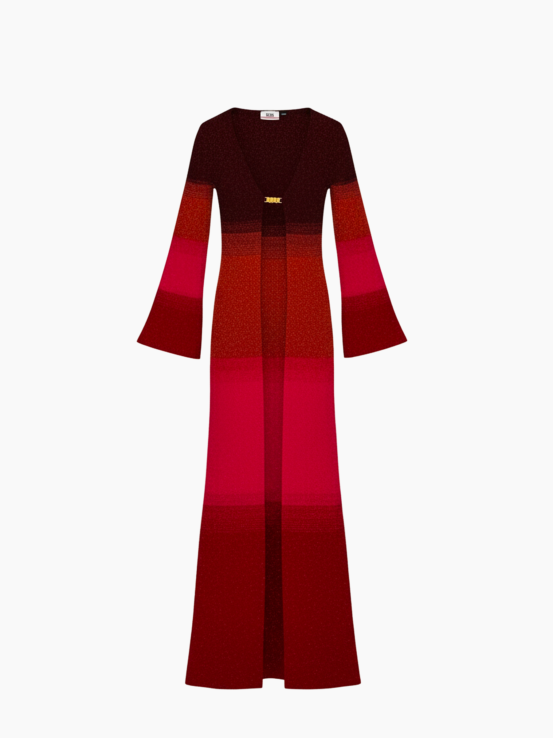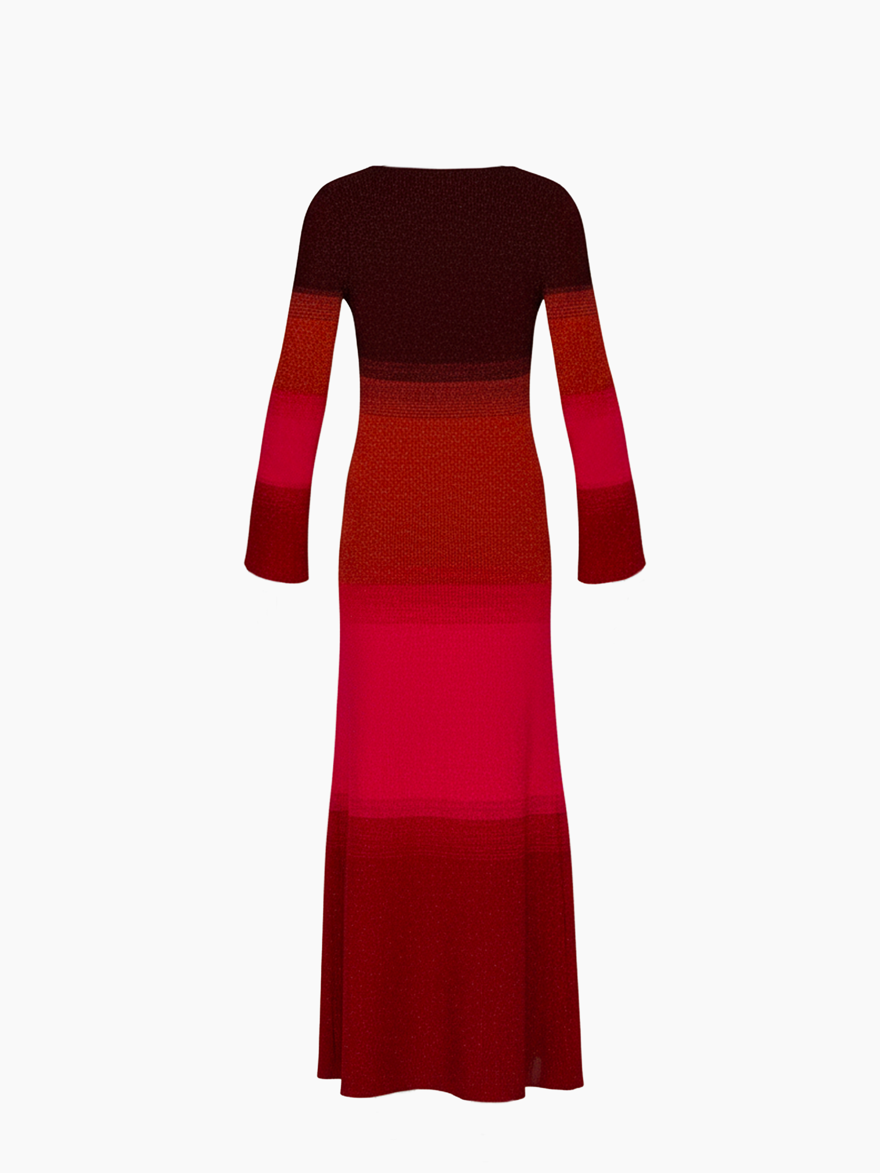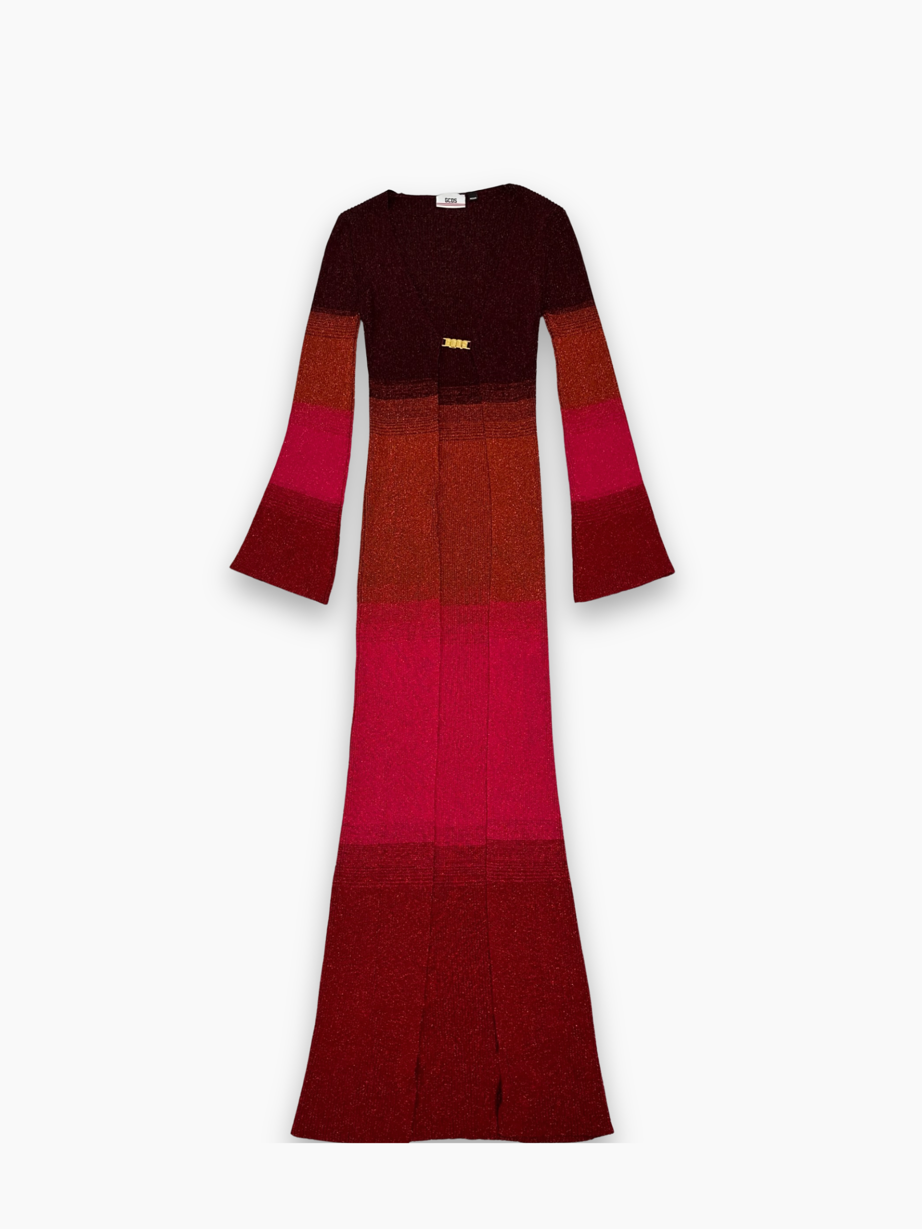 Abito lungo in maglia a maniche lunghe con design sfumato nei toni rosso, arancio e fucsia. Il dettaglio gioiello dorato sul davanti aggiunge un tocco luminoso al look. La vestibilità è aderente nella parte superiore e più morbida e svasata nella parte inferiore, per un effetto elegante e slanciato.