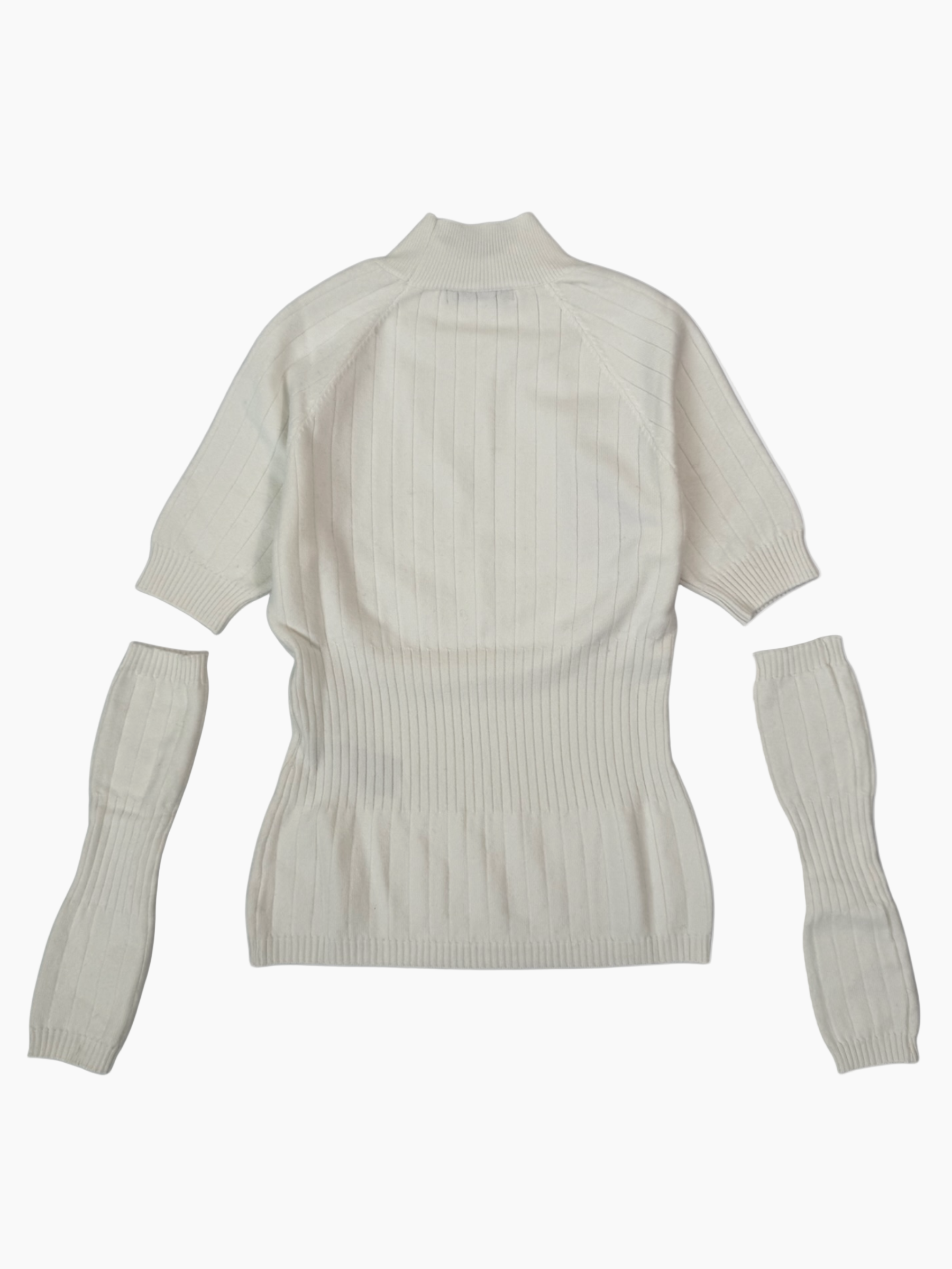 Linee essenziali e costruzione ricercata per questa maglia bianca Hinnominate in costina mossa, che mixa comfort e design. Il fit fasciante è esaltato dalla lavorazione a costine verticali, mentre i manicotti rimovibili aggiungono un tocco di originalità trasformando il capo da manica corta a manica lunga. Il collo alto morbido e la texture stretch completano questo pezzo versatile e stiloso.