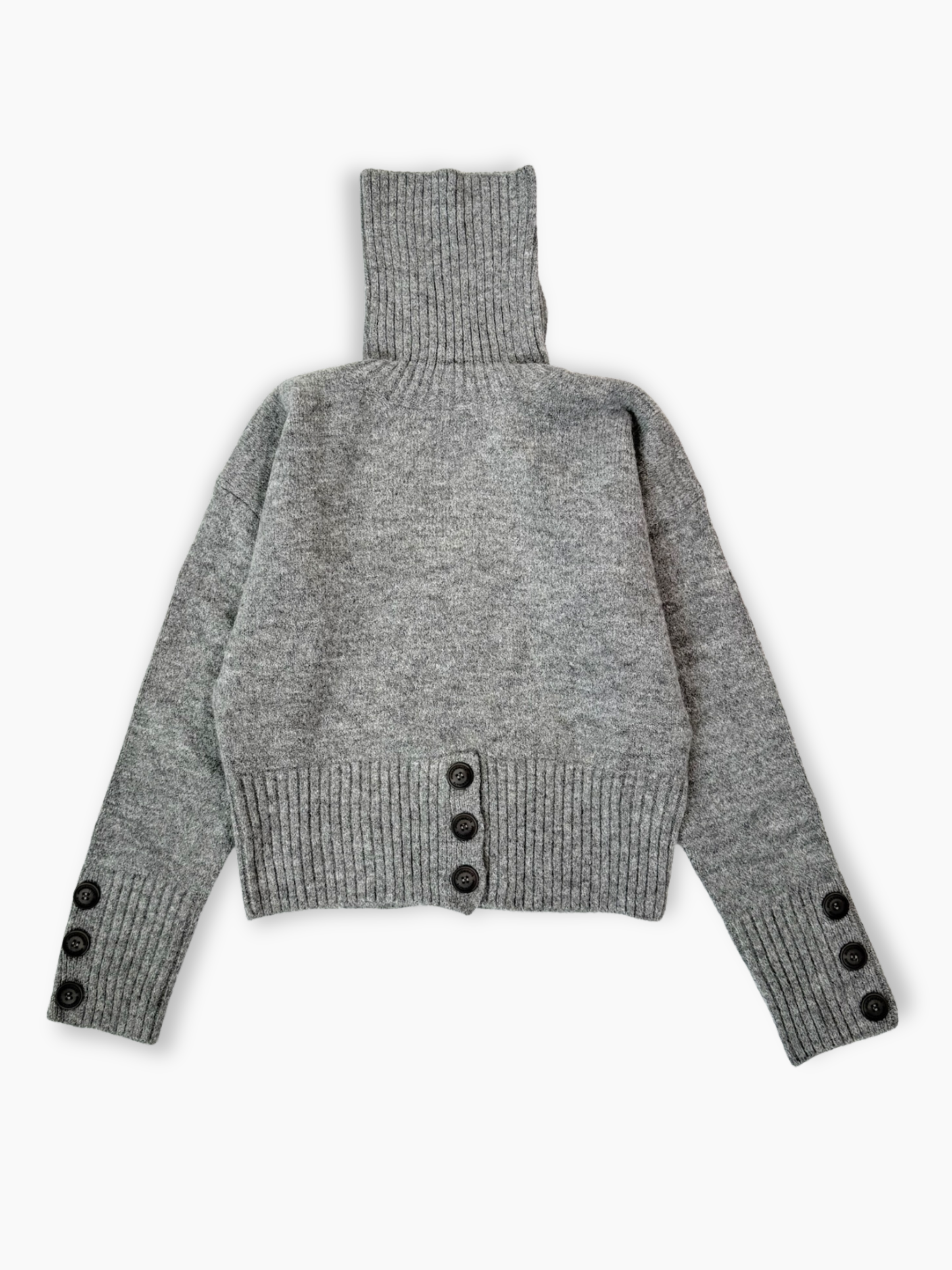 Versatile e sofisticata, questa maglia dolcevita grigia è l’alleata perfetta per le giornate più fredde. Il collo alto in maglia a costine dona struttura, mentre i bottoni su fondo e maniche aggiungono un tocco ricercato al capo.