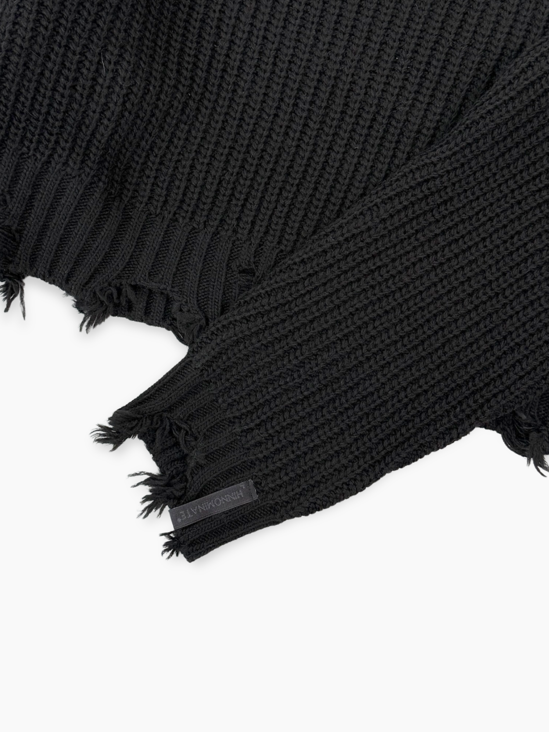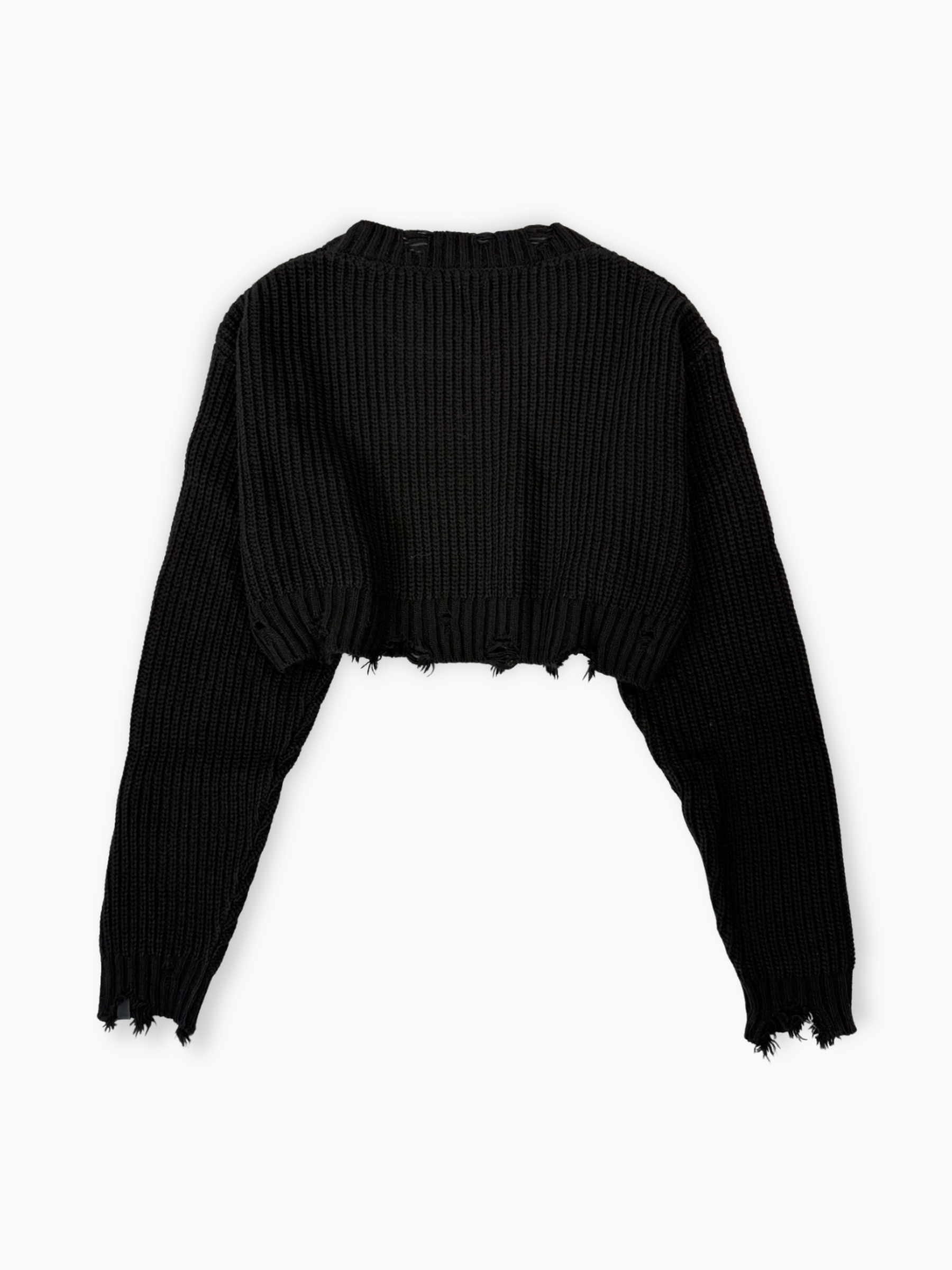 Maglia a maniche lunghe dal design moderno e grintoso, realizzata in maglia nera con dettagli sfrangiati ed effetto destroyed. Il taglio cropped dona un tocco contemporaneo, perfetto per look urban e streetwear dal carattere deciso. Ideale da abbinare a pantaloni a vita alta o gonne per outfit di tendenza.