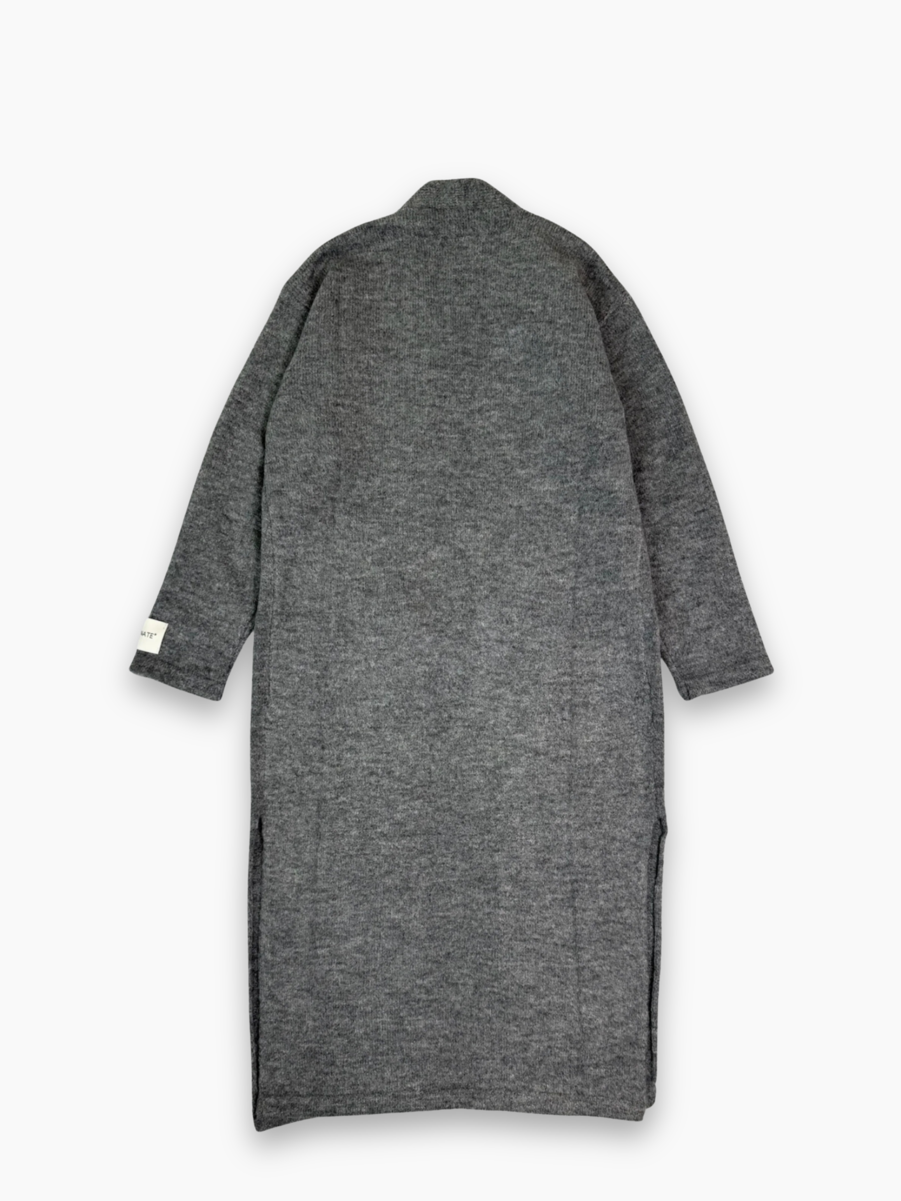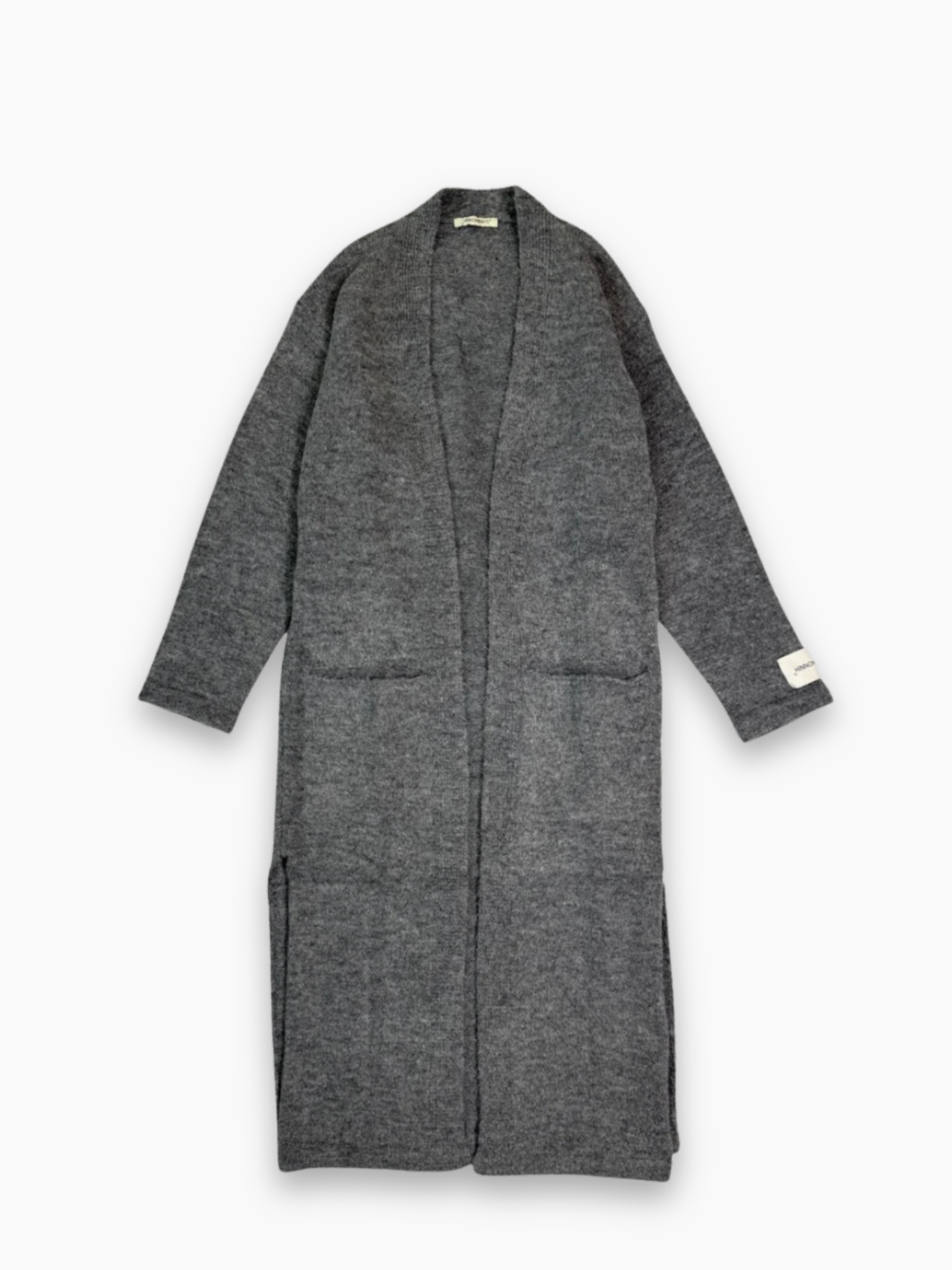 Maglione lungo Hinnominate realizzato in morbida maglia color grigio melange. Il modello aperto con tasche frontali e taglio dritto unisce comfort e versatilità, perfetto da indossare come cardigan sopra top o dolcevita per un look cozy e raffinato.