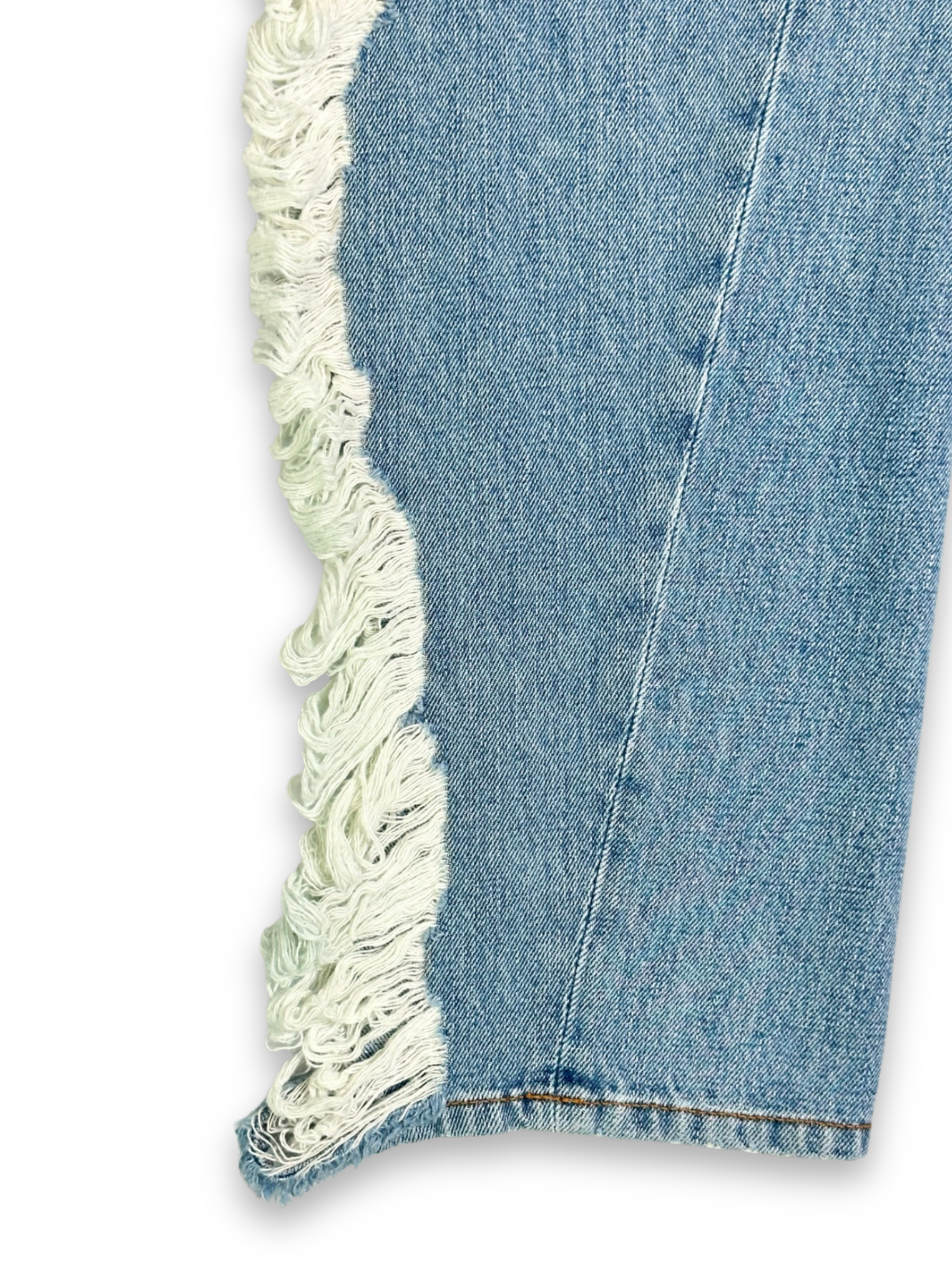 Jeans in denim lavato con iconiche frange laterali tono su tono, effetto sfrangiato a tutta lunghezza. Linea dritta, vita media e costruzione tradizionale a cinque tasche. Un capo statement che unisce estetica street e artigianalità.